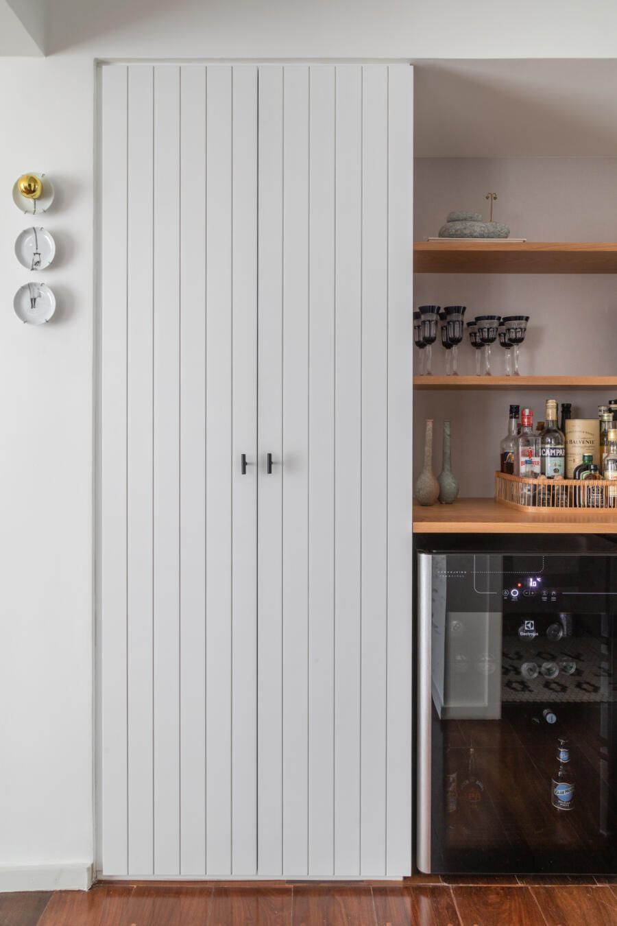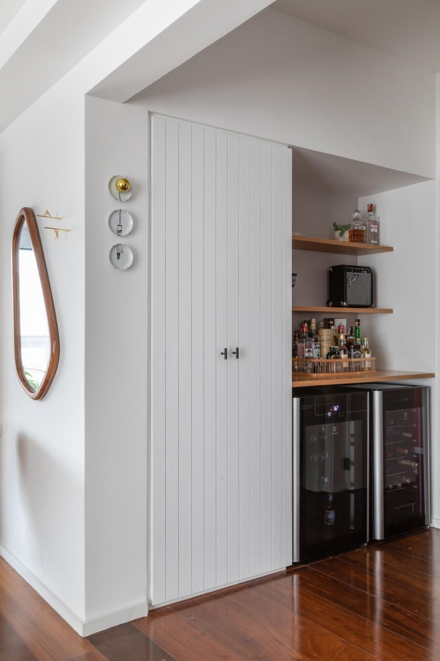 “O desejo principal era um apartamento com dois cômodos para home-office, separados, uma suíte confortável com o banheiro ampliado e dois closets, além da possibilidade de integrar e isolar a cozinha da sala, bar e adega e mais um quarto para visita. Como a suíte contava apenas com um closet, um antigo corredor que ligava a área íntima à cozinha foi fechado e transformado nesse novo ambiente dentro da suíte.”