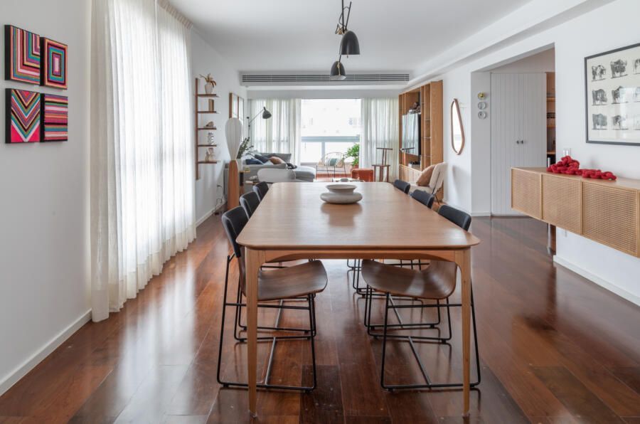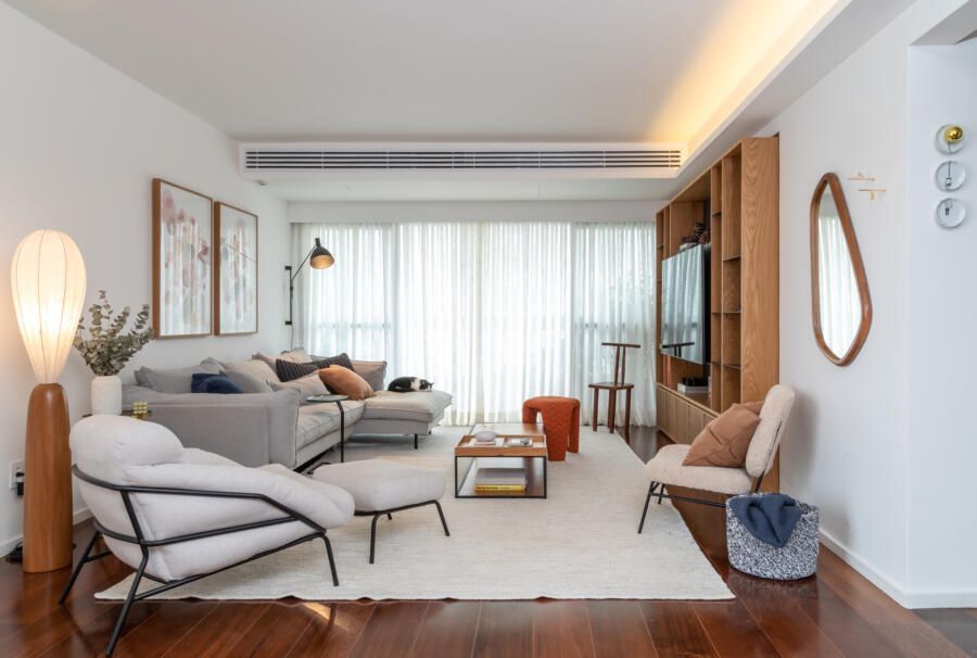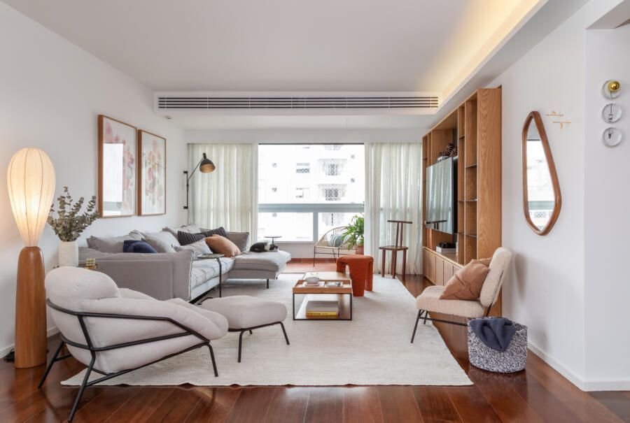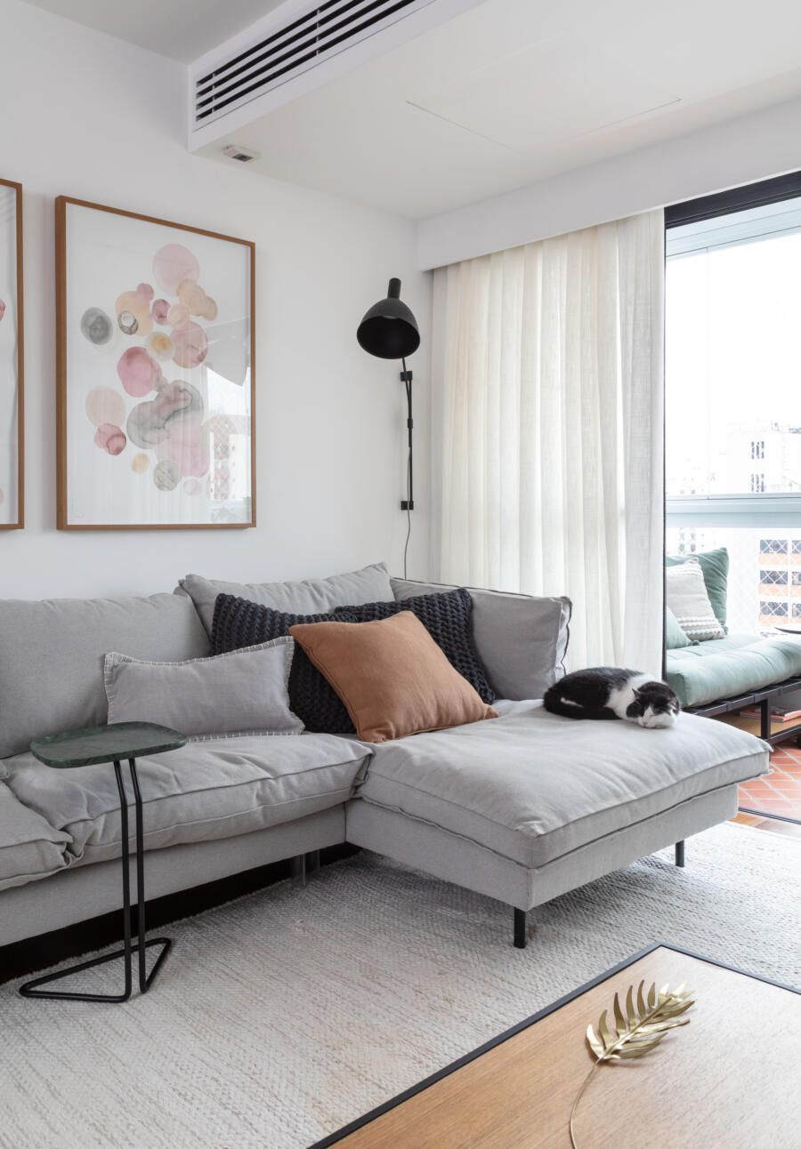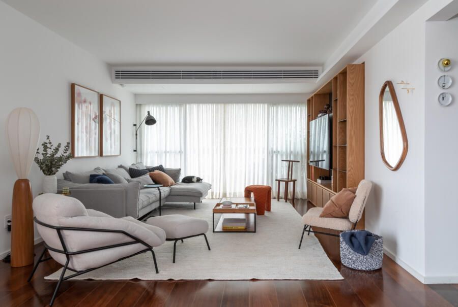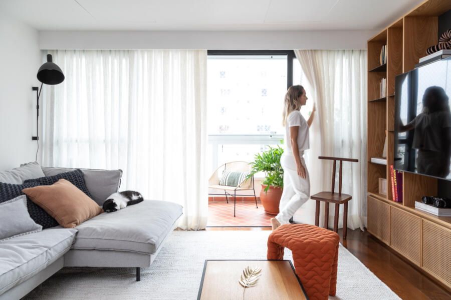 Como todo apartamento que passa por uma grande reforma, algumas dificuldades surgiram no decorrer do projeto. Dentre elas, o Casa33 Arquitetura explica como conseguiu solucionar a implementação do ar-condicionado no apartamento, outro desejo dos clientes.