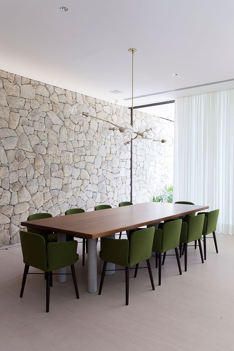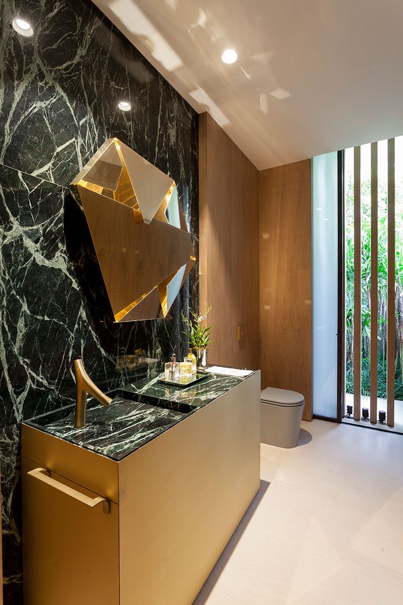 O acolhimento para as suítes e sala íntima do pavimento superior são dados pelos brises em madeira natural e no subsolo ficam as áreas técnicas, serviços e garagem. A área de lazer se concentra no fundo de um terreno da casa onde estão a brinquedoteca, sala de ginástica e sauna. O projeto foi o 1º colocado no Concurso Abilux 2017, na categoria residências.