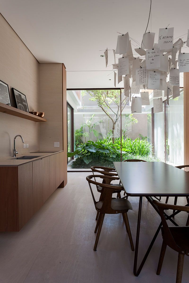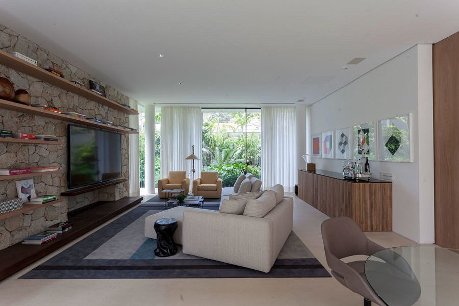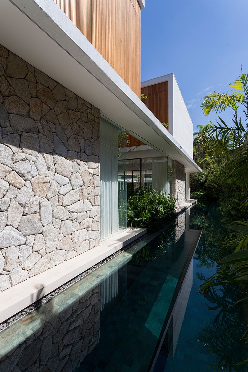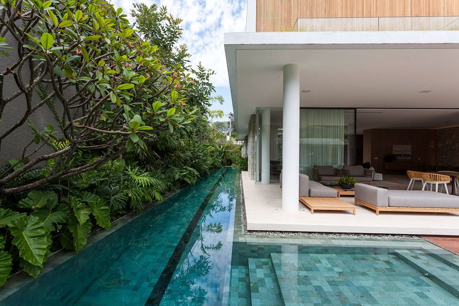 Criada para abrigar um casal jovem e seus dois filhos, a casa com 1.300 m² e assinada pelo escritório BZP Arquitetura, foi projetada para integrar o jardim com toda a área social através da utilização de grandes esquadrias deslizantes em alumínio e vidro que permitem transparência, abertura total dos ambientes e a invasão do verde jardim tropical.