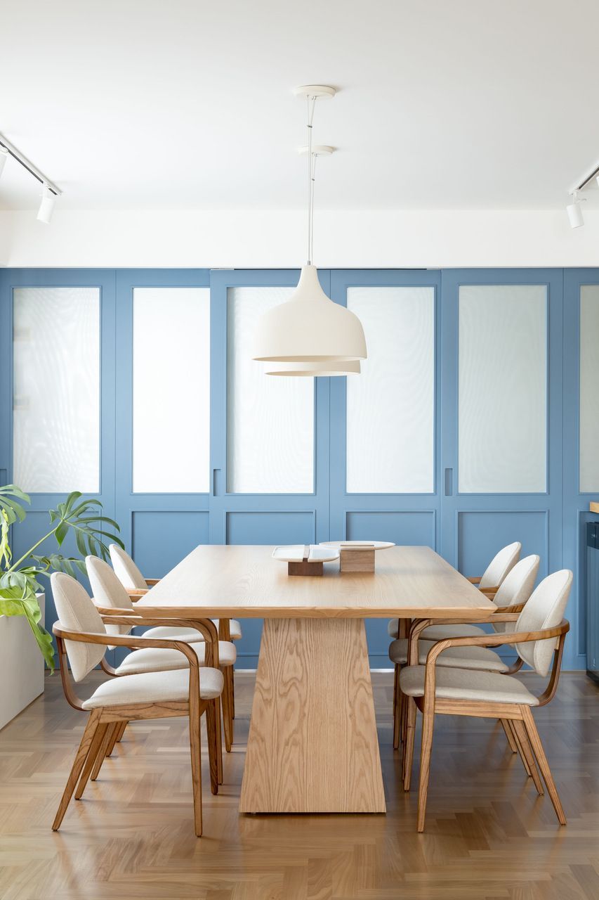 Com a reforma, que durou 10 meses, a cozinha foi ampliada e integrada à sala através de uma marcenaria com portas de correr, em laca azul. Como a planta baixa já era circular e muito bem resolvida, com ambientes amplos, as alterações foram apenas pontuais.