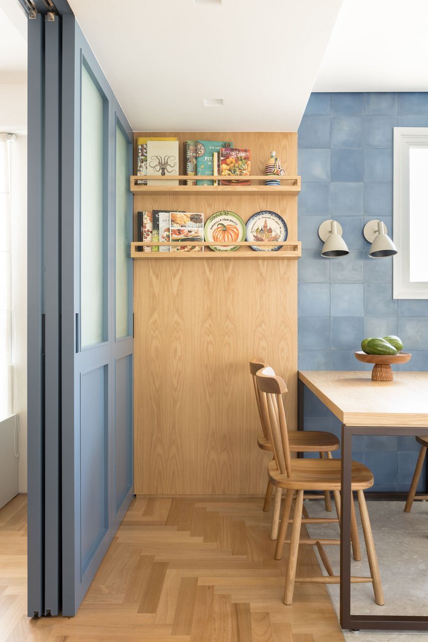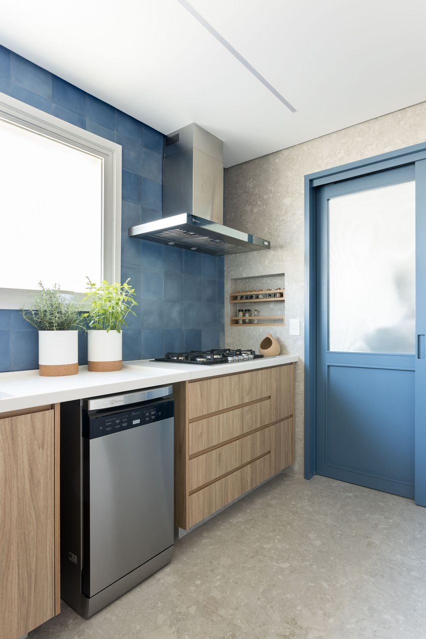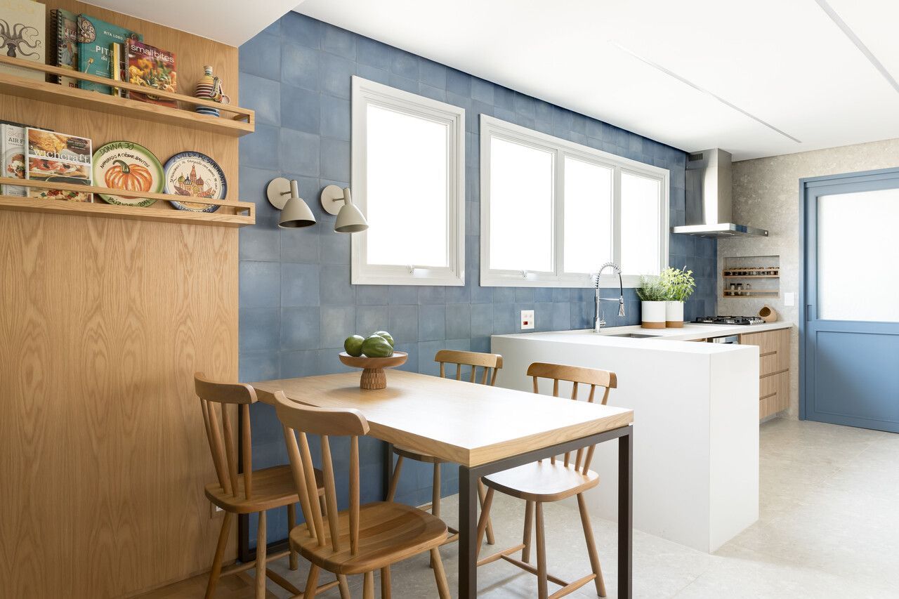 Na cozinha integrada à sala, a cliente queria tons de azul. Para fugir do óbvio, as arquitetas usaram diferentes revestimentos nas paredes, variando não só o tamanho das peças como também as cores, entre tons de azul, cinza e terracota. Os armários superiores foram projetados com portas de correr em vidro canelado para deixar o ambiente visualmente mais leve.