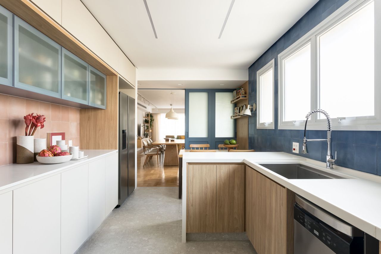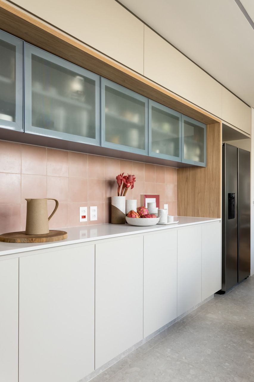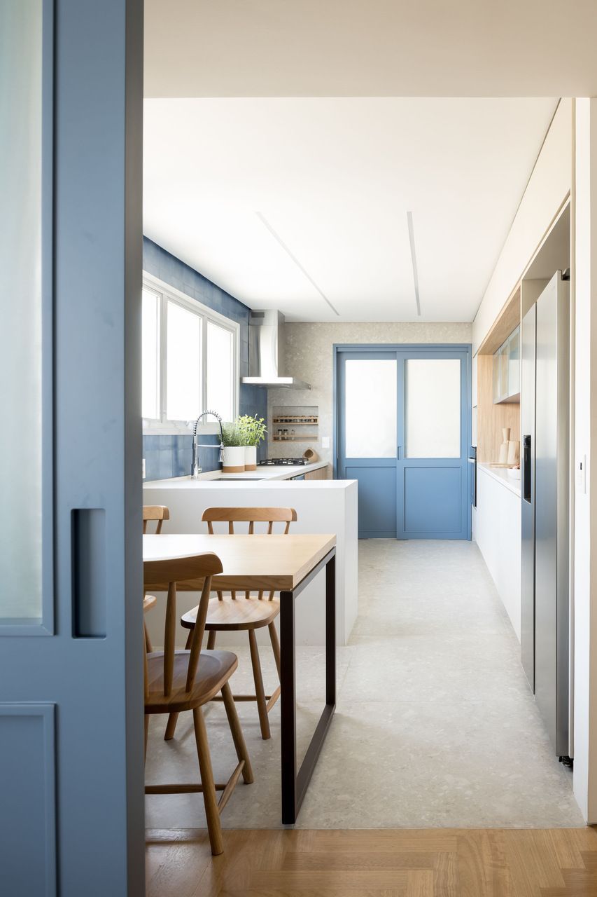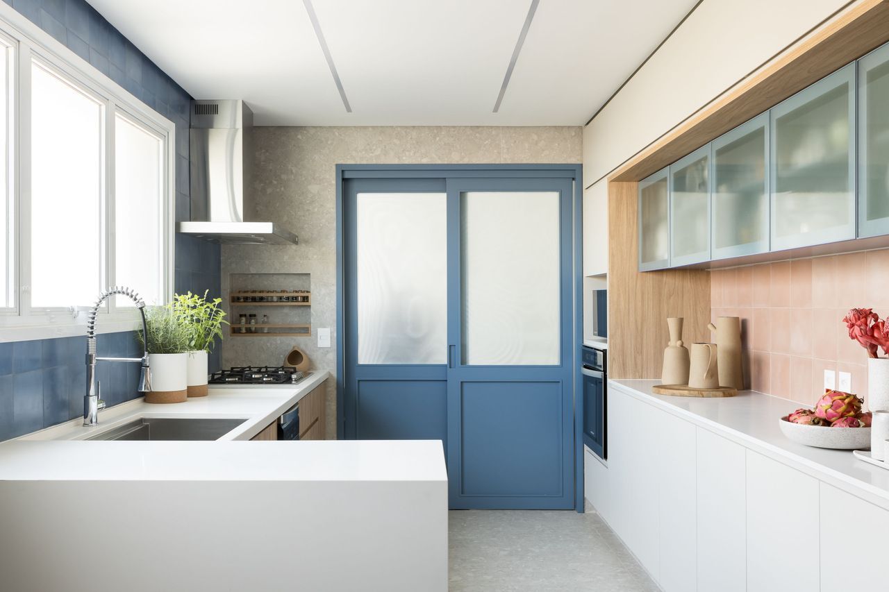 Na cozinha integrada à sala, a cliente queria tons de azul. Para fugir do óbvio, as arquitetas usaram diferentes revestimentos nas paredes, variando não só o tamanho das peças como também as cores, entre tons de azul, cinza e terracota. Os armários superiores foram projetados com portas de correr em vidro canelado para deixar o ambiente visualmente mais leve.
