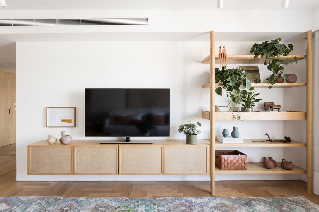 A madeira clara, Carvalho Natural, usada no piso em taco e no acabamento da marcenaria das estantes e dos painéis contrastou com a materialidade das paredes, que receberam textura cimentícia em tom bem claro, resultando em uma atmosfera aconchegante, perfeita para abrigar o mobiliário de design moderno, com decoração despojada.