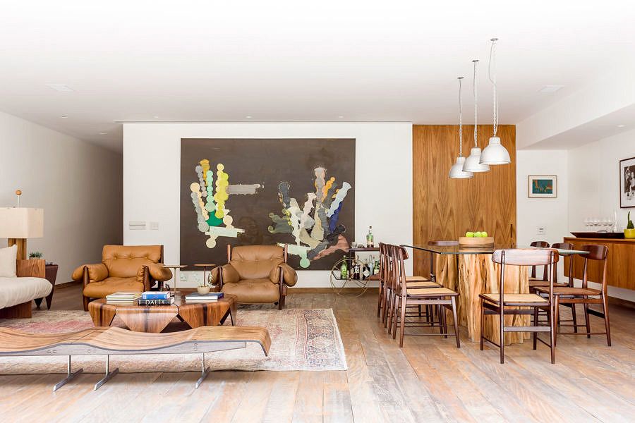 Foram utilizados materiais quentes que trazem aconchego para o espaço, como no mobiliário, que tem peças brasileiras dos anos 50/60, combinadas à arquitetura contemporânea da casa. A sala de estar, por exemplo, possui o piso em madeira de demolição rústica e é decorada com diversos exemplares originais de designers brasileiros, como Jorge Zalszupin e Sergio Rodrigues.