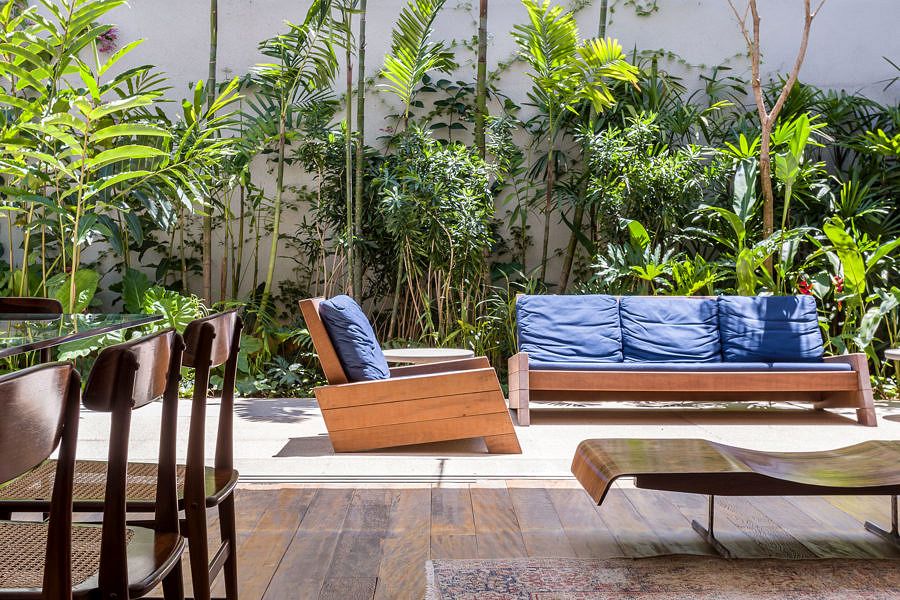 Para mais conforto, maximizamos a captação de luz natural, ventilação e o contato com o exterior em todos os ambientes, que ora se abrem para a rua na altura da copa das árvores, ora se abrem para uma área externa com um jardim tropical.
