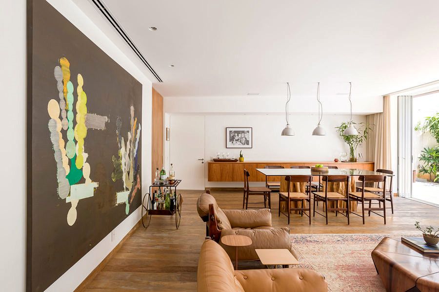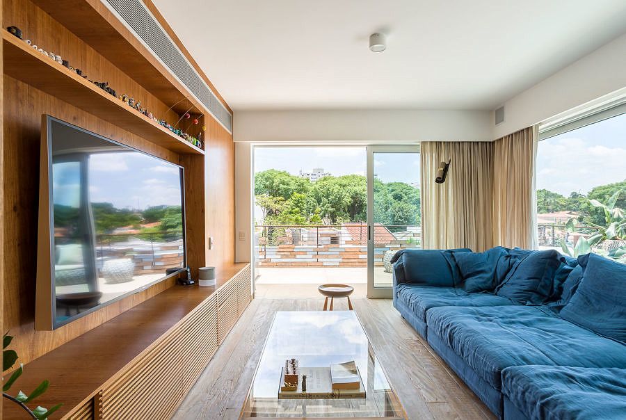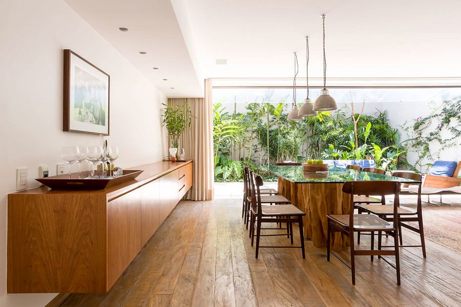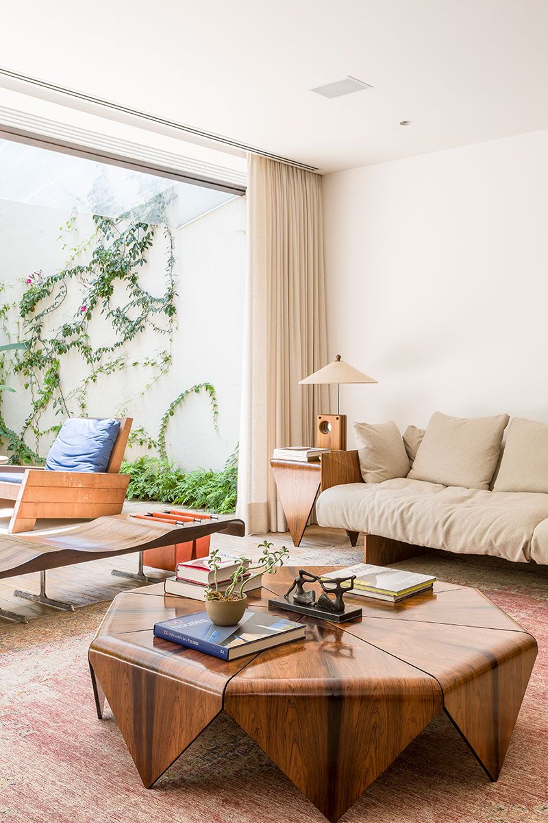 Foram utilizados materiais quentes que trazem aconchego para o espaço, como no mobiliário, que tem peças brasileiras dos anos 50/60, combinadas à arquitetura contemporânea da casa. A sala de estar, por exemplo, possui o piso em madeira de demolição rústica e é decorada com diversos exemplares originais de designers brasileiros, como Jorge Zalszupin e Sergio Rodrigues.