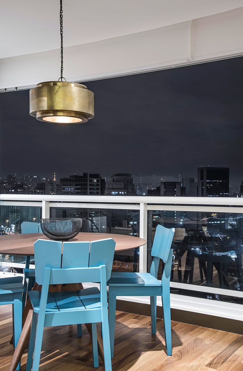 Para unir sala e varanda, os profissionais optaram pelo fechamento em vidro da fachada, dando ao loft uma “vitrine” de 12 metros para a vista de São Paulo. Além do skyline, o recurso permitiu a entrada de iluminação natural em abundância, dispensando o uso de luz artificial praticamente durante todo o dia.