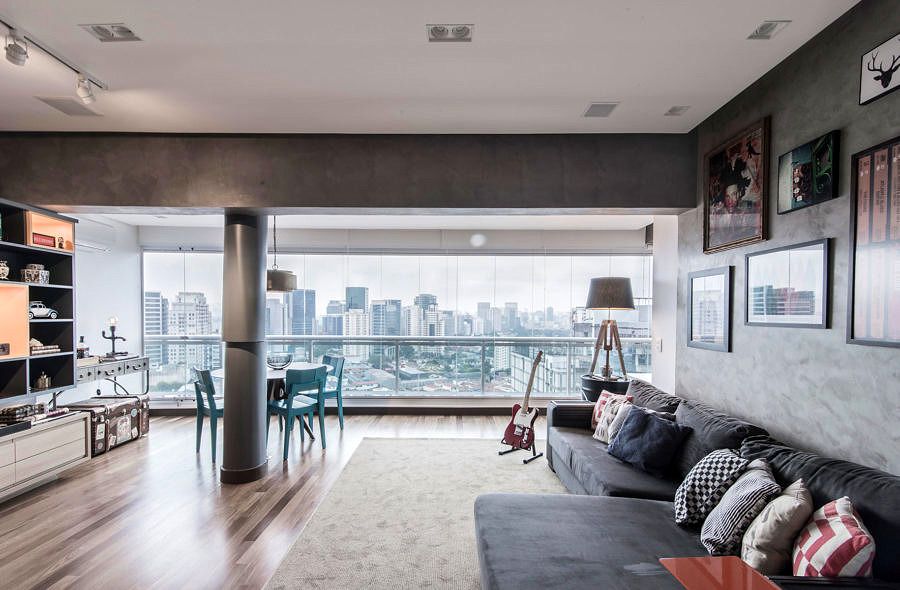 Para unir sala e varanda, os profissionais optaram pelo fechamento em vidro da fachada, dando ao loft uma “vitrine” de 12 metros para a vista de São Paulo. Além do skyline, o recurso permitiu a entrada de iluminação natural em abundância, dispensando o uso de luz artificial praticamente durante todo o dia.