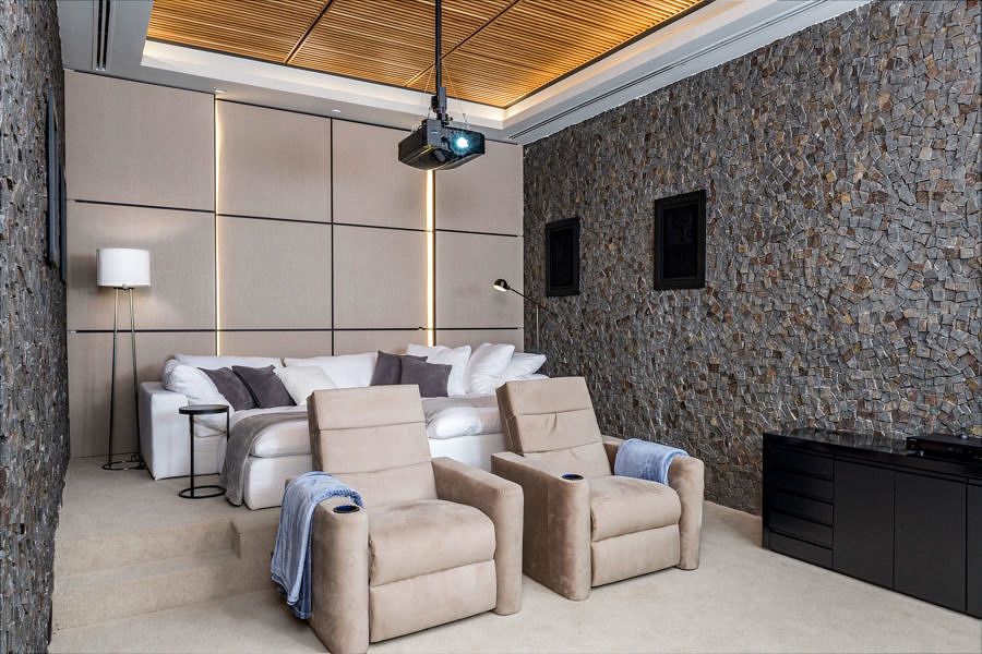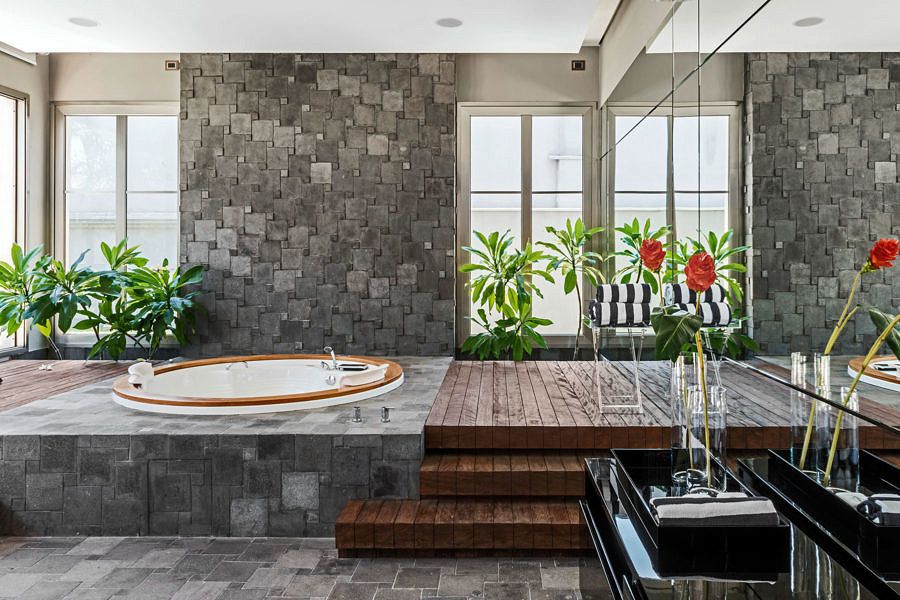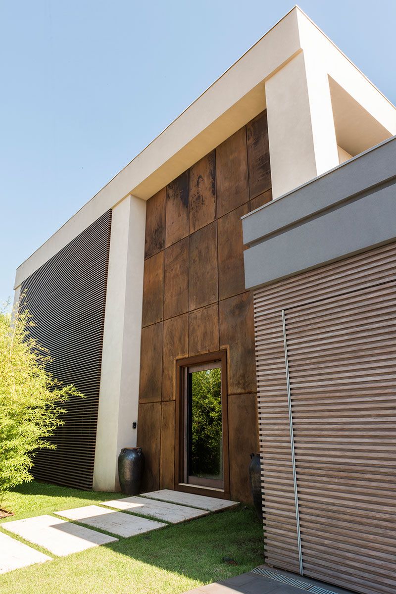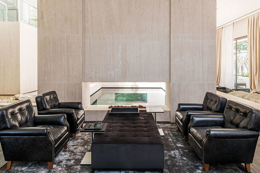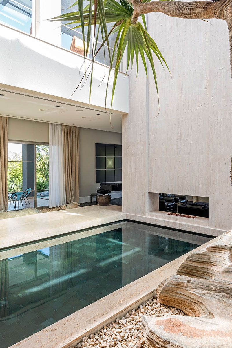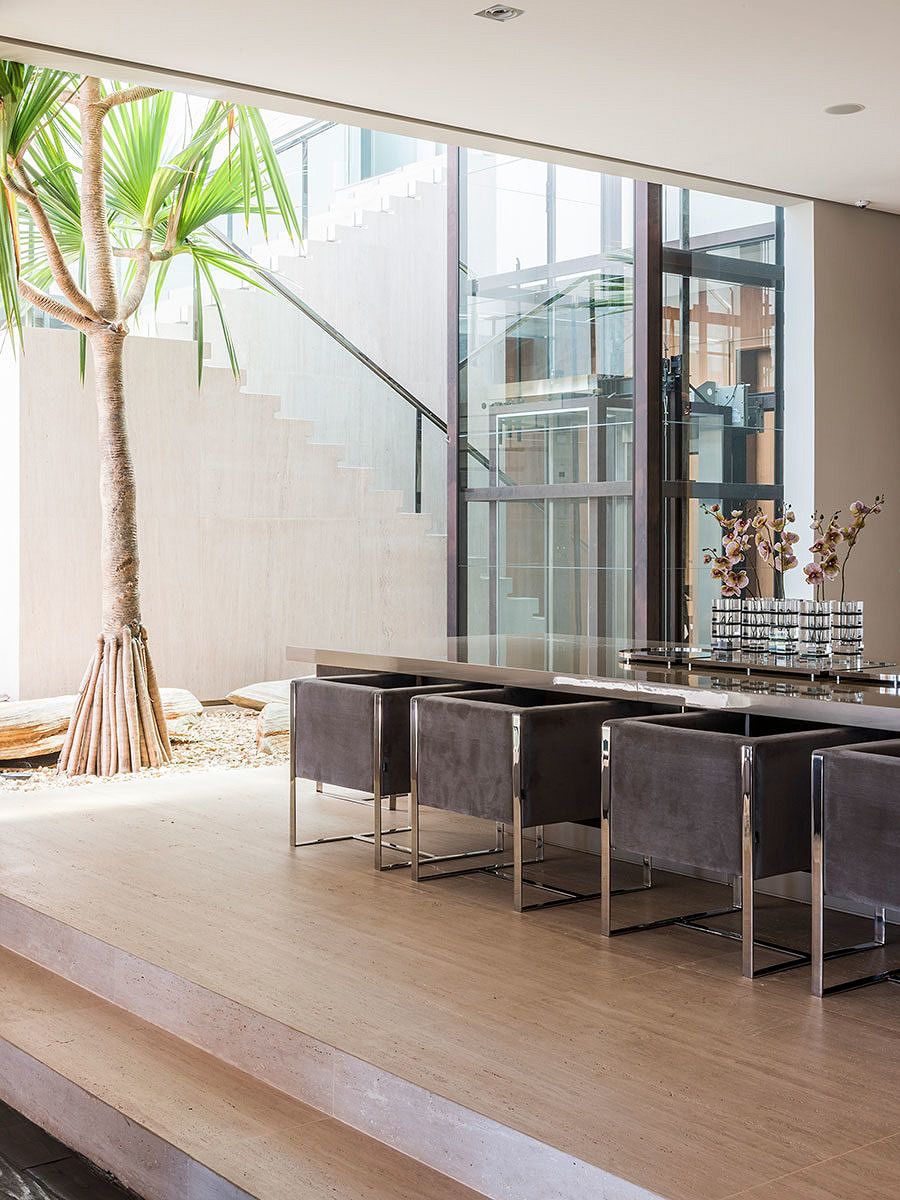 A escada foi toda revestida em travertino romano bruto, ela é uma escultura, um bloco de pedra todo recortado com iluminação e vidro. E a caixa do elevador foi toda feita em estrutura aparente em aço corten e vidro. Esses dois elementos estão bem no meio da casa, com teto retrátil, que permite a visualização do céu quando se abre, e que têm a função de levar os moradores ao segundo andar.