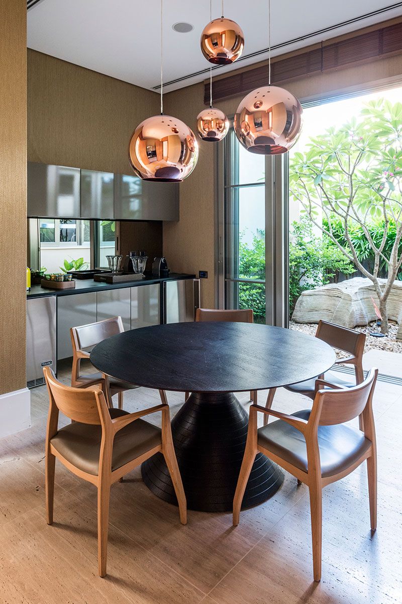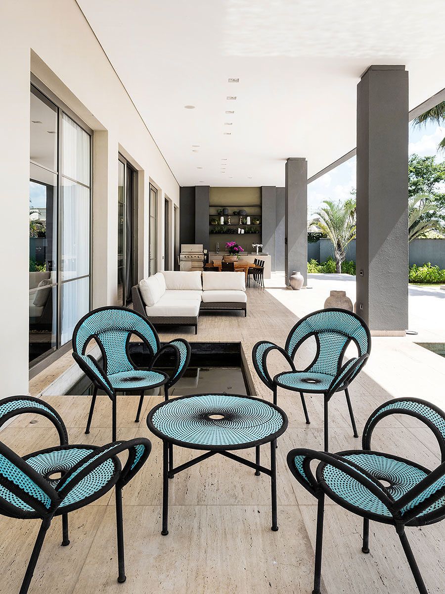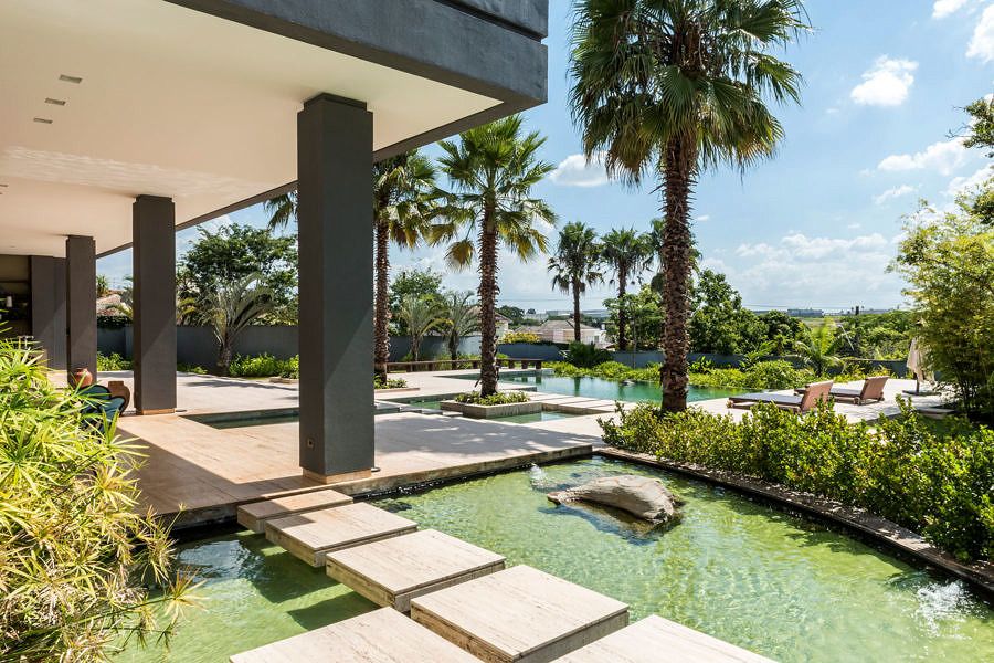 O terreno de 2.200 m² é em declive, esse foi o principal desafio do escritório. A parte mais alta é o fundo do terreno, por onde foi instalada a entrada da casa. E sendo assim, alguns patamares foram “descendo”, criando desníveis na casa: a sala de estar está mais baixa, depois vem o gourmet, depois vem a área de piscina com a borda infinita.