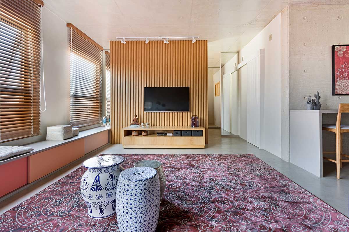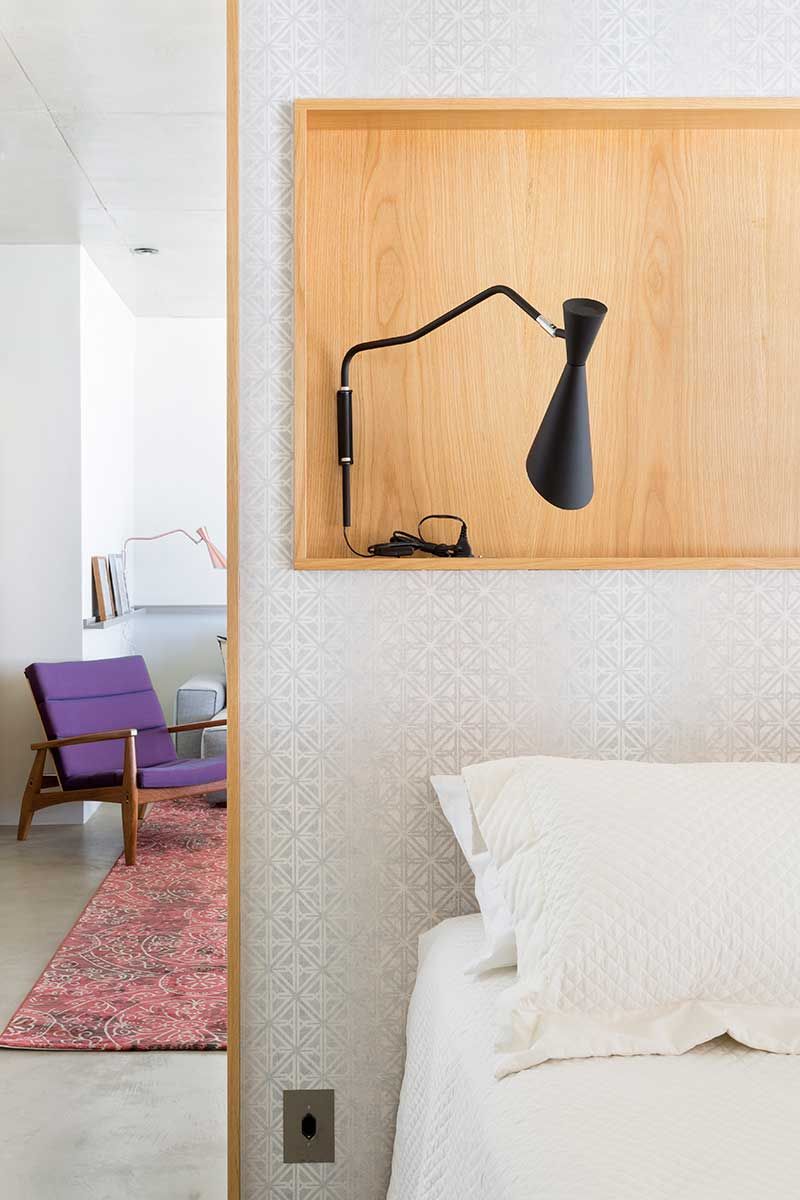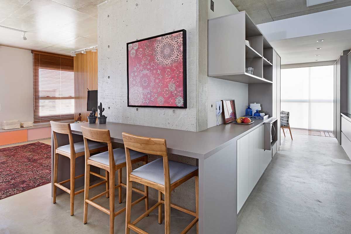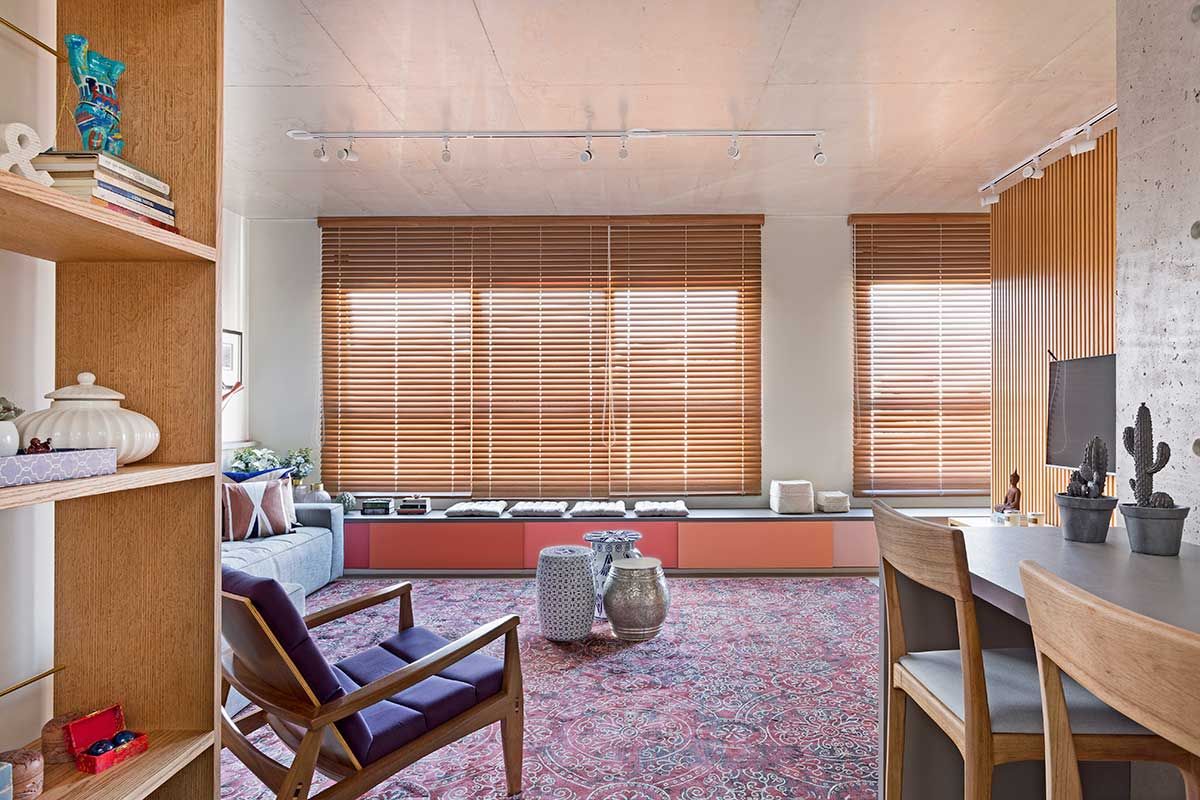 O estilo do imóvel é mais industrial (piso em cimento queimado, paredes em concreto) e a cliente buscava um ambiente confortável (um oásis em meio a cidade). Por isso, o escritório optou por trazer bastante madeira para aquecer e dar um contraponto ao estilo do imóvel.