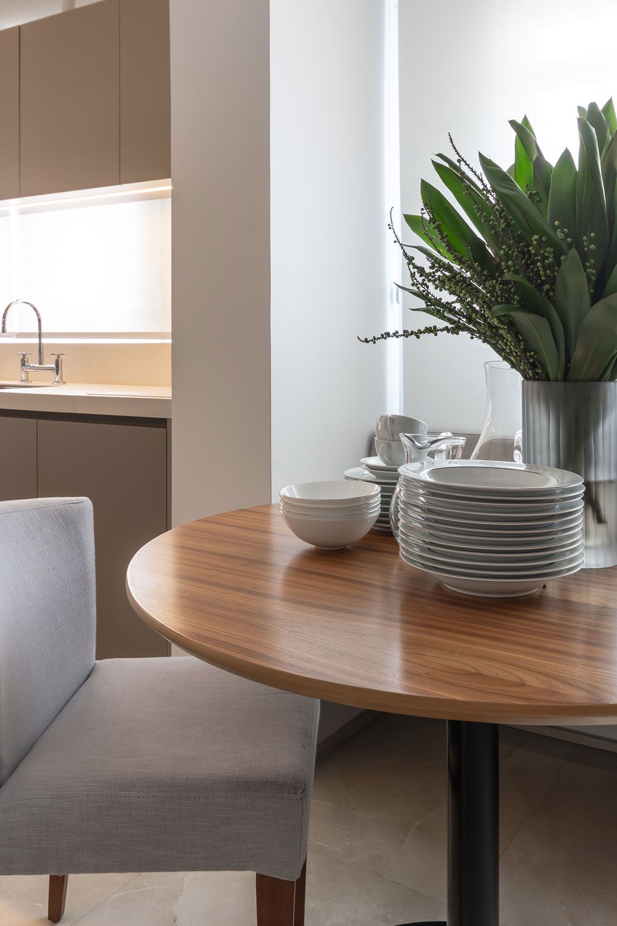 Os moradores procuraram o escritório Bruno Gap Arquitetura, pois desejavam que o apartamento de 200m² fosse confortável, que ele pudesse receber convidados para tocar piano na sala, participar de almoços ou jantares em um ambiente convidativo e agradável.