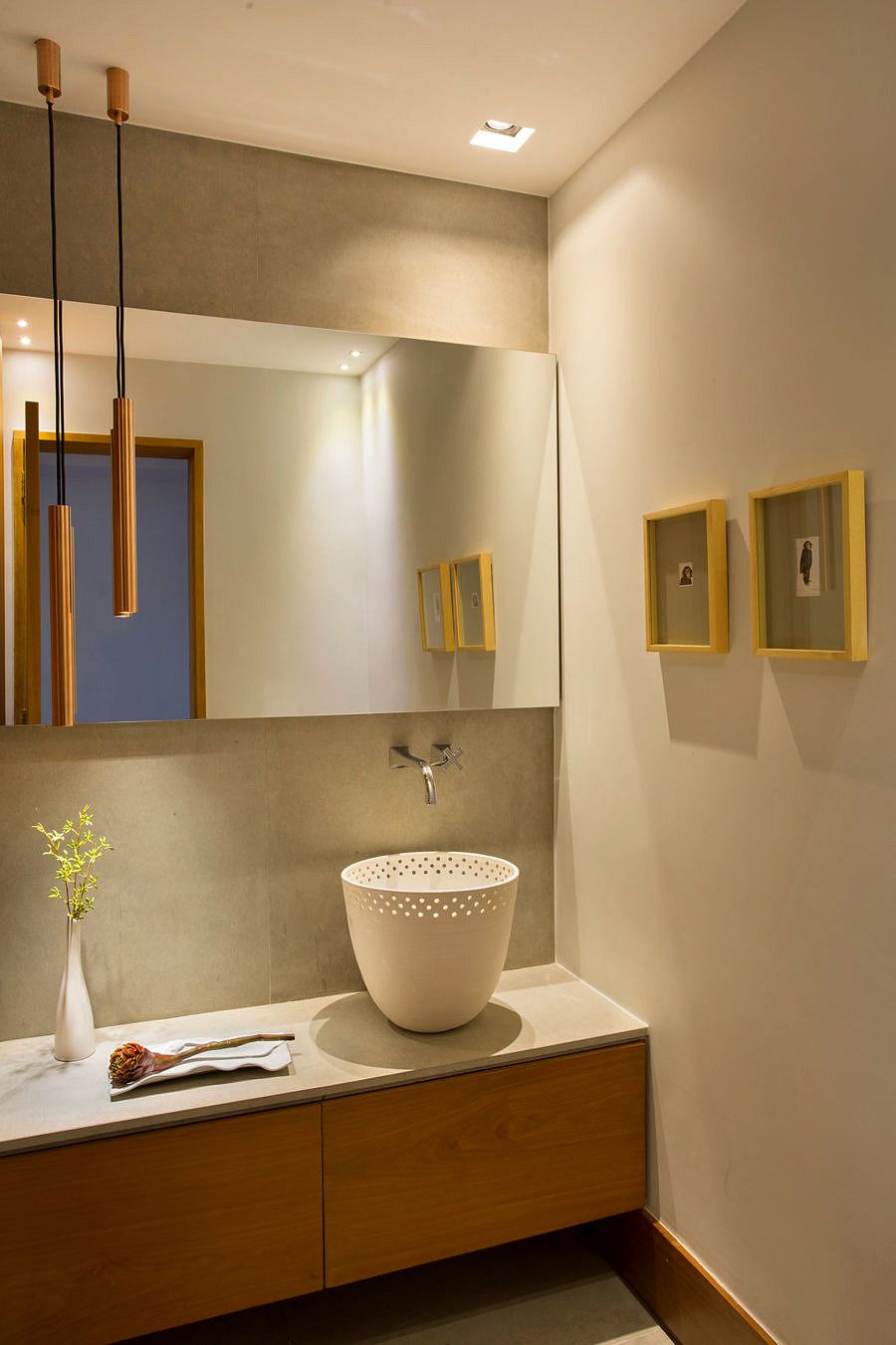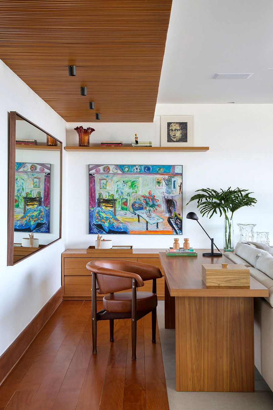 Este é o segundo apartamento do casal, com projeto do escritório Marise Kessel Arquitetura. O apartamento tinha originalmente três quartos, que foram transformados em quarto principal (com closet e 2 banheiros) e escritório, que também recebe as visitas.