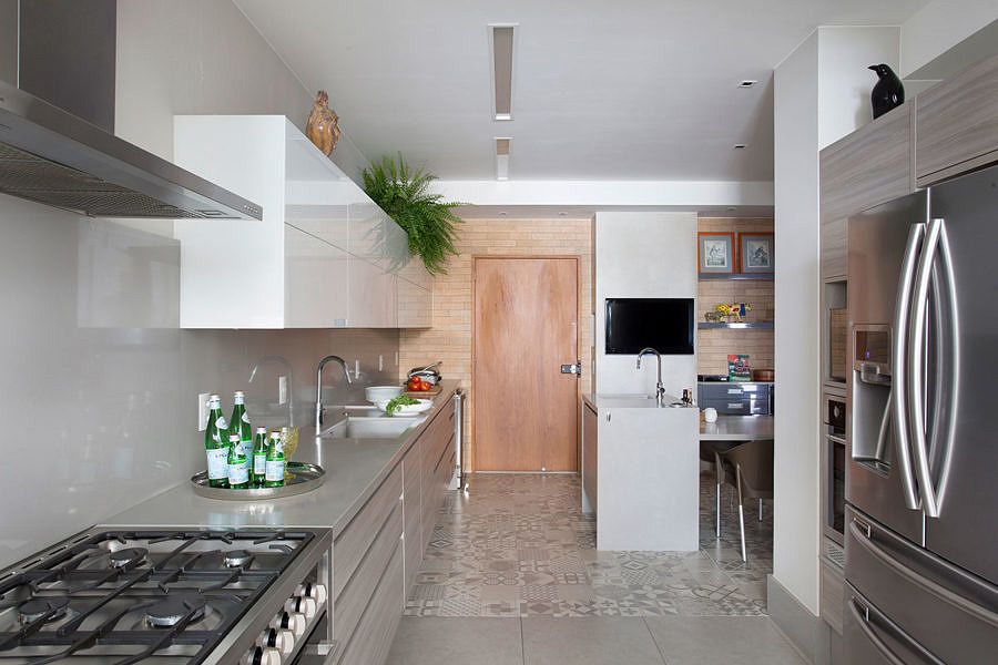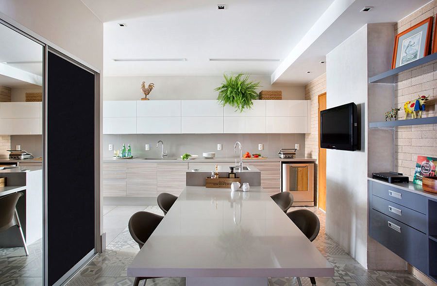 A cozinha possui como divisória apenas grandes portas de correr em vidro e perfis de alumínio pretos. Ela é aberta para a circulação do apartamento e desenvolvida entorno de uma ilha de apoio e mesa para a família no dia a dia.