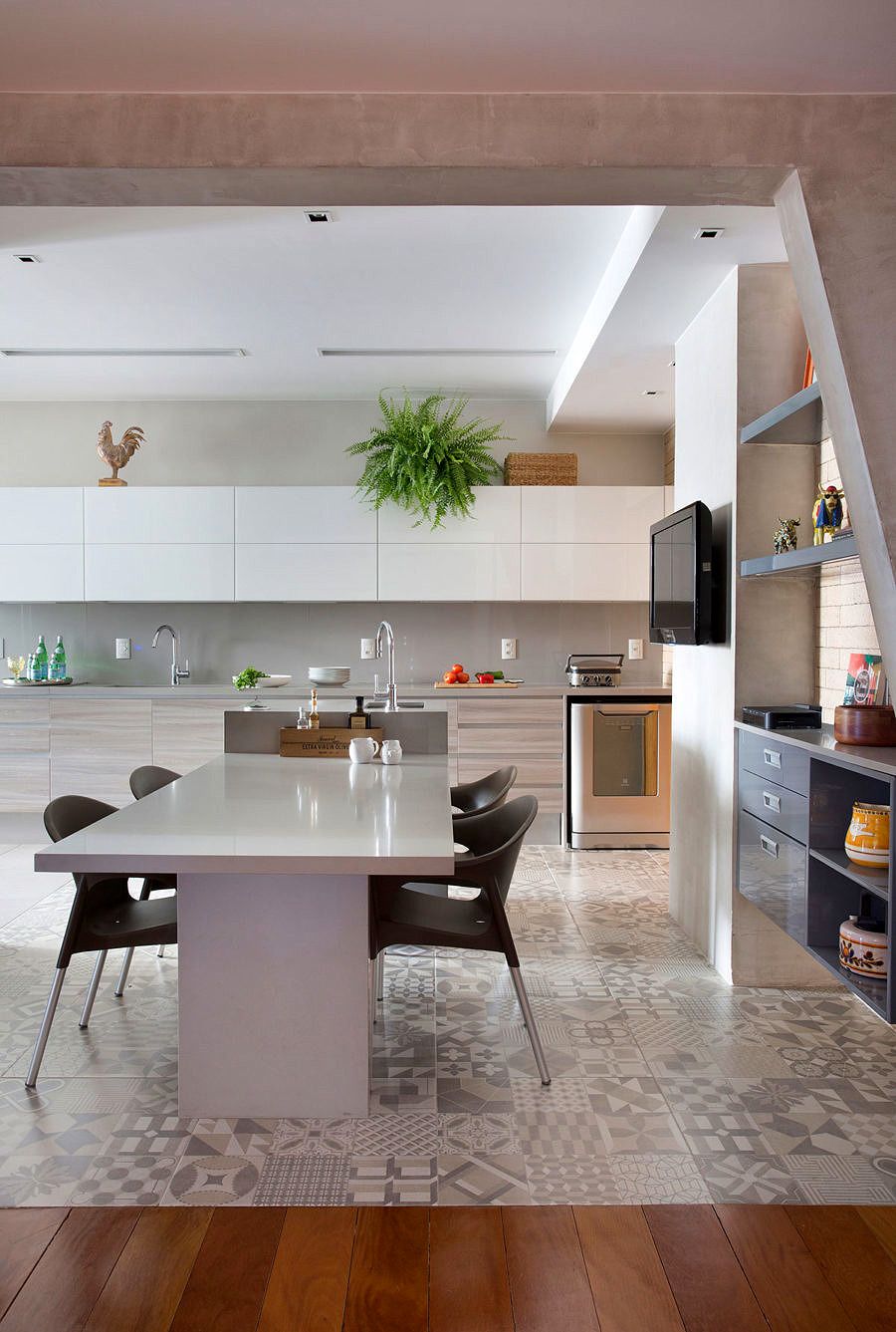 O desafio do projeto para o escritório foi ao remover a parede existente entre a cozinha e os armários da circulação, encontrar uma viga e um pilar inclinado. Para solucionar, eles mantiveram ambos aparentes, com acabamento tipo concreto.