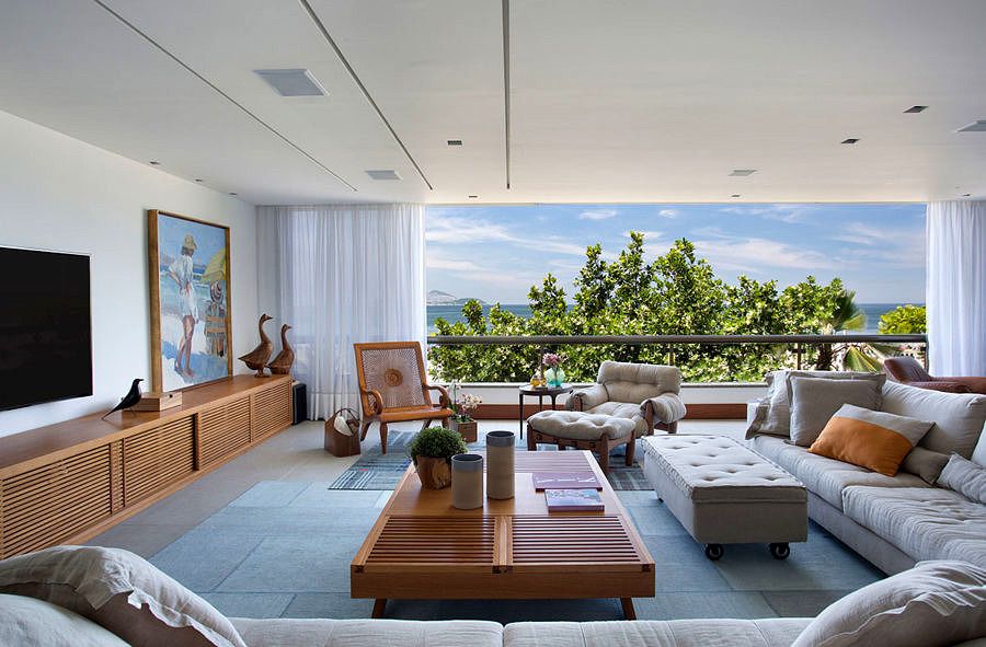 Os ambientes foram integrados de forma que a sala do apartamento integra a sala de jantar com grande armário louceiro com portas espelhadas, sala de TV e estar, onde um único móvel linear acomoda os equipamentos e outros guardados, e um ambiente de convivência com 4 poltronas, para um bom bate papo e também para admirar a vista.