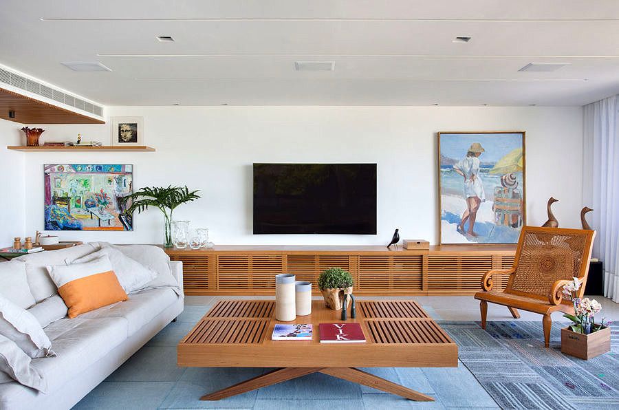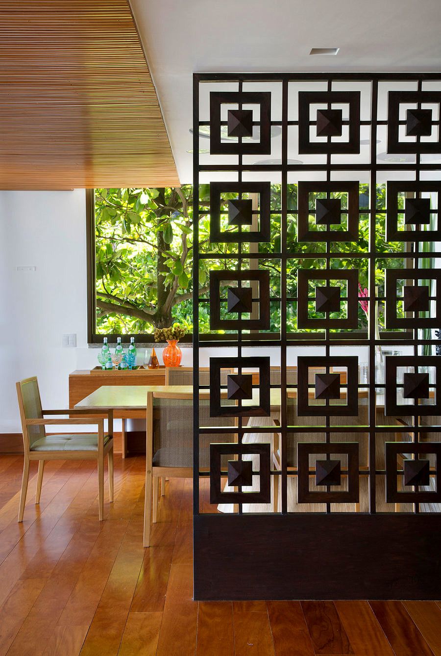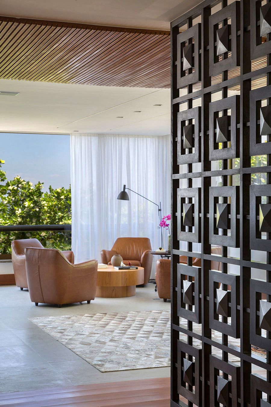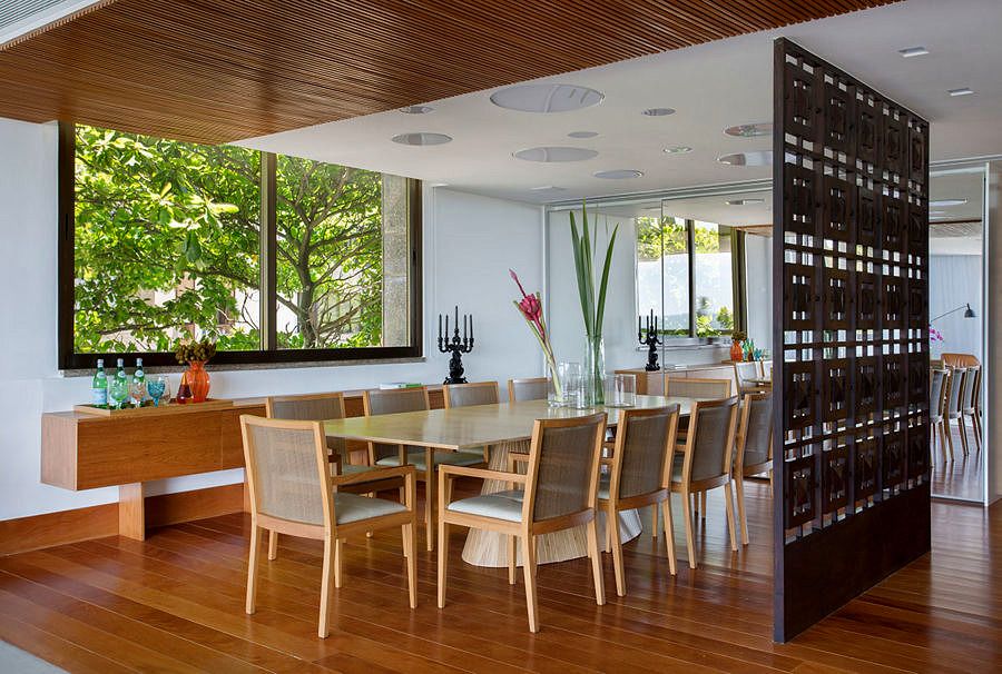 Um dos destaques fica entre o hall do apartamento e a sala de jantar, um painel vazado do Joaquim Tenreiro dá as boas vindas.