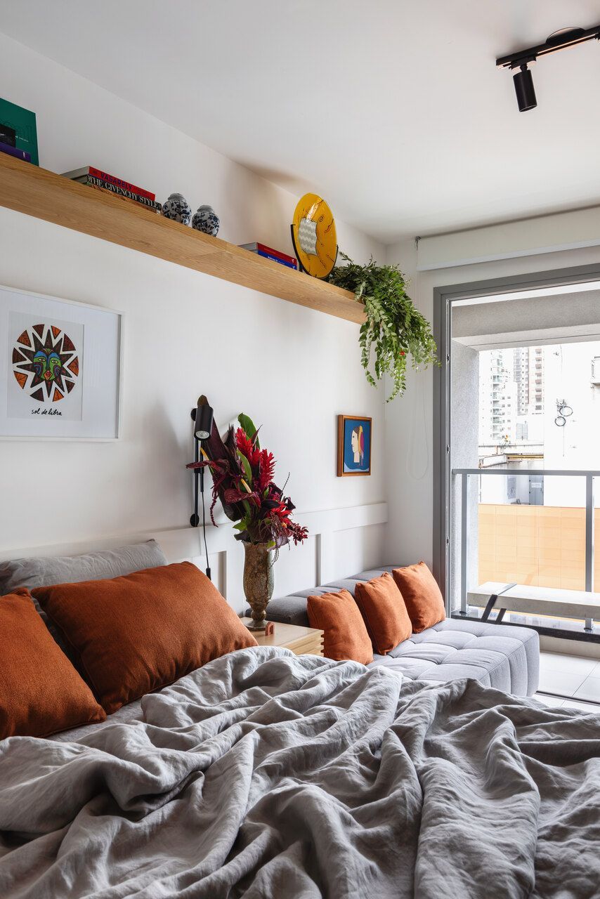 O ambiente principal, que reúne living e dormitório em 11,92 m², foi desenhado como um espaço versátil e fluido. A cama divide protagonismo com o sofá, criando mais de um ponto de descanso e convivência, inclusive para assistir à TV. Essa sobreposição de usos reforça a ideia de casa vivida, sem rigidez, onde os limites entre estar e dormir se diluem de forma natural.