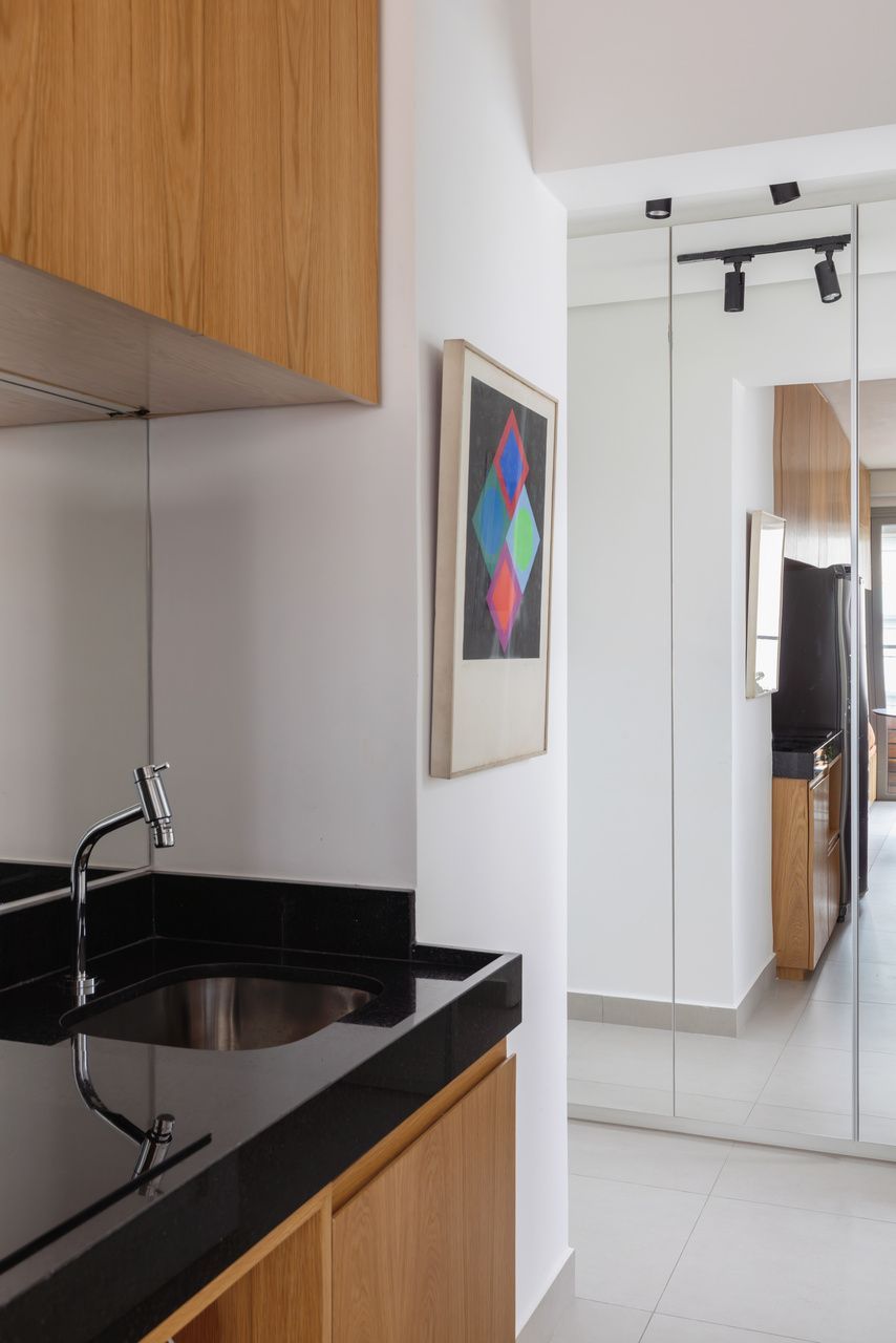 A reforma não exigiu alterações elétricas ou hidráulicas, já que o apartamento era novo. Ainda assim, o resultado demonstra que transformar um imóvel pequeno vai muito além de intervenções estruturais: trata-se de olhar atento, escuta sensível ao morador e soluções que equilibram conforto, funcionalidade e identidade. Um apartamento que prova que tamanho não limita experiência, apenas exige mais precisão no desenho.