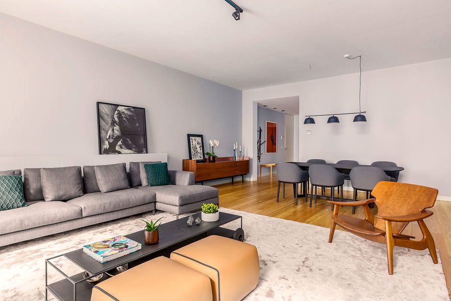 O projeto de decoração explora a luz natural abundante no apartamento e aposta em um mix de mobiliário europeu e clássicos do design brasileiro, resultando em uma morada confortável e elegante.