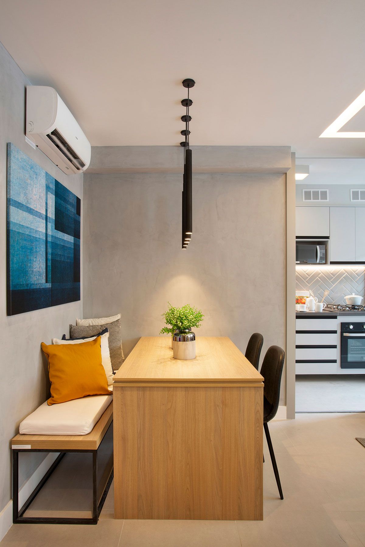 Esse apê pertence a um jovem casal, recém-casados, e segue uma tendência mundial em moradia: os microapartamentos. No imóvel de 27m² a arquiteta Bianca da Hora apostou em um layout integrado, demolindo paredes para ampliar os espaços e favorecendo a entrada de luz natural nos cômodos.