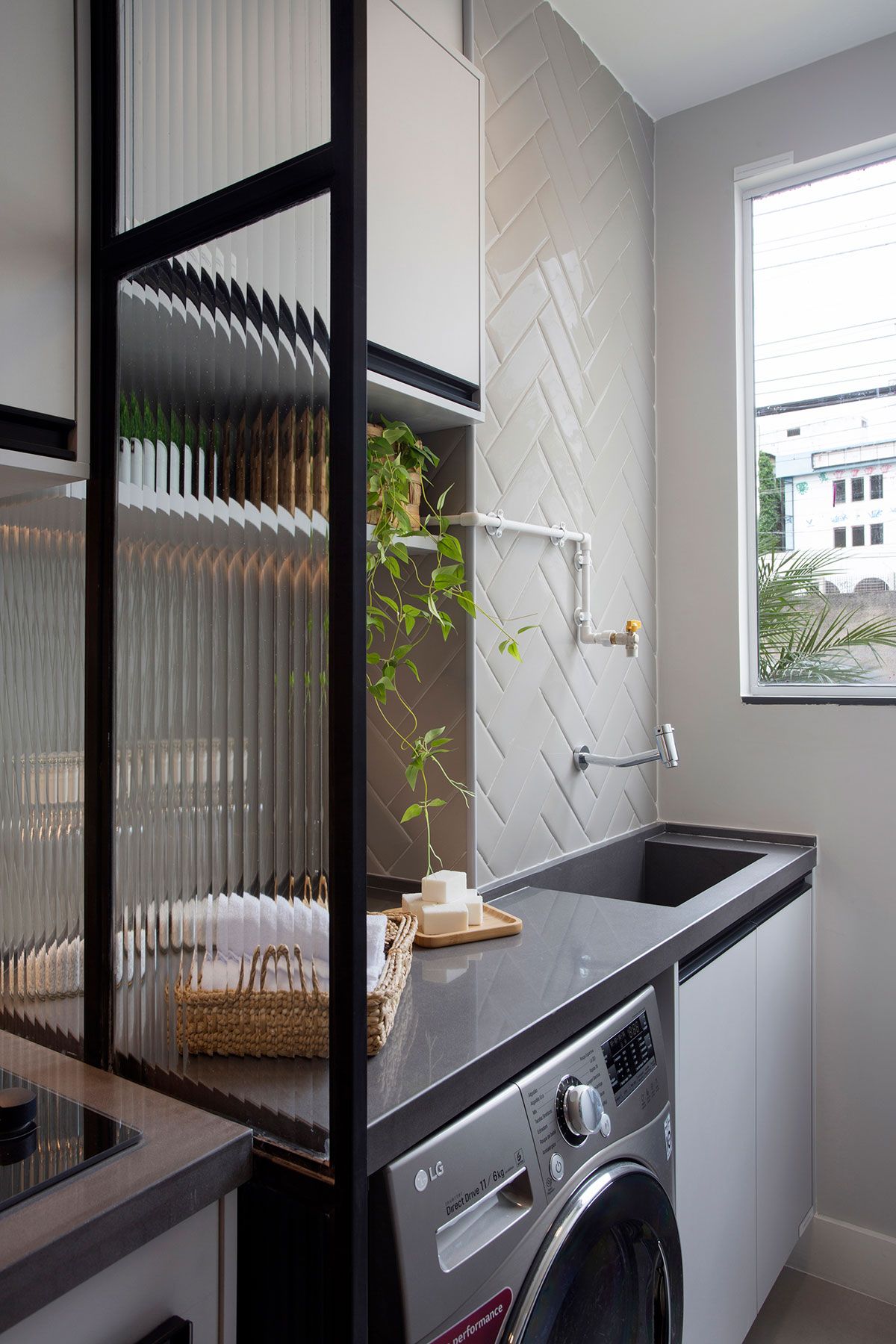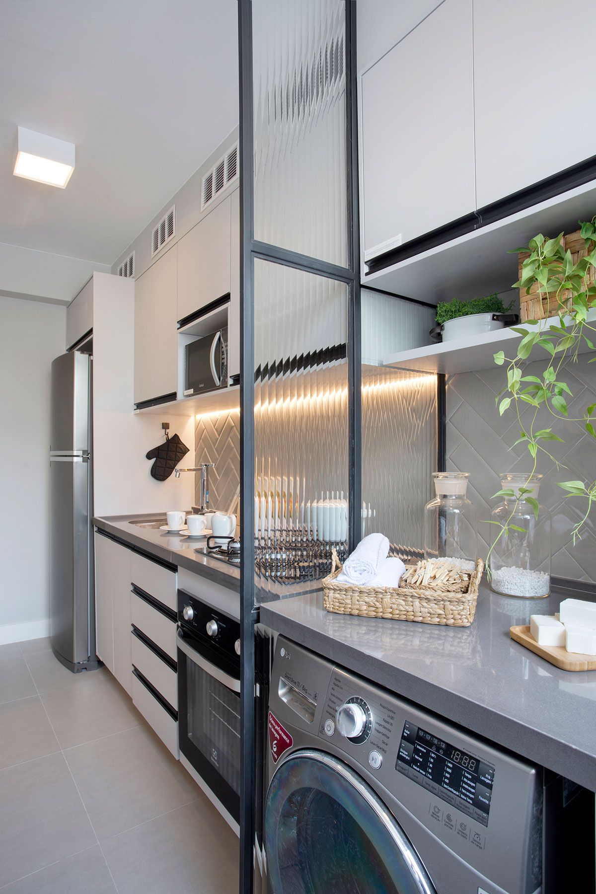 A cozinha, em formato de corredor, mantém a paleta de cores, sendo parcialmente aberta para sala. O mobiliário planejado otimiza os espaços de armazenamento, além da escolha de materiais que facilitam a limpeza. Uma divisória em serralheria, com vidro canelado, separa a área de serviço sem bloquear a entrada da luz natural.
