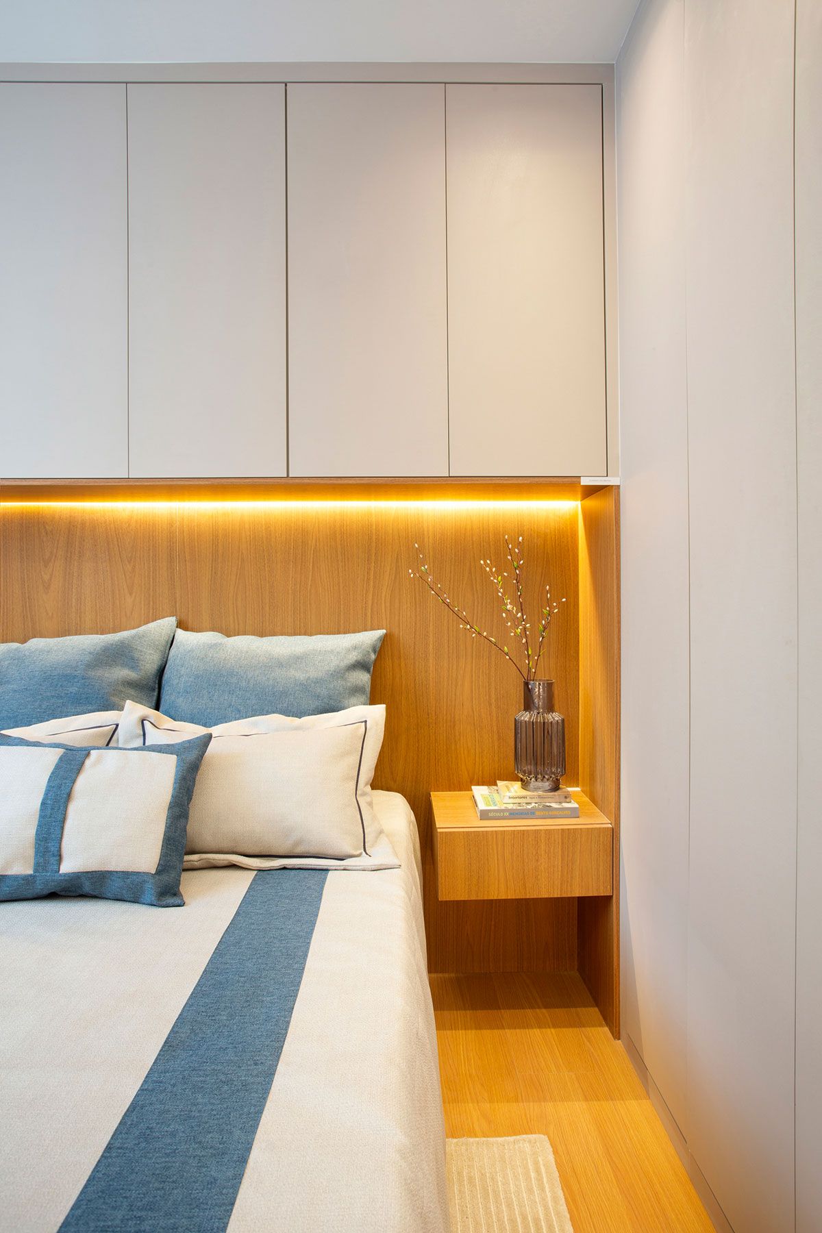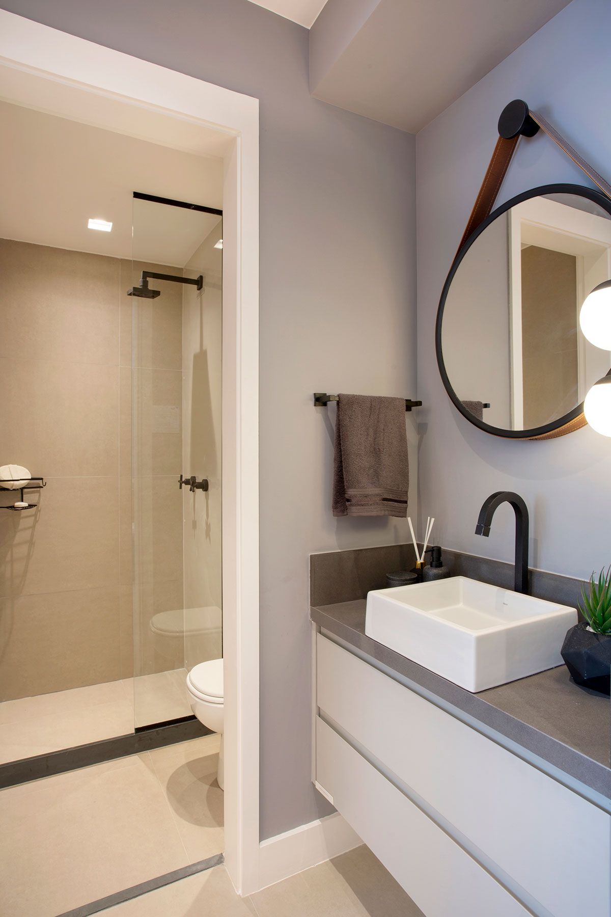No quarto, a marcenaria inteligente mais uma vez é coringa: a arquiteta brinca com a profundidade da cabeceira da cama, recuada, com armários aéreos sobre ela, criando um nicho iluminado em madeira. Já o banheiro ganhou revestimento na cor cinza, aplicado nas paredes e piso, com meia divisória em vidro delimitando a área molhada. Metais e acessórios na cor preta conferem um clima moderno ao pequeno cômodo.