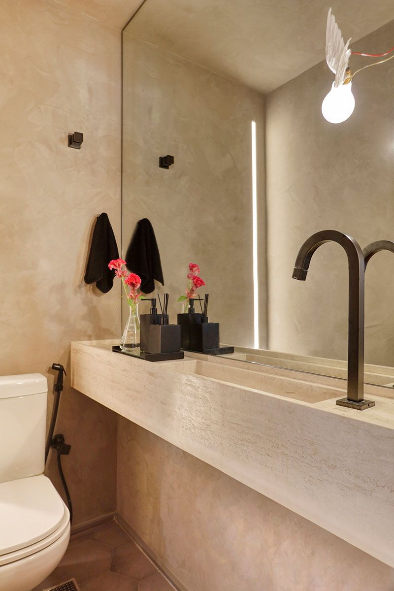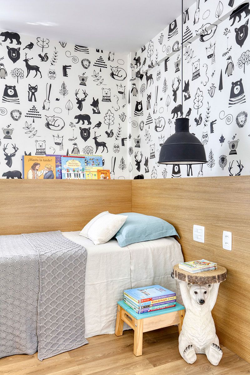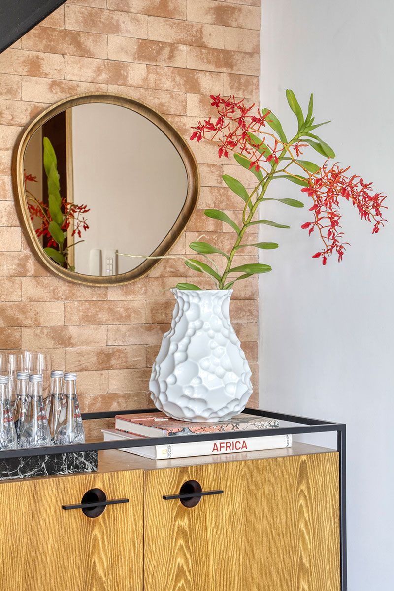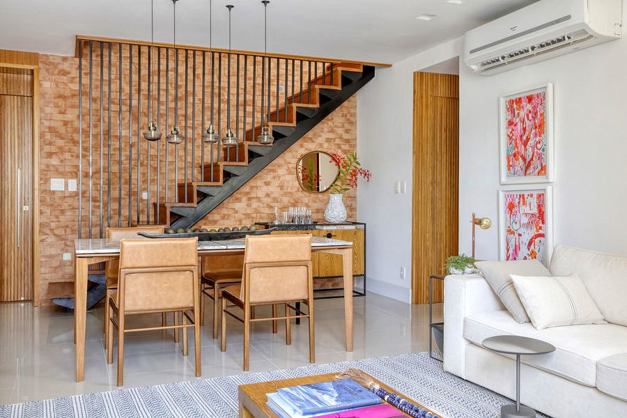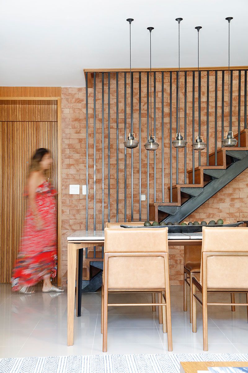 Uma curiosidade sobre o projeto é em relação à escada: a arquiteta conta que garimpou referências no Pinterest para solucionar a questão da segurança das crianças, mas sem perder em beleza e estilo. A escada, então, ganhou guarda-corpo em metalon preto, conferindo a ela ares esculturais e contraste com a parede de tijolinhos ao fundo.