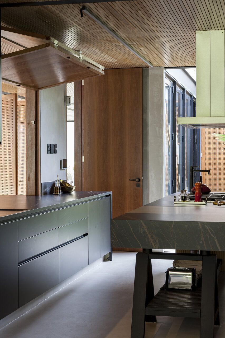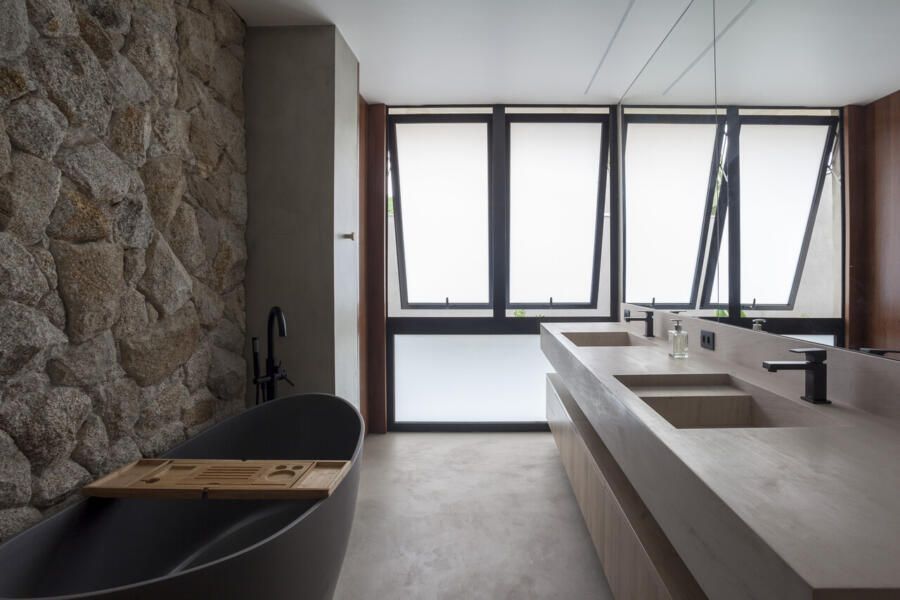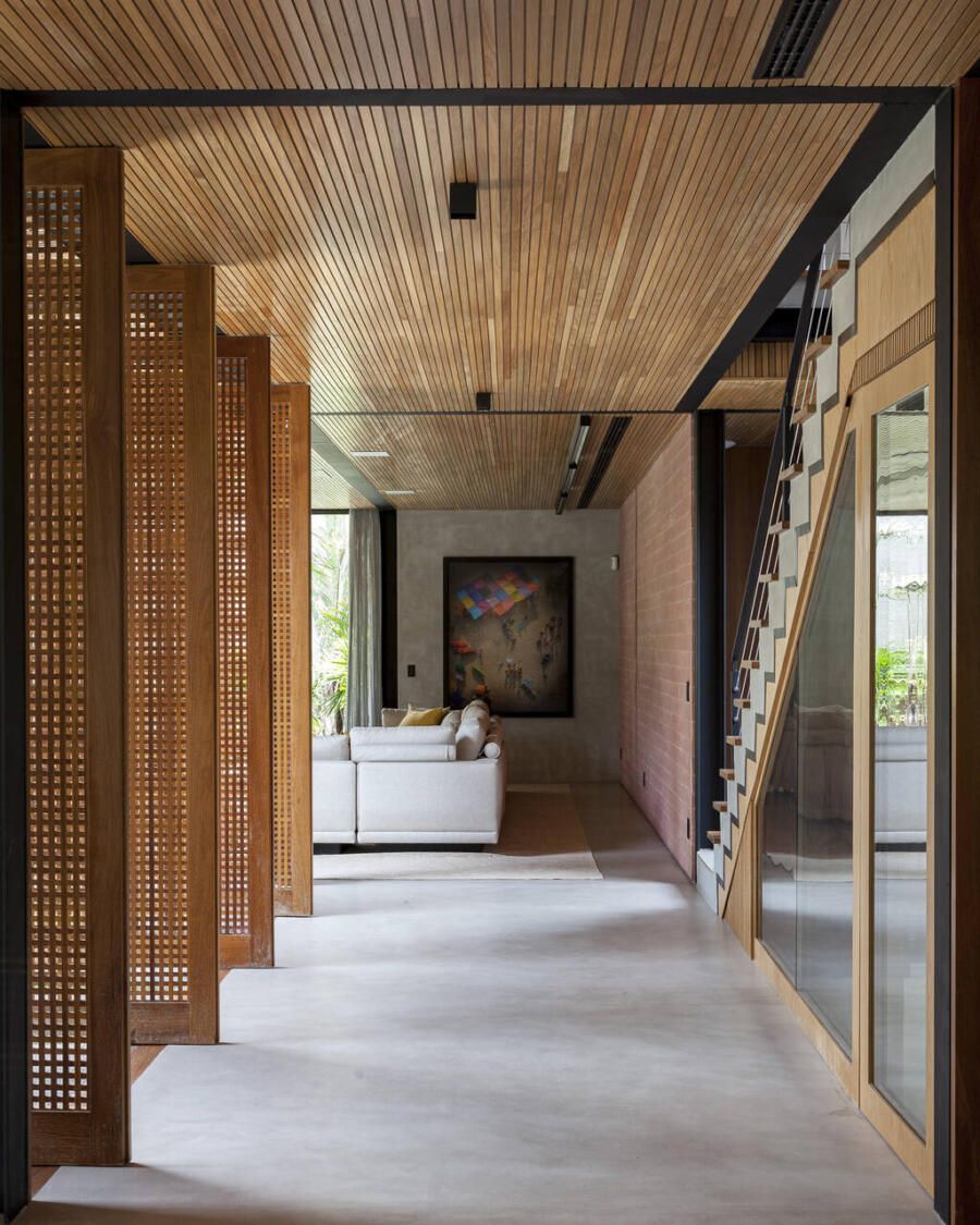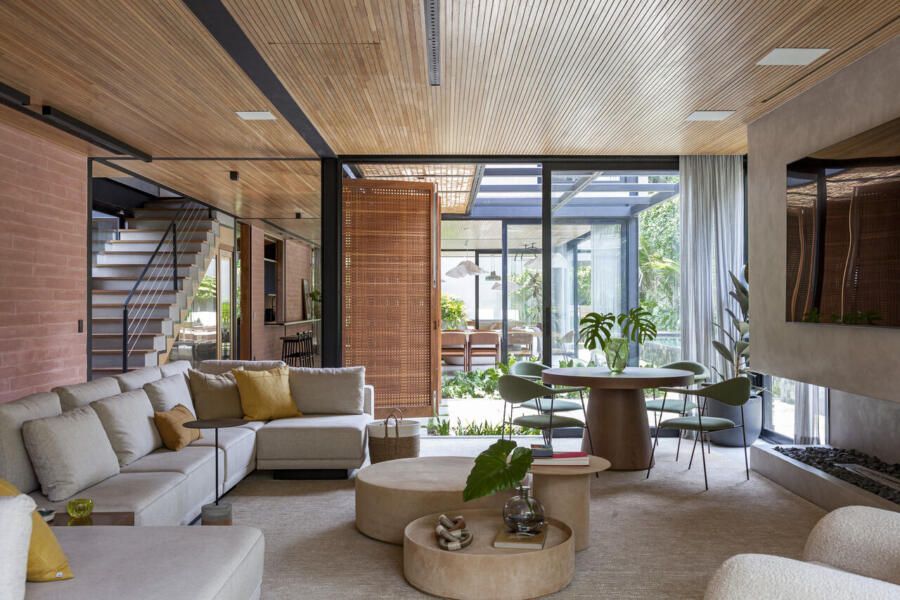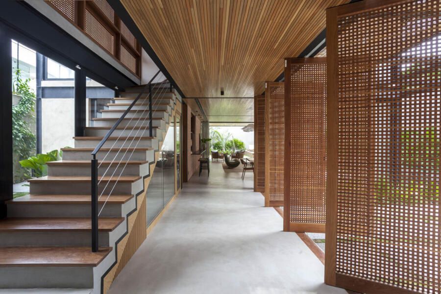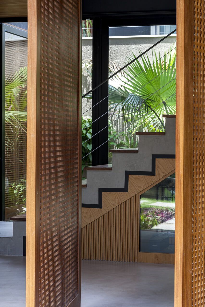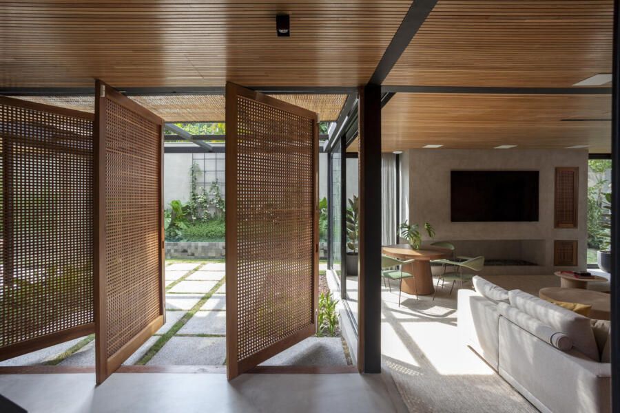O uso de materiais naturais foi essencial para criar um ambiente aconchegante e contemporâneo. O forro de madeira Tauari aquece os ambientes, enquanto o microcimento no piso contribui para a unidade visual e sensação de amplitude. Os muxarabis de Cumaru adicionam um toque de privacidade sem comprometer a ventilação e a entrada de luz natural.