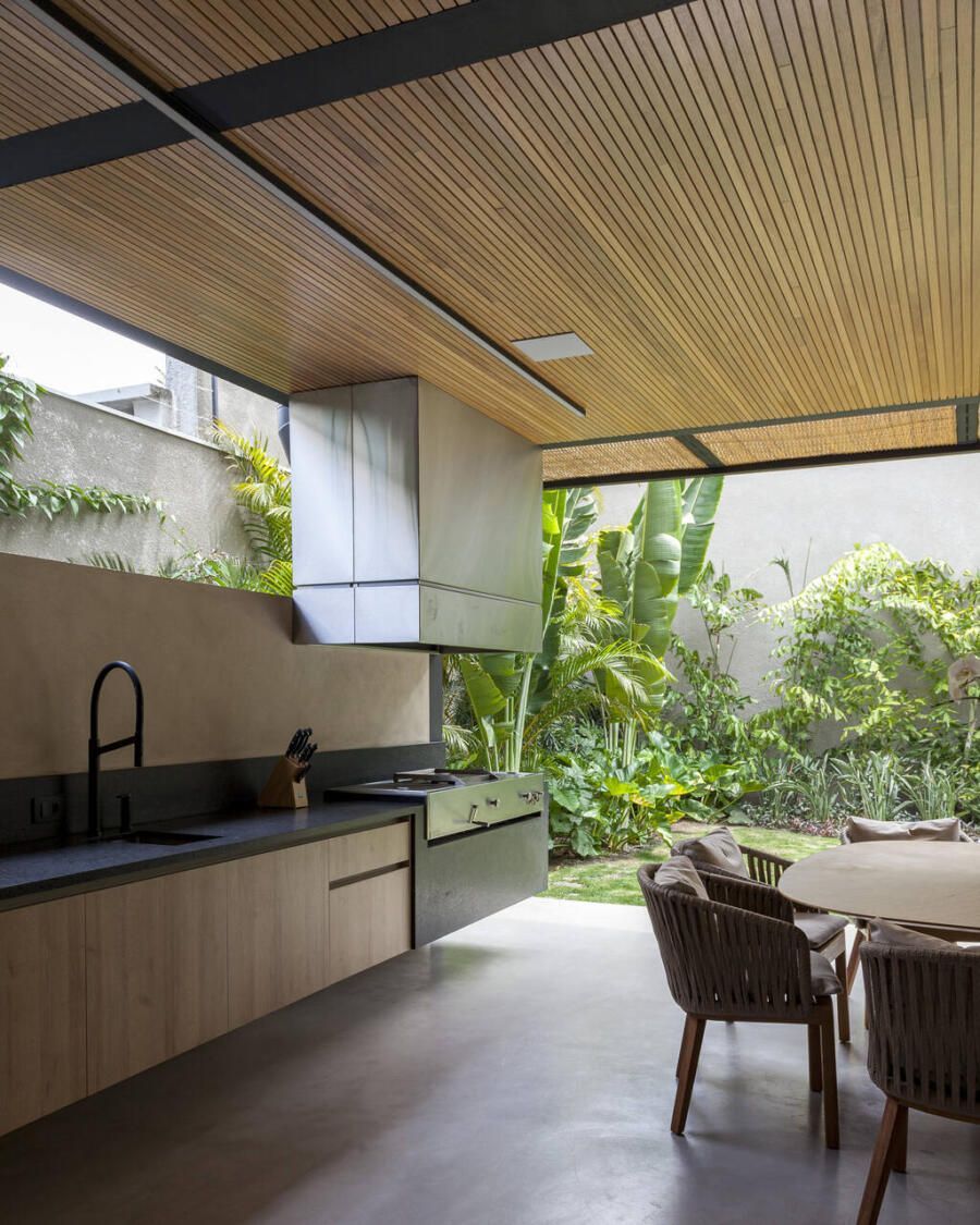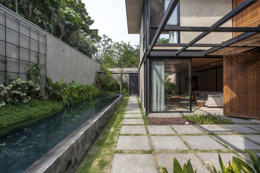 O paisagismo tem papel essencial na sensação de bem-estar da casa. A piscina e os decks foram planejados para criar uma transição suave entre a área interna e externa, proporcionando um espaço de lazer integrado à natureza.