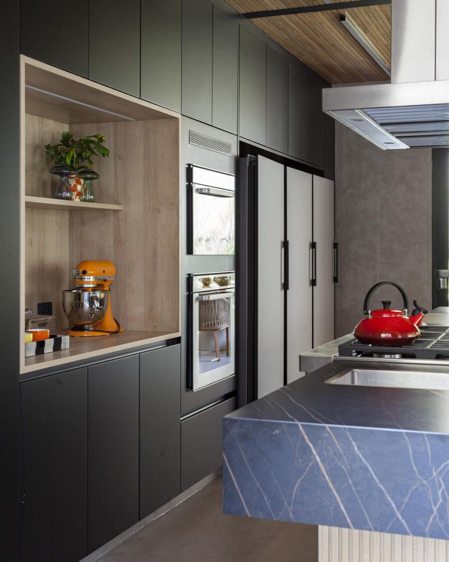 Um dos destaques do projeto é a conexão entre os espaços. A cozinha se abre para o jardim, criando um ambiente convidativo e dinâmico para o dia a dia. Outro detalhe interessante é a escada, que foi projetada para acomodar uma adega translúcida, tornando-se um elemento funcional e decorativo.