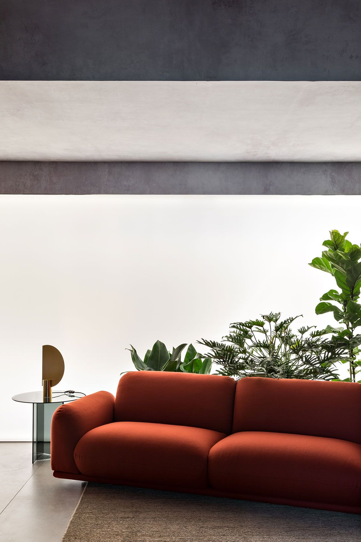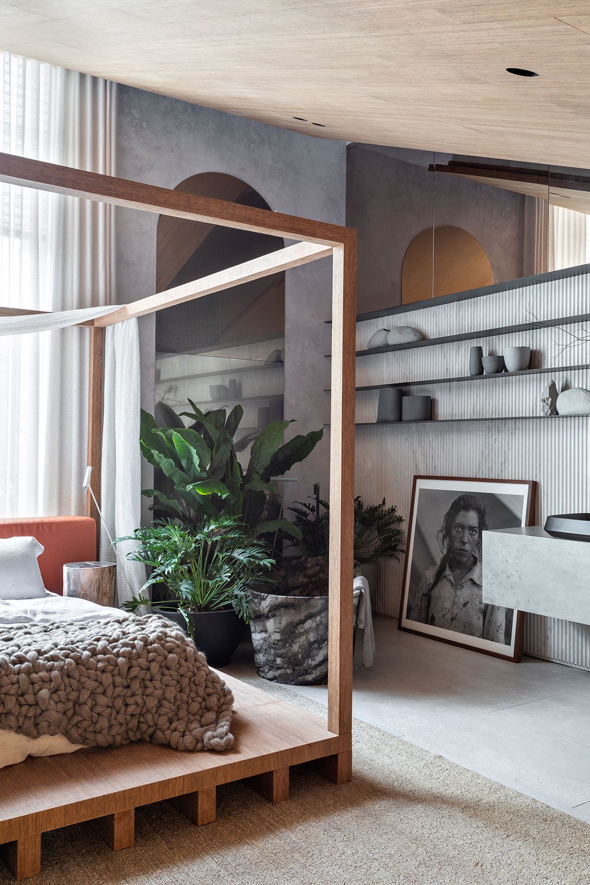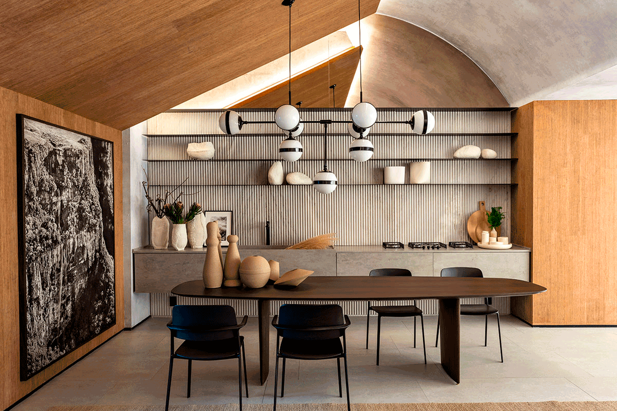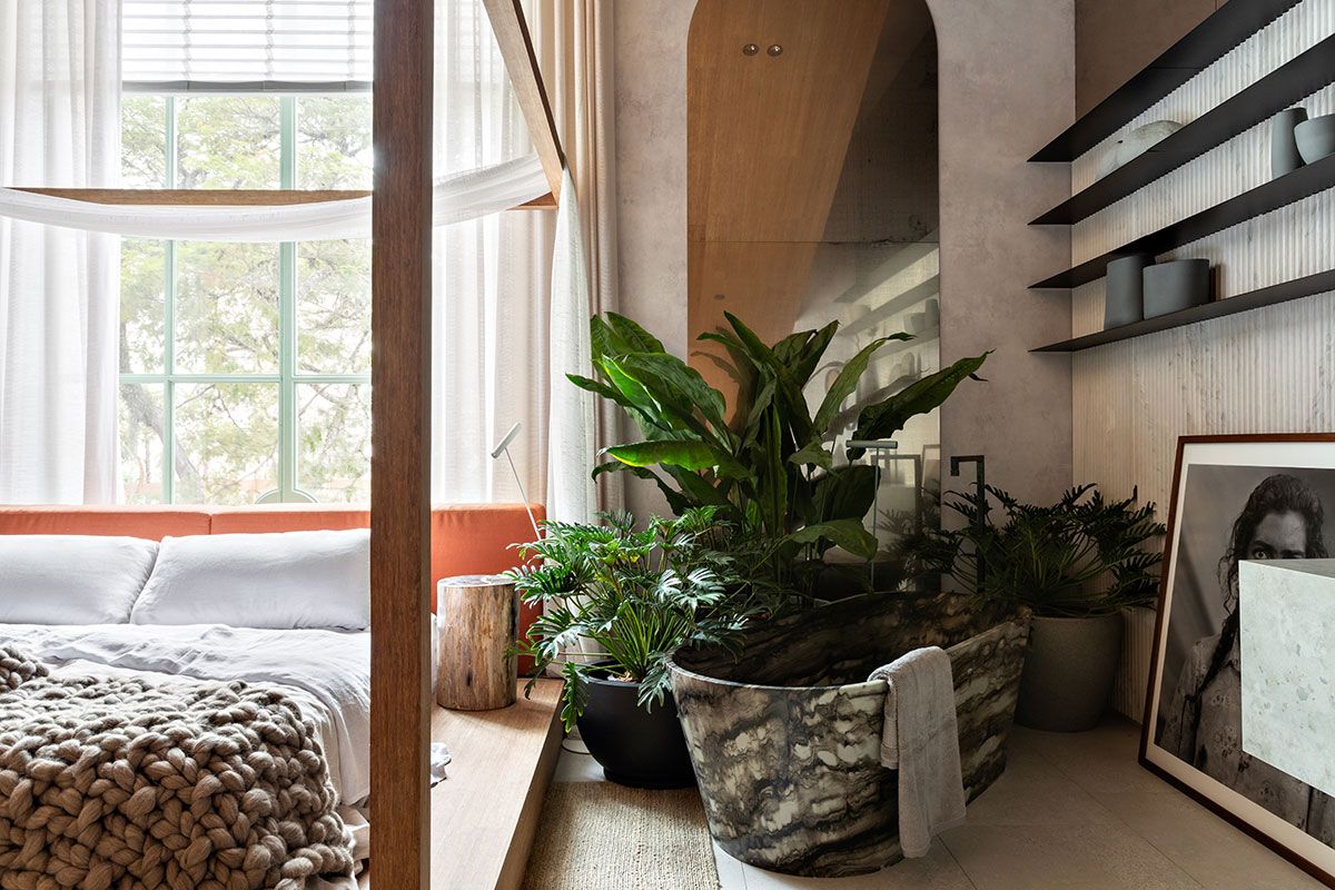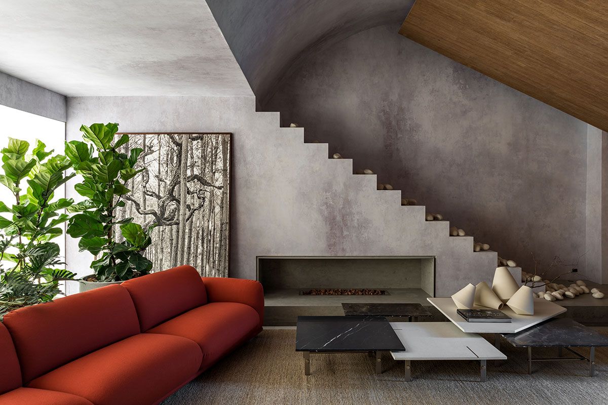O papel de parede que remete ao concreto, bem como os tapetes em fibras naturais, pedras nacionais, tecidos em linho, vasos em porcelana e argila, dialogam harmonicamente entre si e com a arquitetura, criando assim, um espaço intimista que serve de amparo e de proteção, um refúgio para homem urbano se sentir em contato com a natureza.