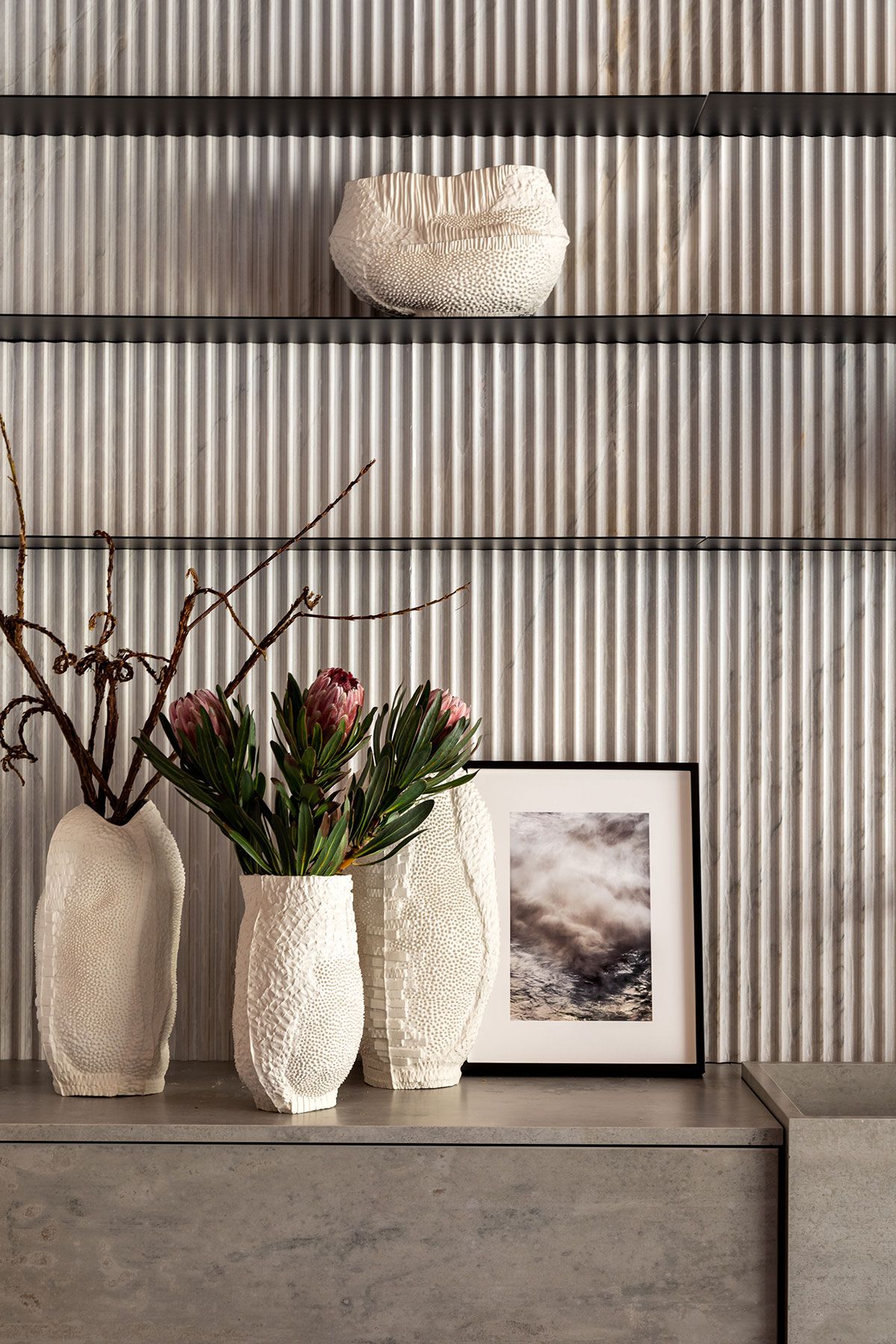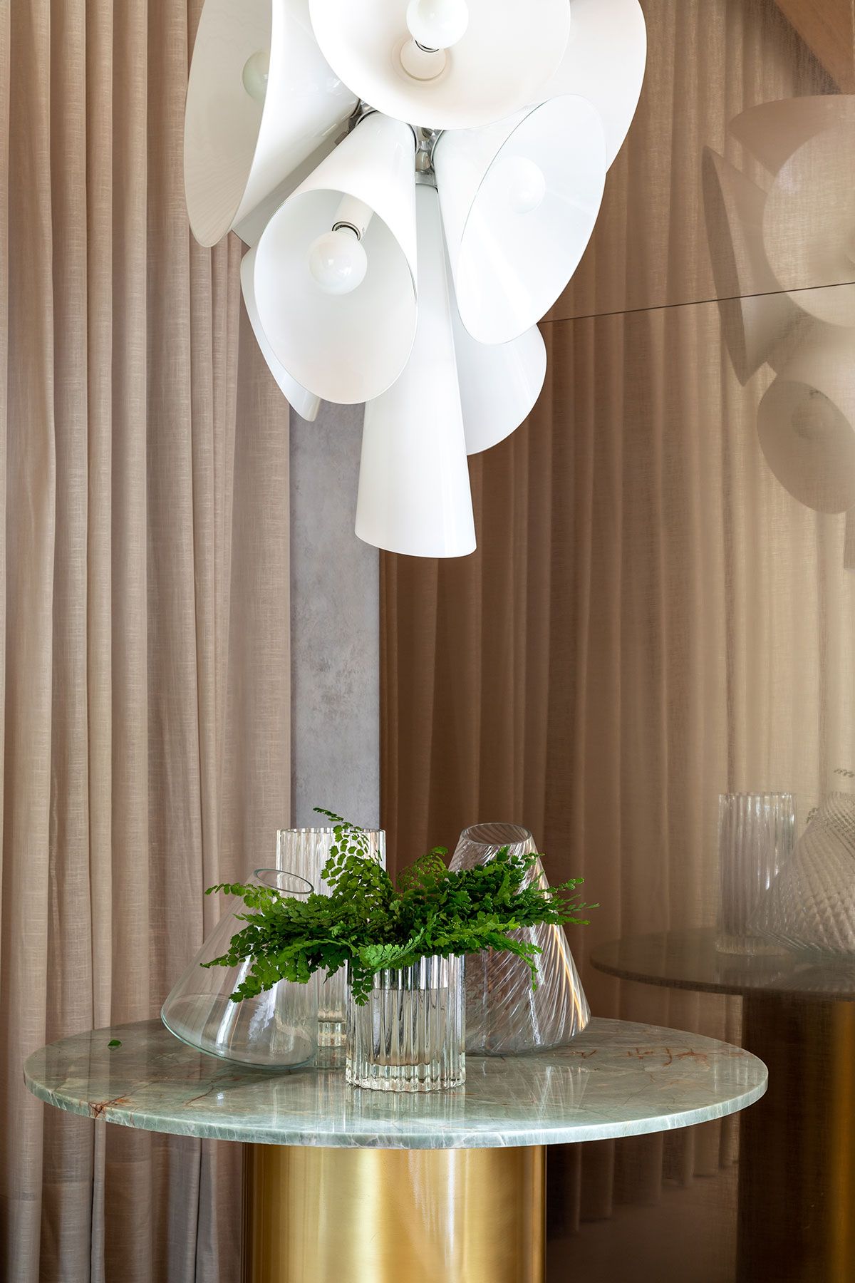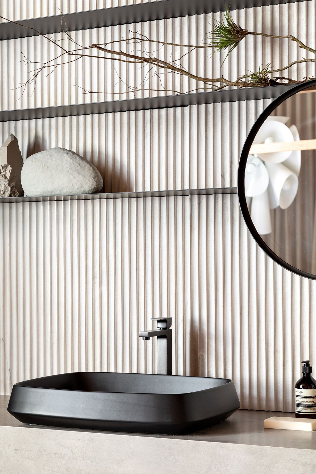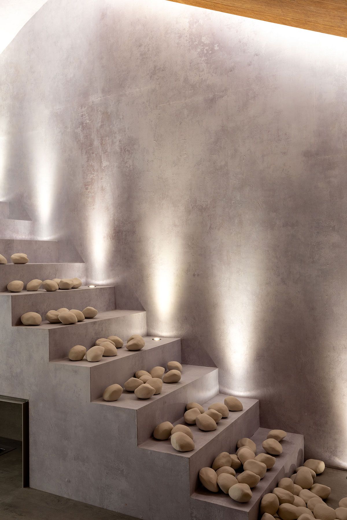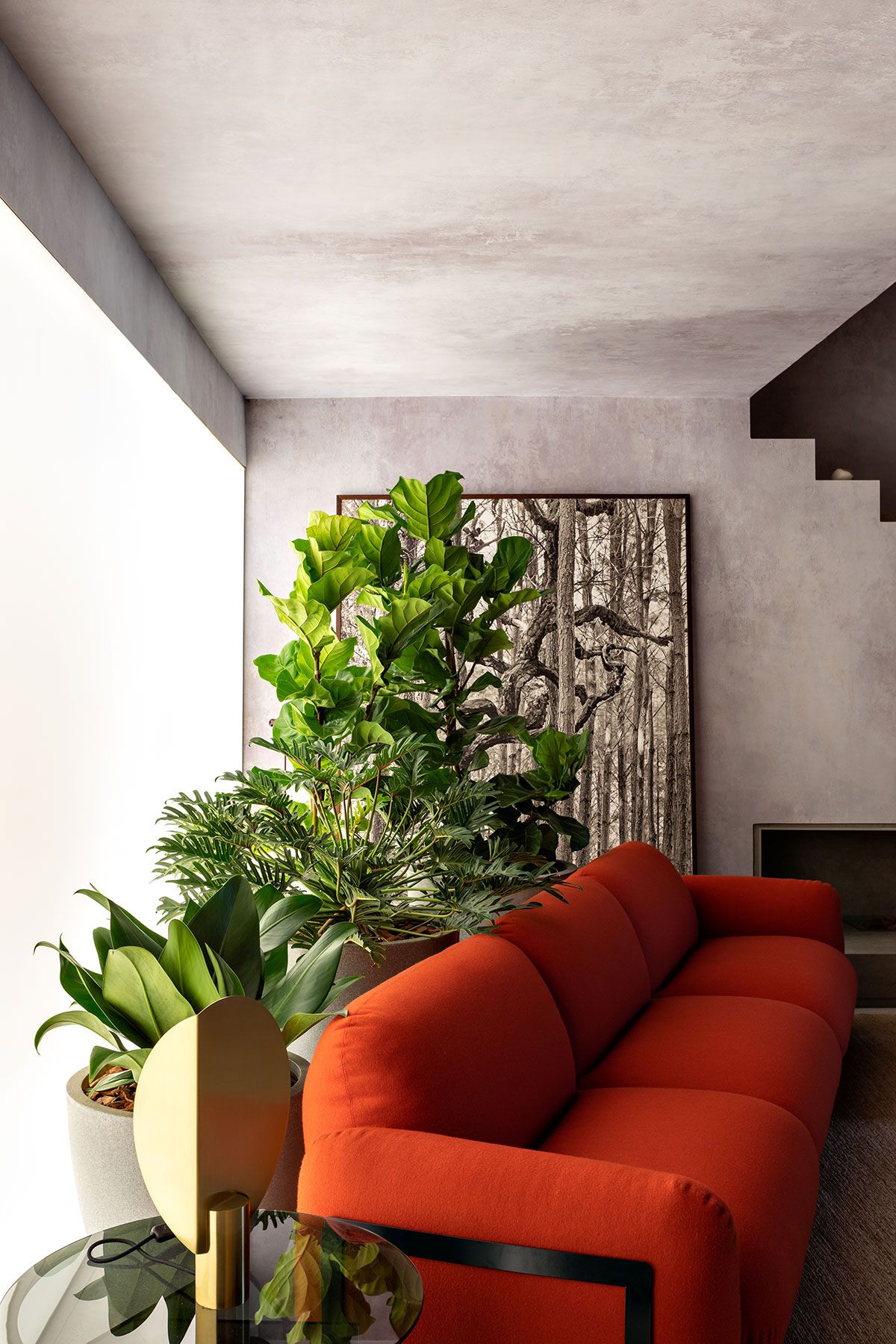 O papel de parede que remete ao concreto, bem como os tapetes em fibras naturais, pedras nacionais, tecidos em linho, vasos em porcelana e argila, dialogam harmonicamente entre si e com a arquitetura, criando assim, um espaço intimista que serve de amparo e de proteção, um refúgio para homem urbano se sentir em contato com a natureza.