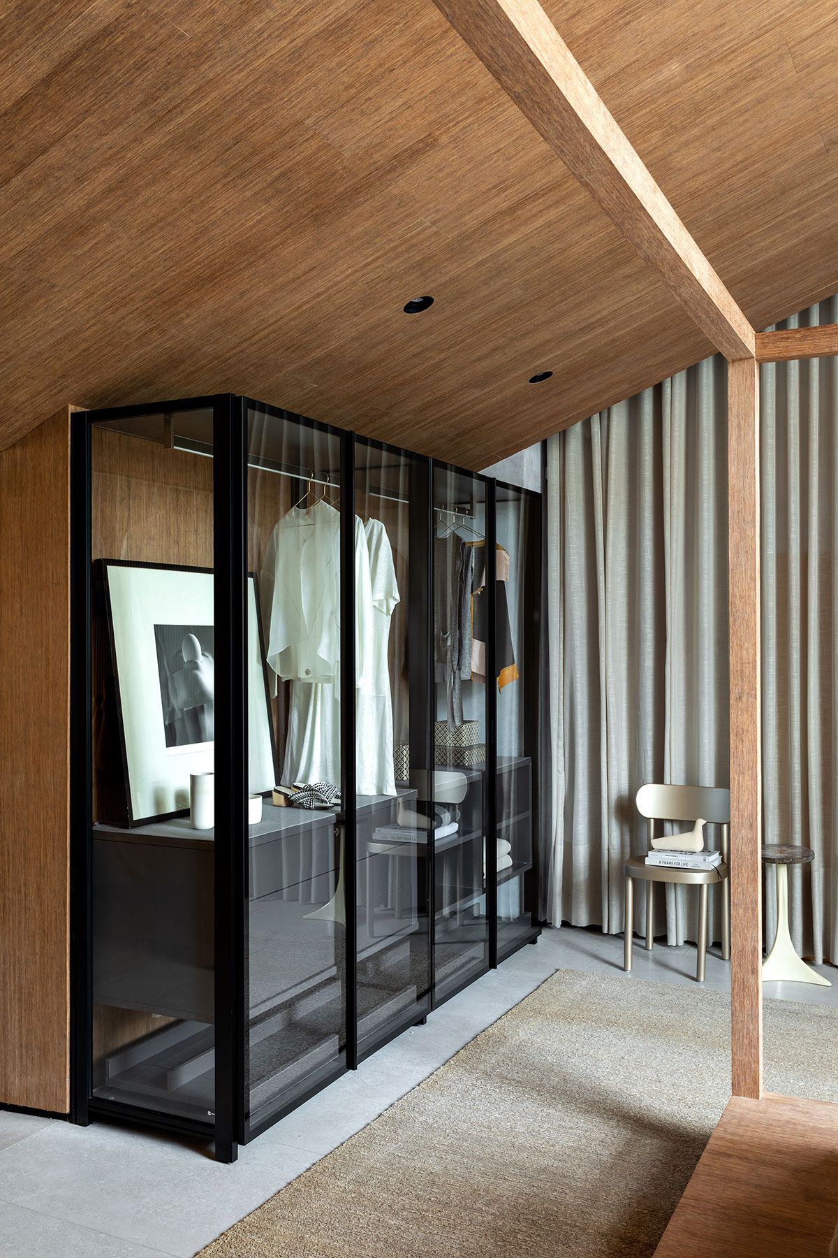 A escolha dos revestimentos orientou-se por tons quentes e terrosos, em contraste com o cinza claro como pano de fundo neutro. A arquitetura do ambiente foi totalmente planejada para proporcionar ao ocupante a sensação de acolhimento, especialmente através do forro inclinado de madeira de bambu, que além de aquecer o ambiente provoca uma percepção estética diferenciada.