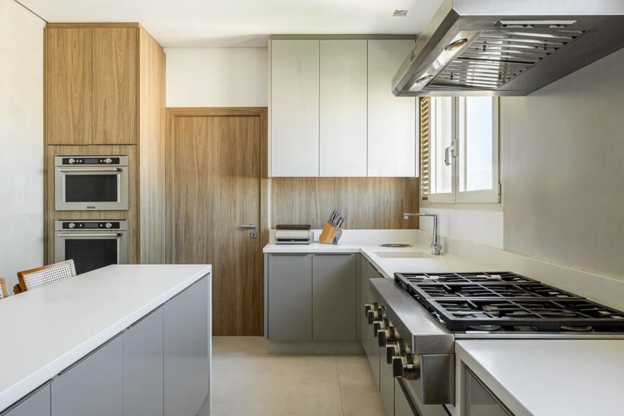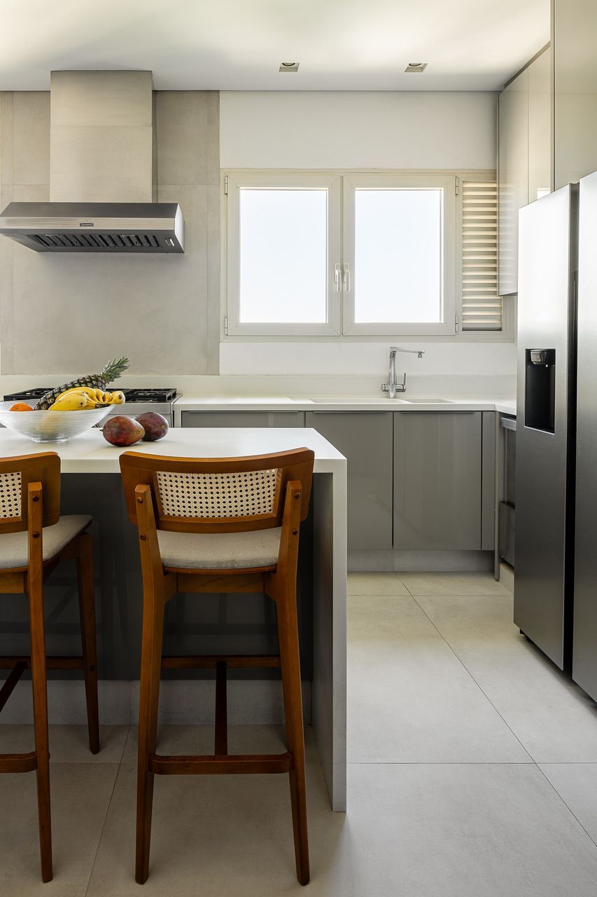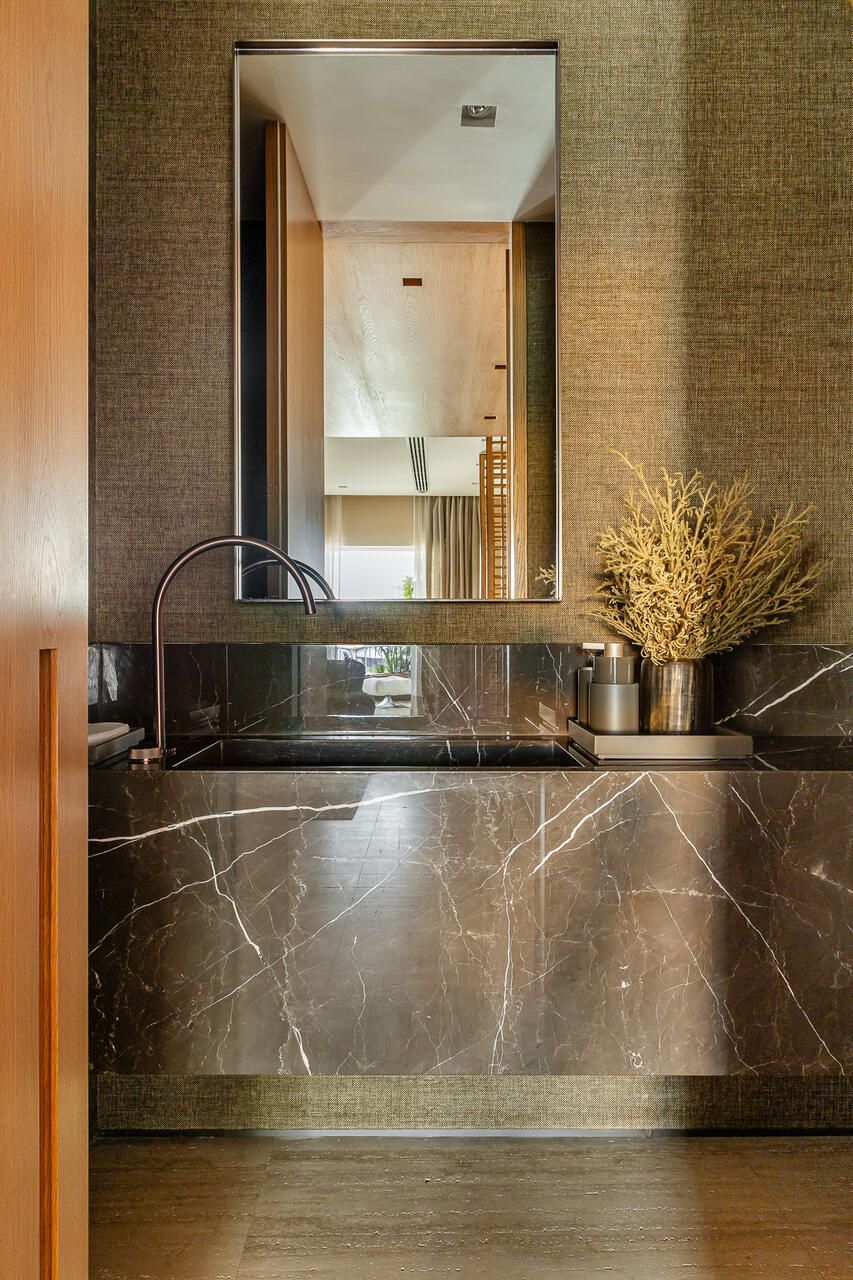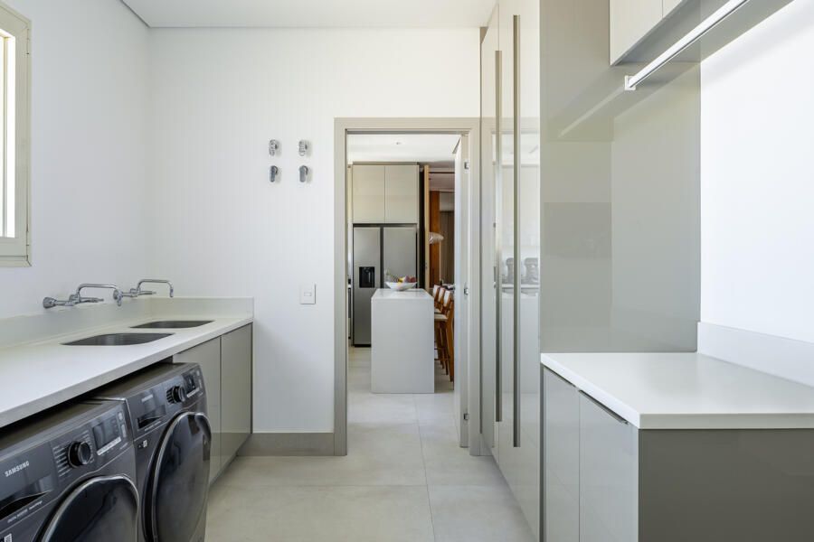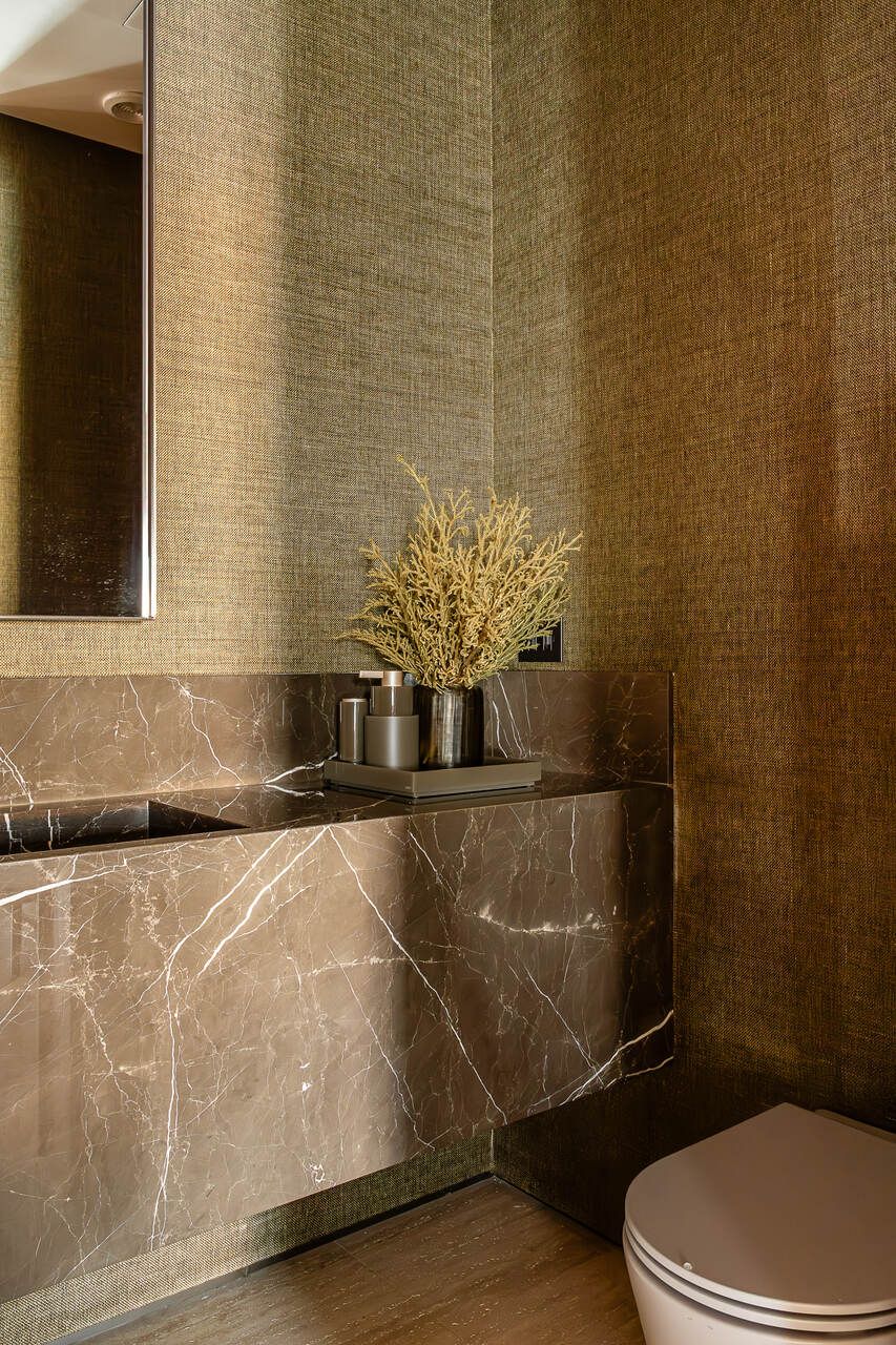 A cozinha, embora pensada prioritariamente para a equipe de apoio, também atende com praticidade o cotidiano da família, com uma mescla harmônica de marcenaria, vidro e porcelanato. Por último o lavabo foi pensado para ter personalidade prória, com metais bronzeados, cuba em mármore e papel de parede verde musgo. Sofisticação que permeia todo o projeto.