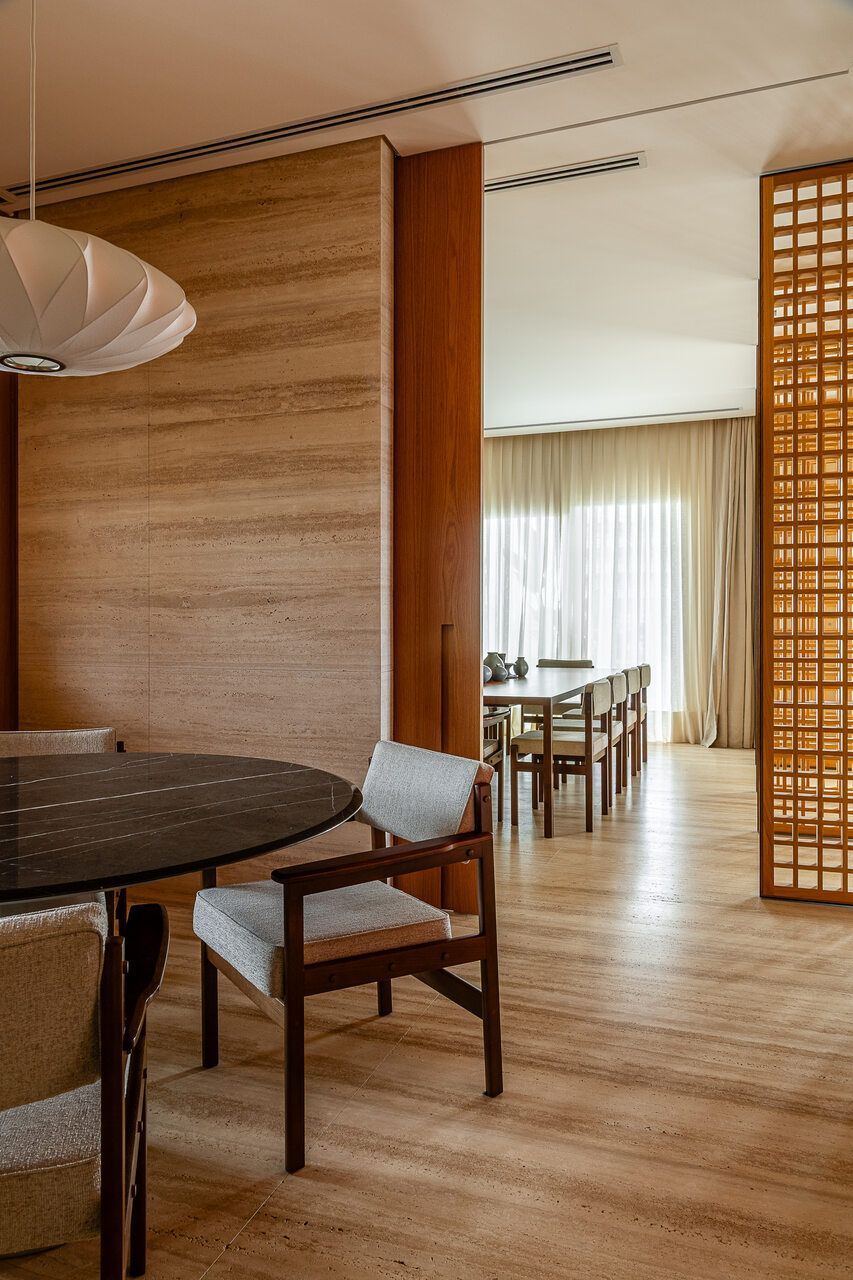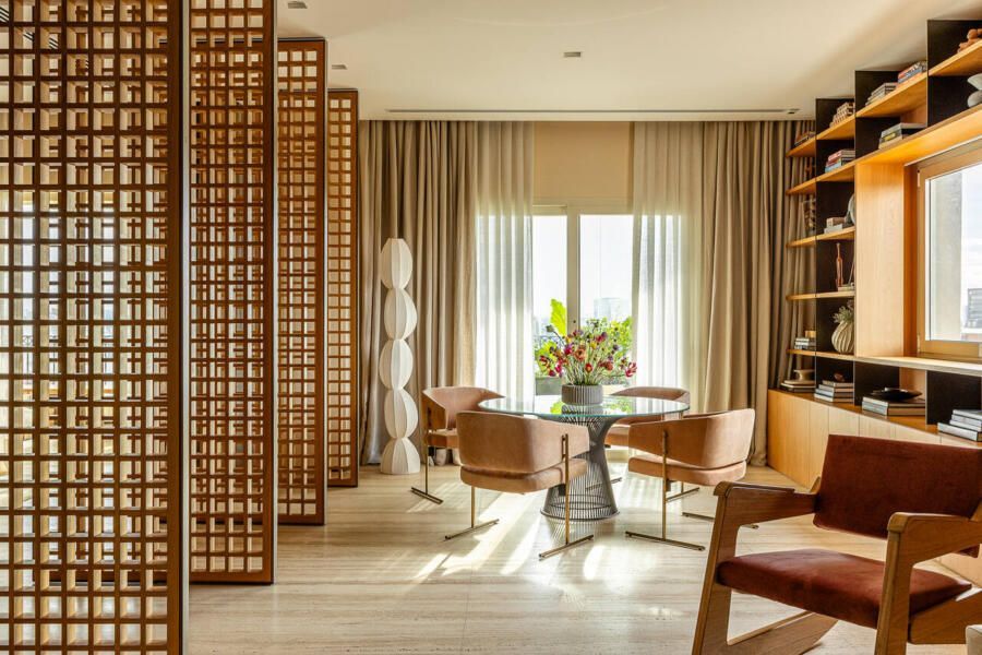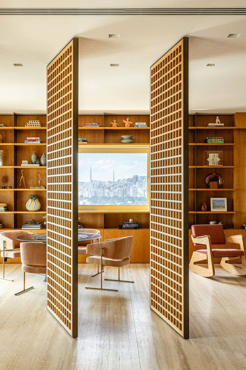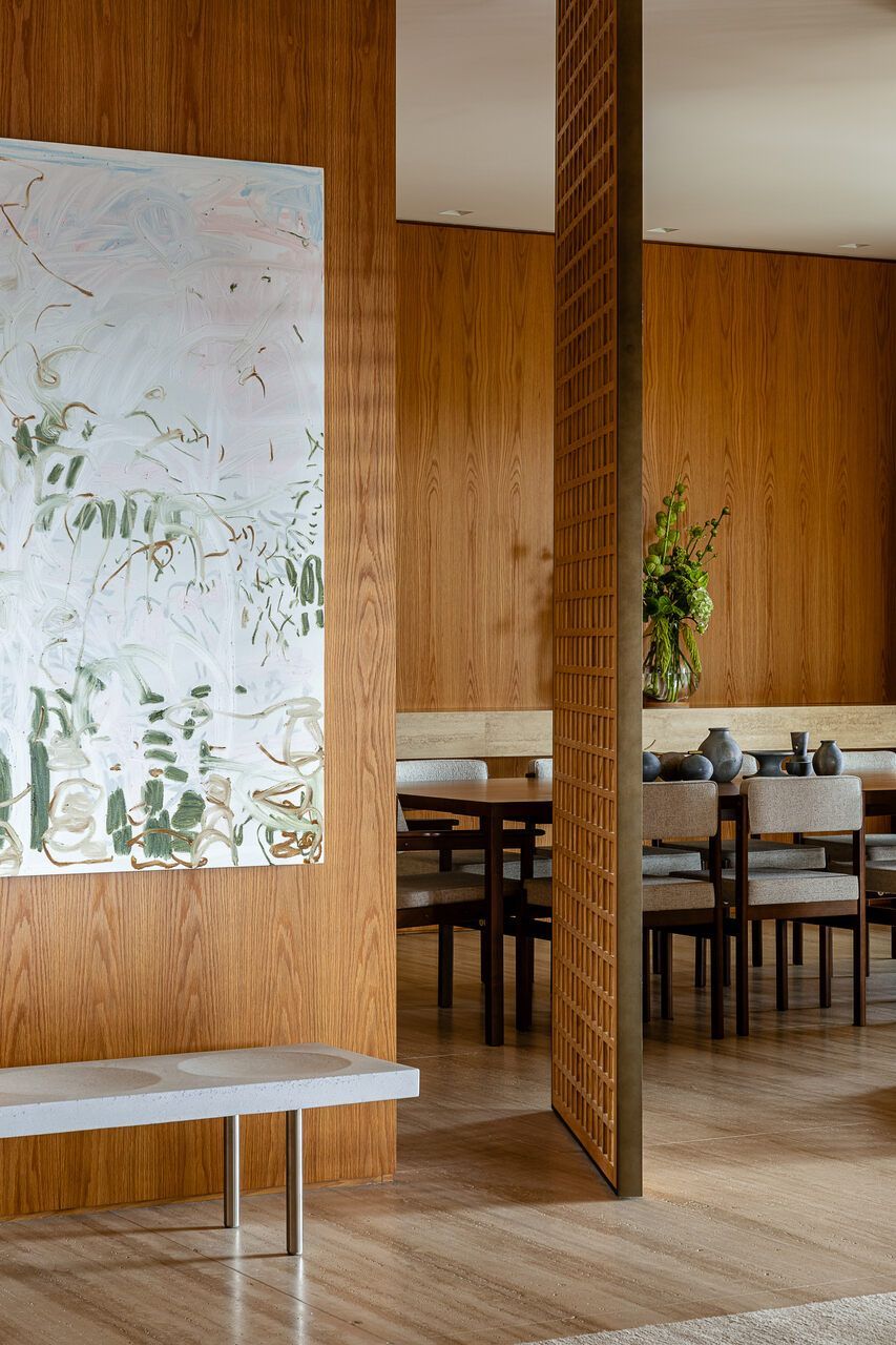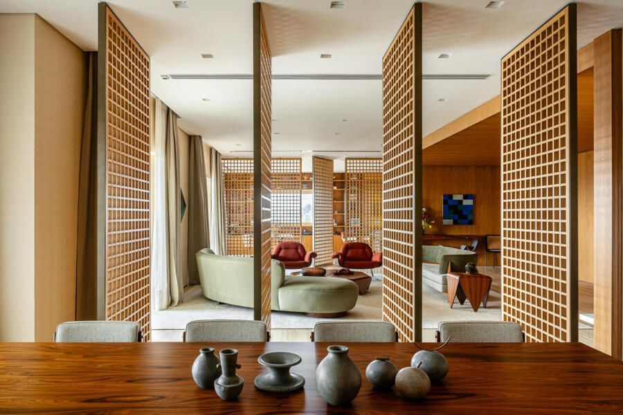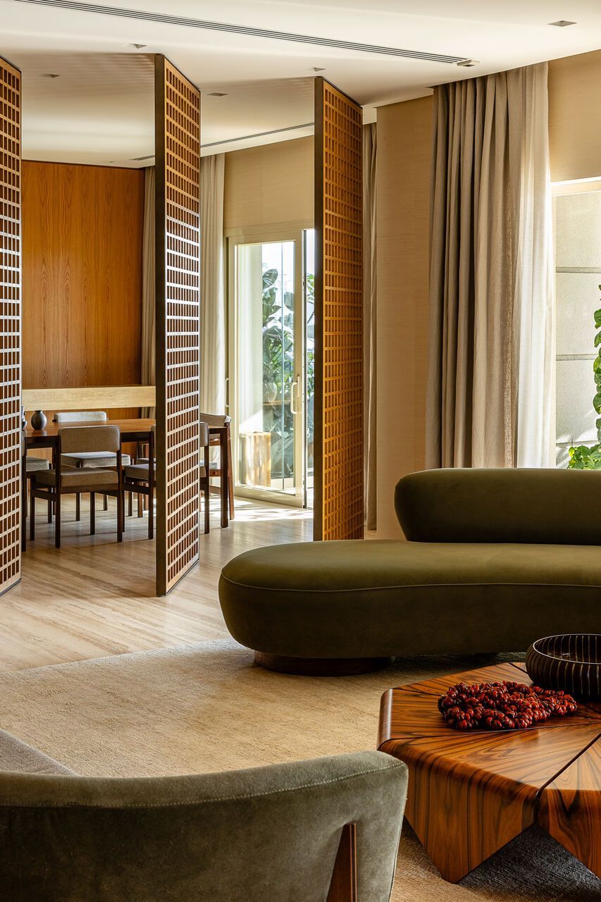 A principal delas são os painéis de madeira pivotantes que articulam os espaços com elegância e fluidez. Quando fechados, definem limites visuais e criam uma atmosfera mais intimista. Quando abertos, dissolvem as barreiras espaciais e ampliam a percepção do ambiente, oferecendo uma sensação de continuidade e abertura.