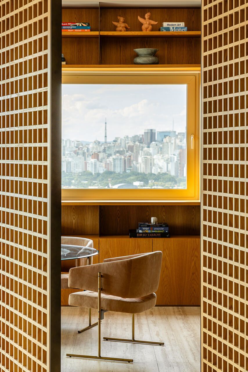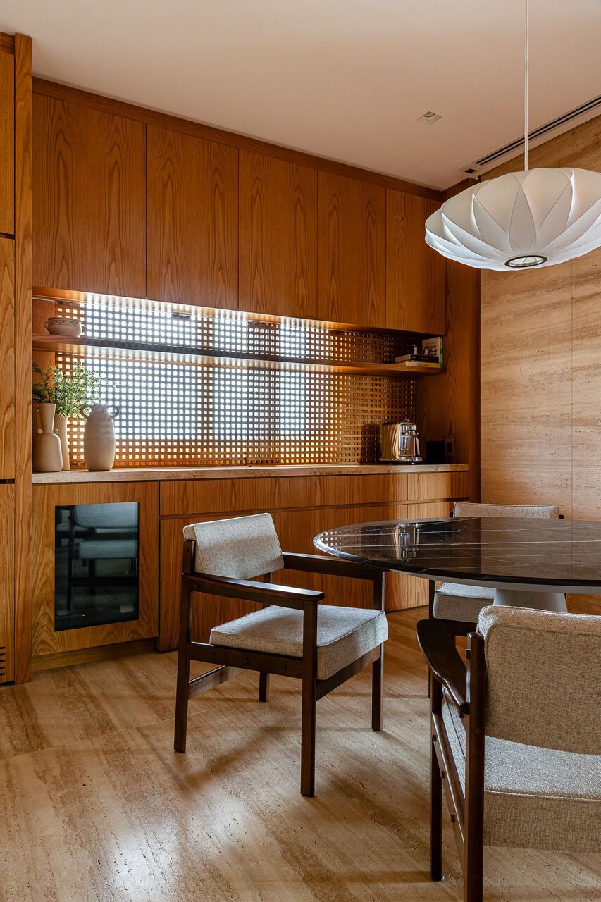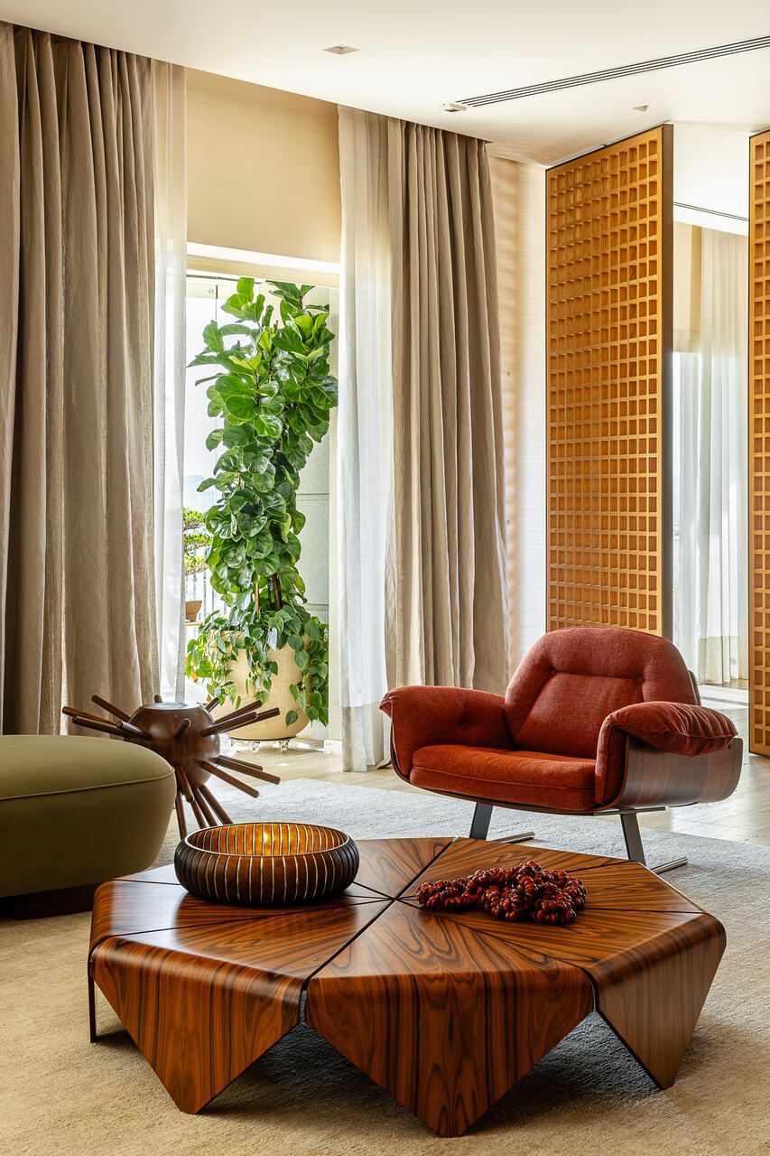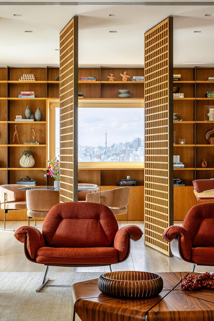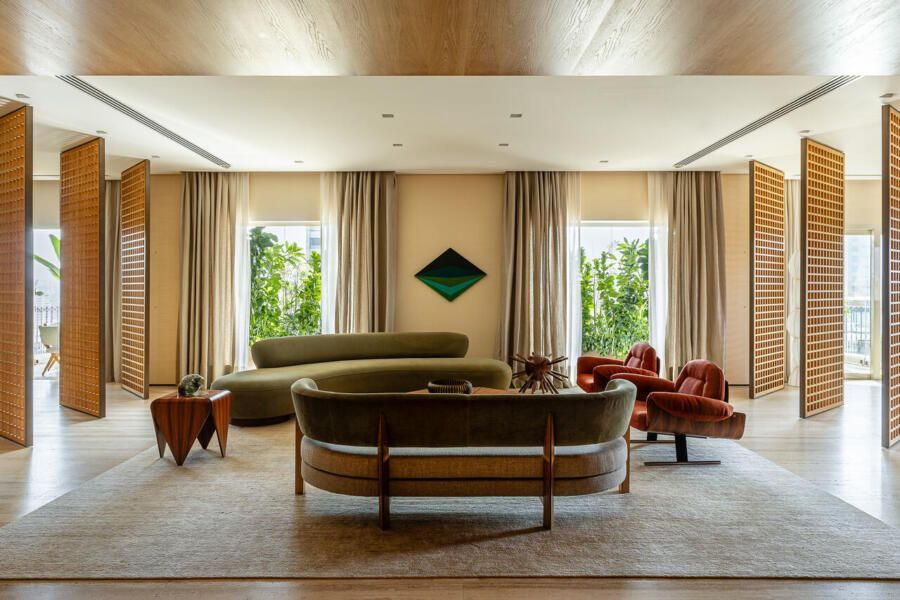 A principal delas são os painéis de madeira pivotantes que articulam os espaços com elegância e fluidez. Quando fechados, definem limites visuais e criam uma atmosfera mais intimista. Quando abertos, dissolvem as barreiras espaciais e ampliam a percepção do ambiente, oferecendo uma sensação de continuidade e abertura.