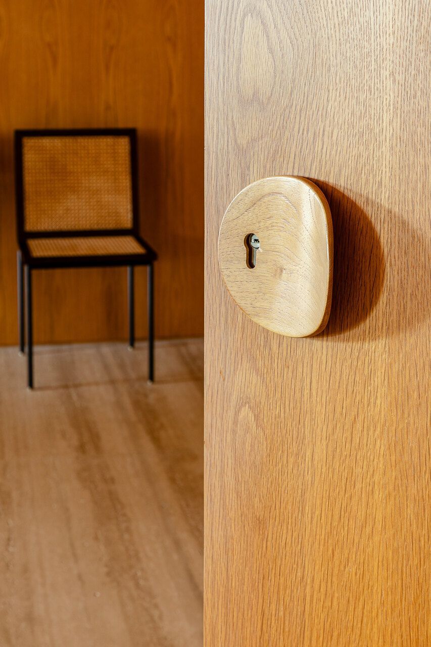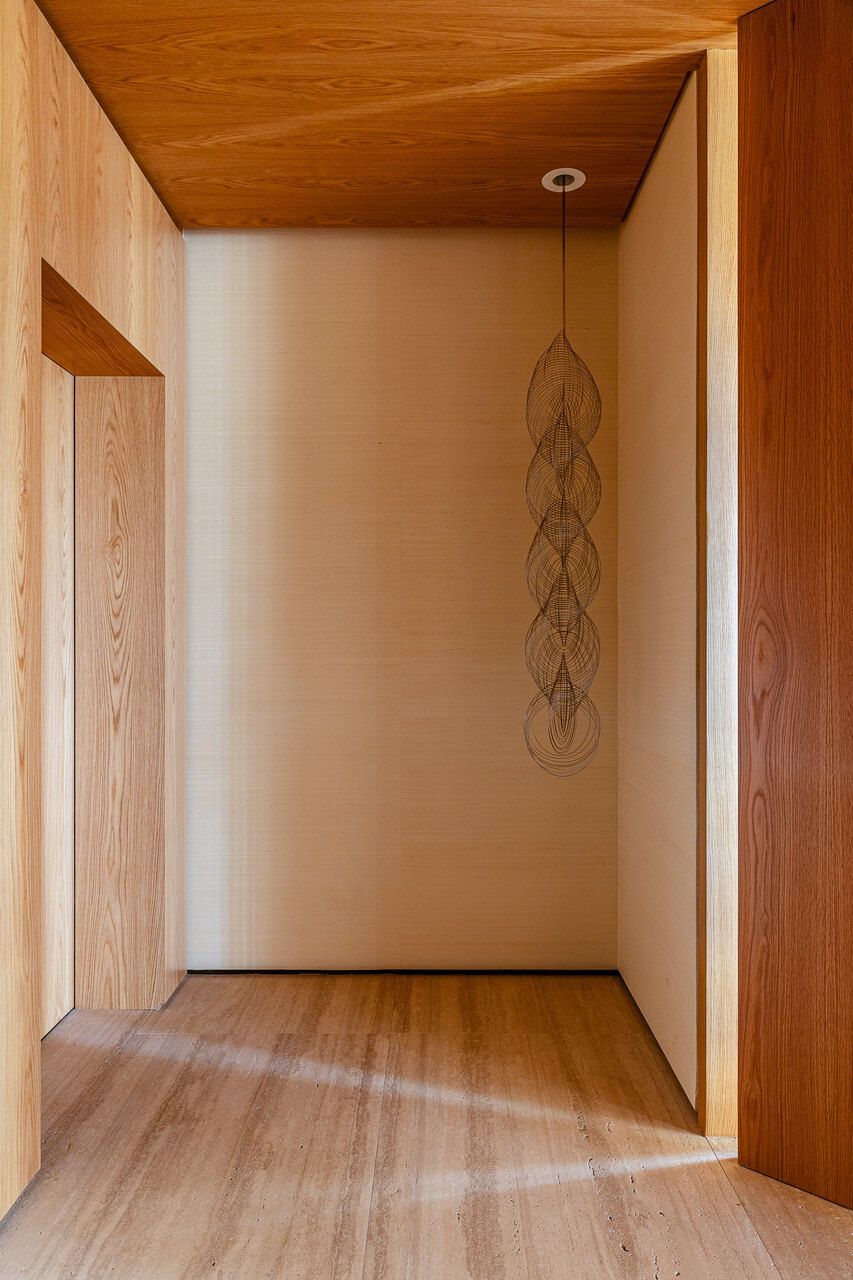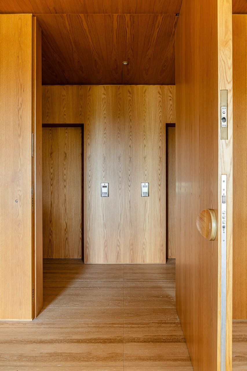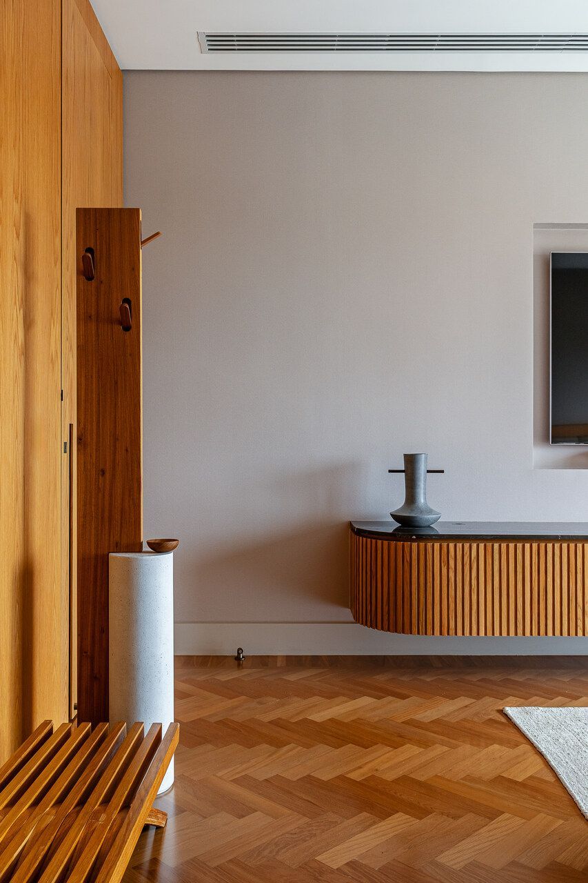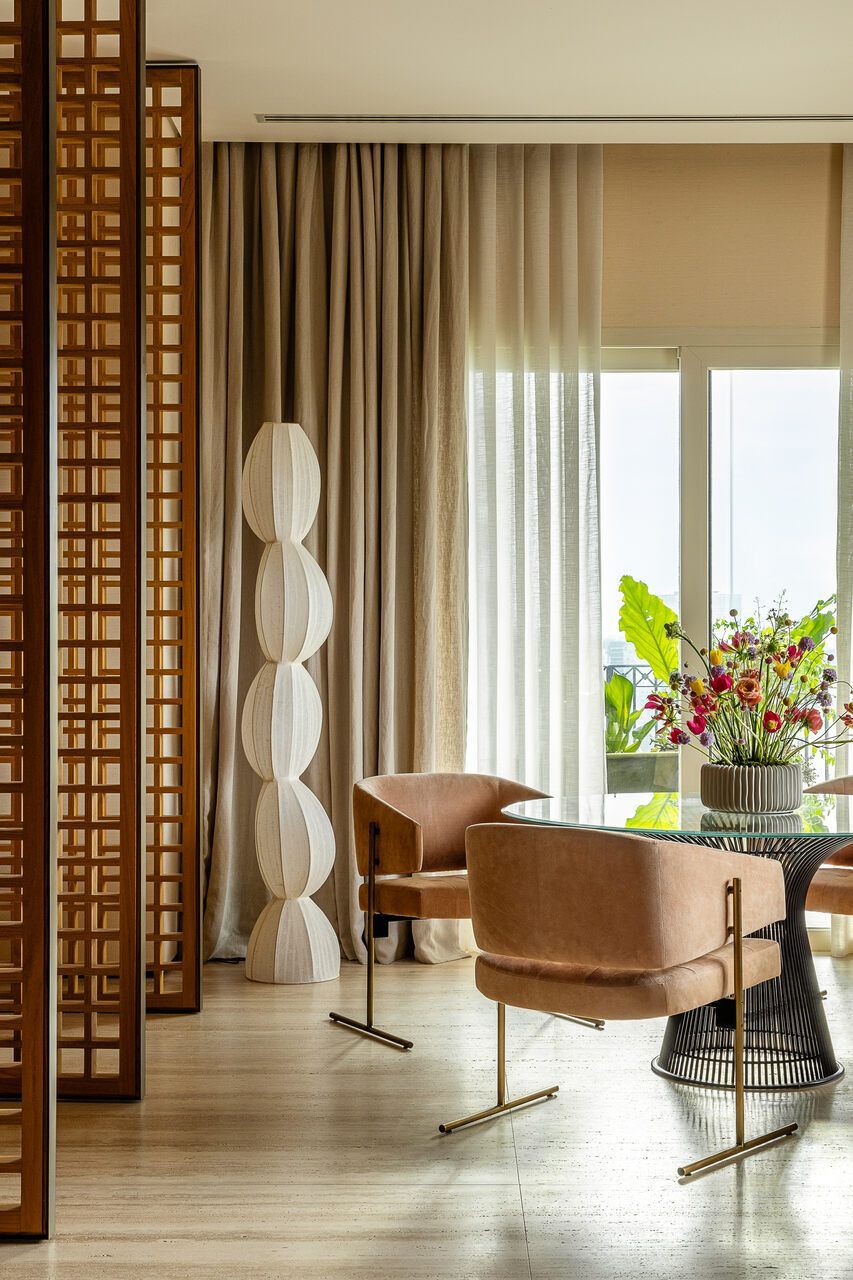 A principal delas são os painéis de madeira pivotantes que articulam os espaços com elegância e fluidez. Quando fechados, definem limites visuais e criam uma atmosfera mais intimista. Quando abertos, dissolvem as barreiras espaciais e ampliam a percepção do ambiente, oferecendo uma sensação de continuidade e abertura.