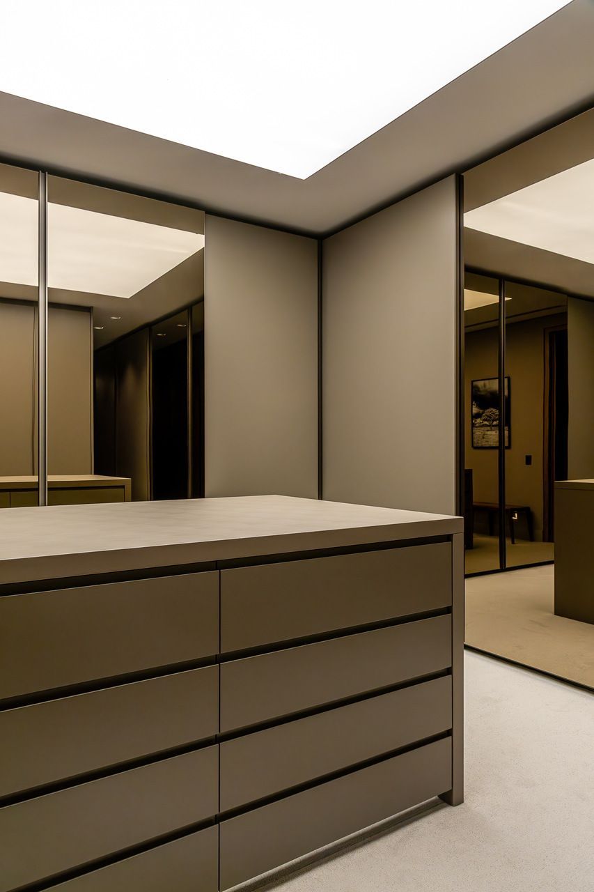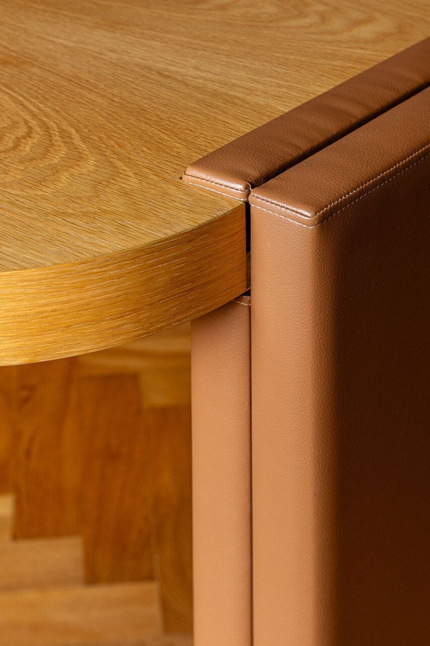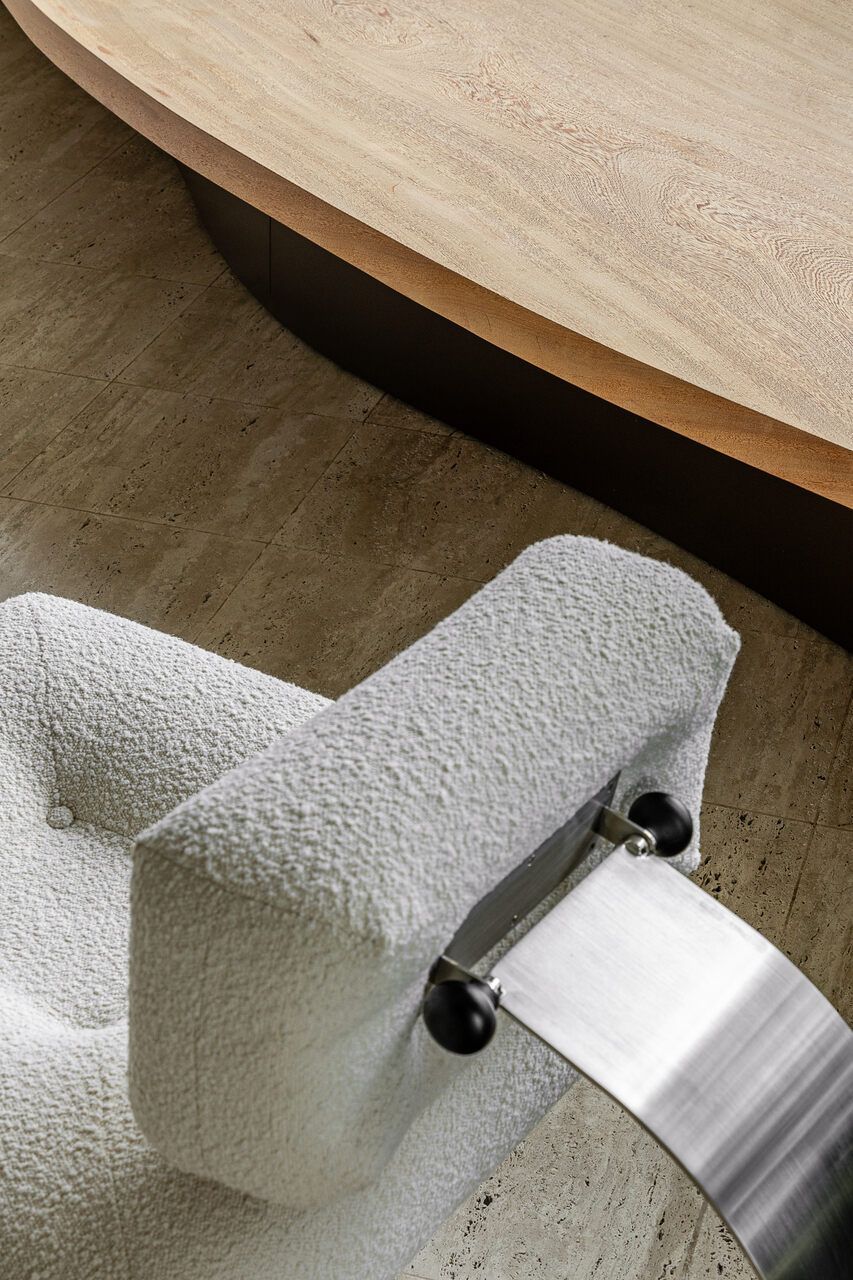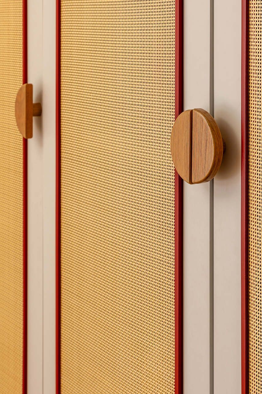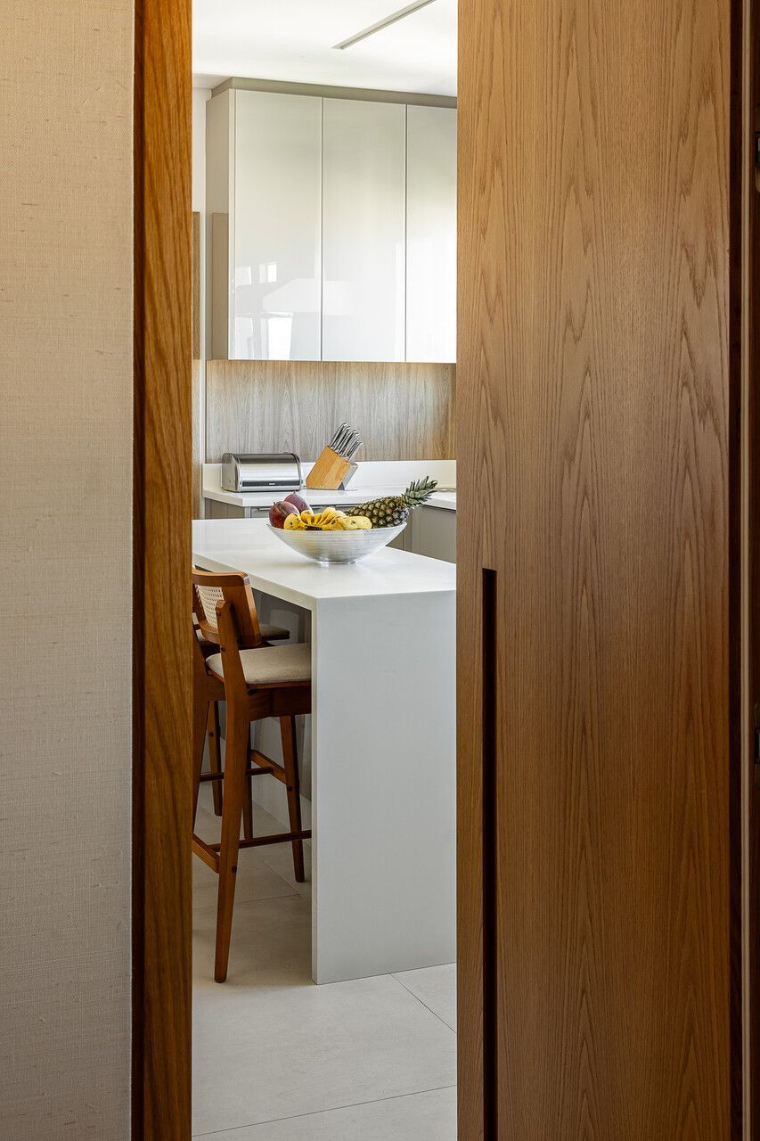 A principal delas são os painéis de madeira pivotantes que articulam os espaços com elegância e fluidez. Quando fechados, definem limites visuais e criam uma atmosfera mais intimista. Quando abertos, dissolvem as barreiras espaciais e ampliam a percepção do ambiente, oferecendo uma sensação de continuidade e abertura.