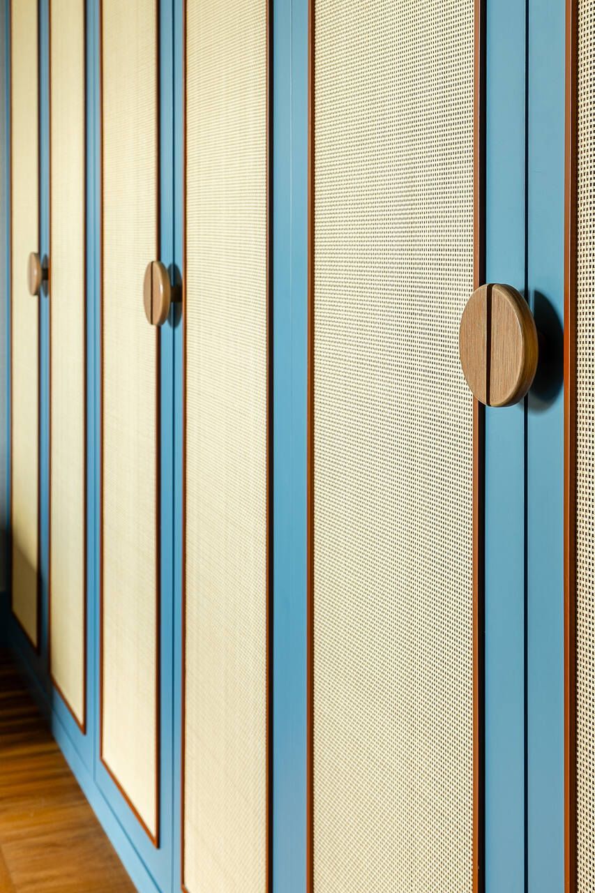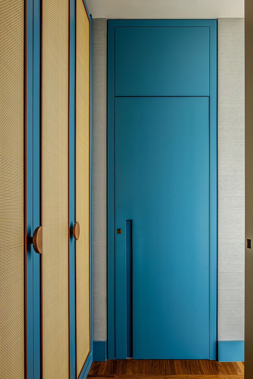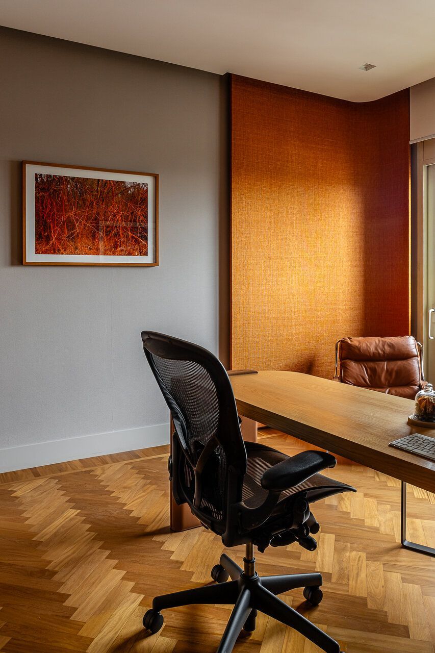 Na área íntima, o piso original em espinha de peixe dos quartos foi mantido, valorizando a madeira e reforçando a elegância atemporal do projeto. No dormitório principal, a vista deslumbrante da cidade também pode ser apreciada e ganha protagonismo. Já o quarto infantil e a brinquedoteca trazem cor ao apê, sem perder de vista a funcionalidade e o diálogo com o restante do lar, integrando-se à rotina da família.