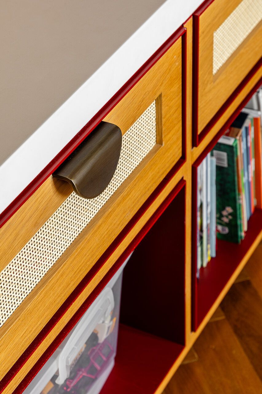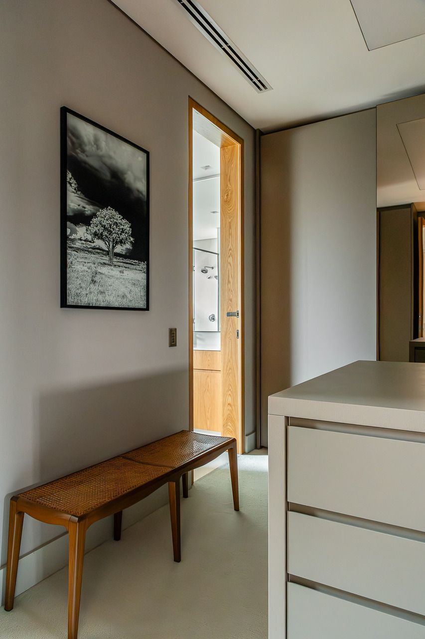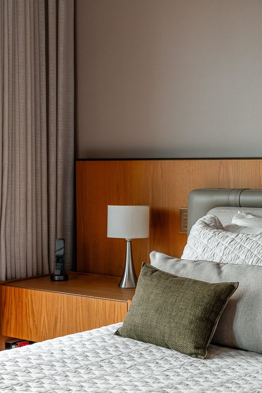 Na área íntima, o piso original em espinha de peixe dos quartos foi mantido, valorizando a madeira e reforçando a elegância atemporal do projeto. No dormitório principal, a vista deslumbrante da cidade também pode ser apreciada e ganha protagonismo. Já o quarto infantil e a brinquedoteca trazem cor ao apê, sem perder de vista a funcionalidade e o diálogo com o restante do lar, integrando-se à rotina da família.