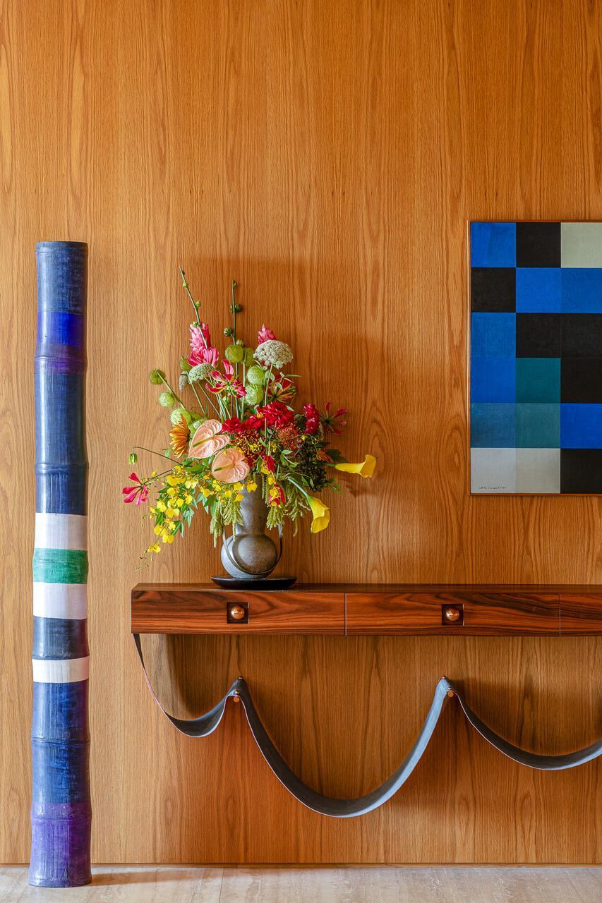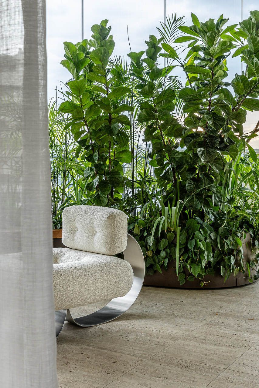 Outro ponto de destaque do projeto é a varanda, um espaço dedicado ao respiro e onde o verde é preponderante. Voltada para o pôr-do-sol, ela precisava filtrar o calor da tarde e garantir privacidade em relação ao prédio vizinho. Para isso, uma estrutura de jardineiras de oito metros de comprimento foi desenhada pelo Studio MEMM, recebendo o paisagismo assinado por Bia Abreu.