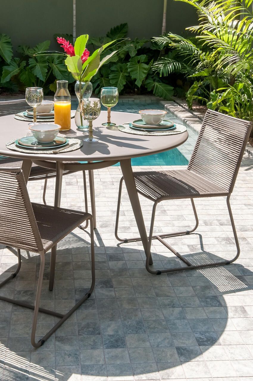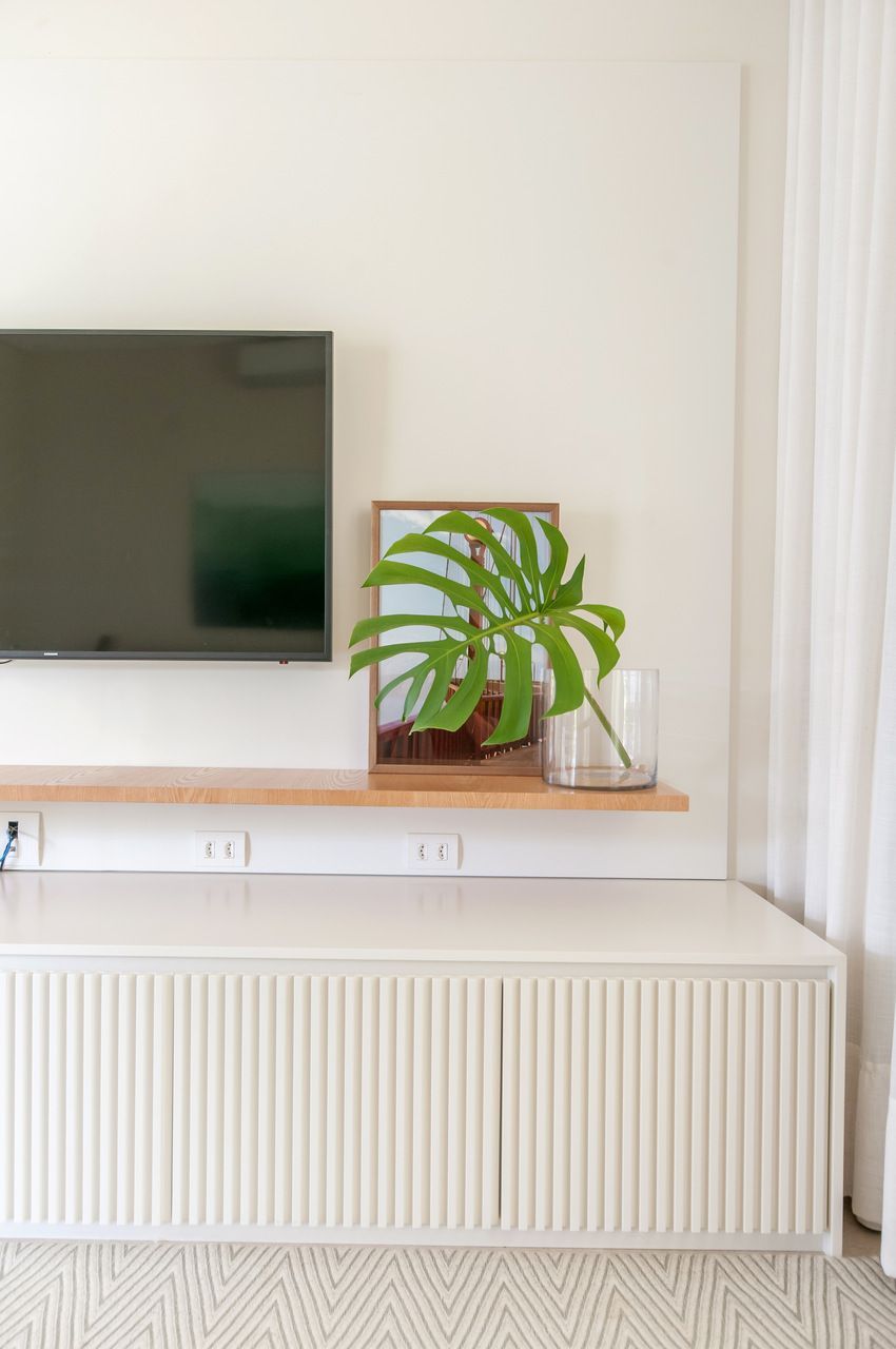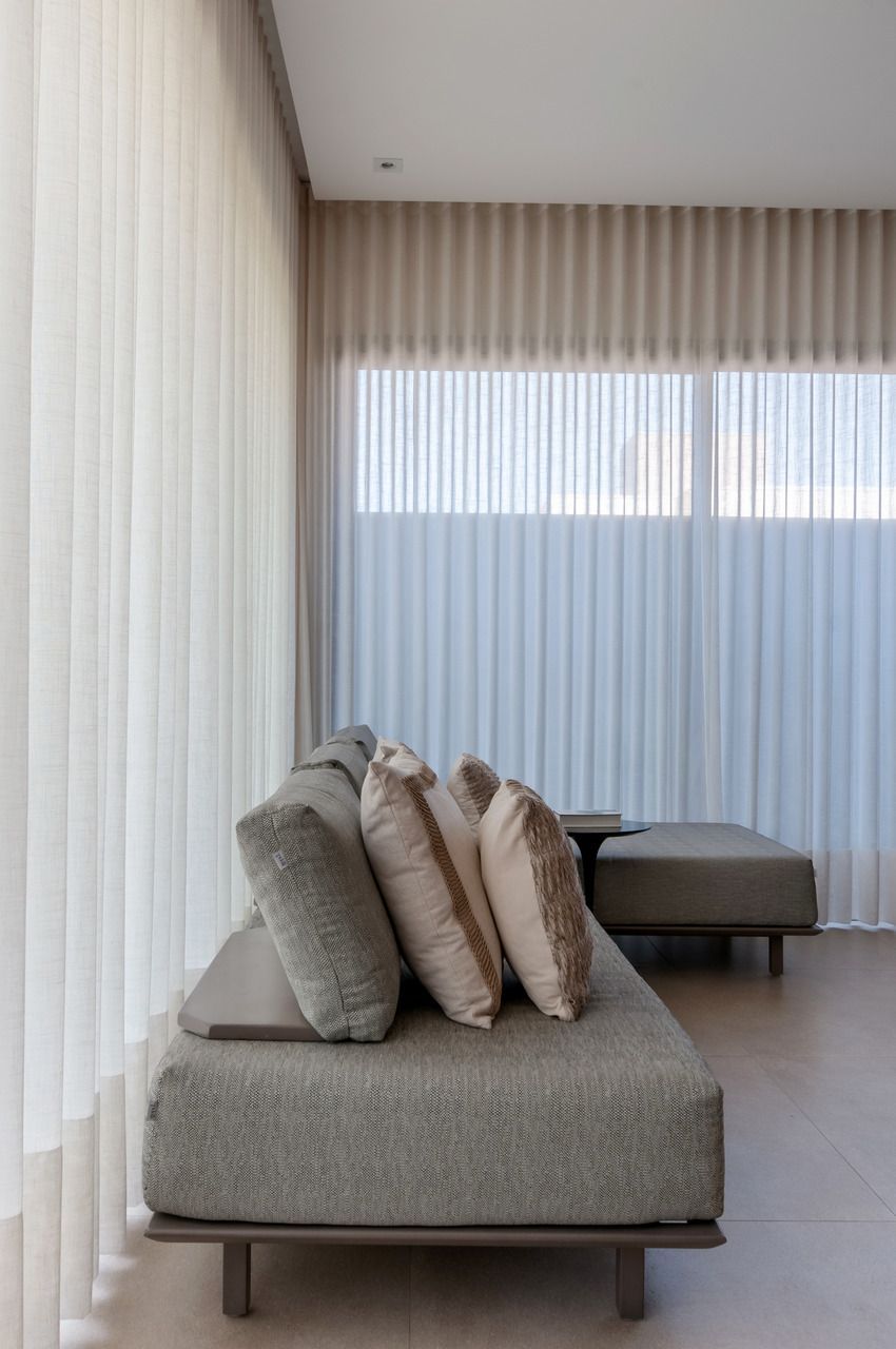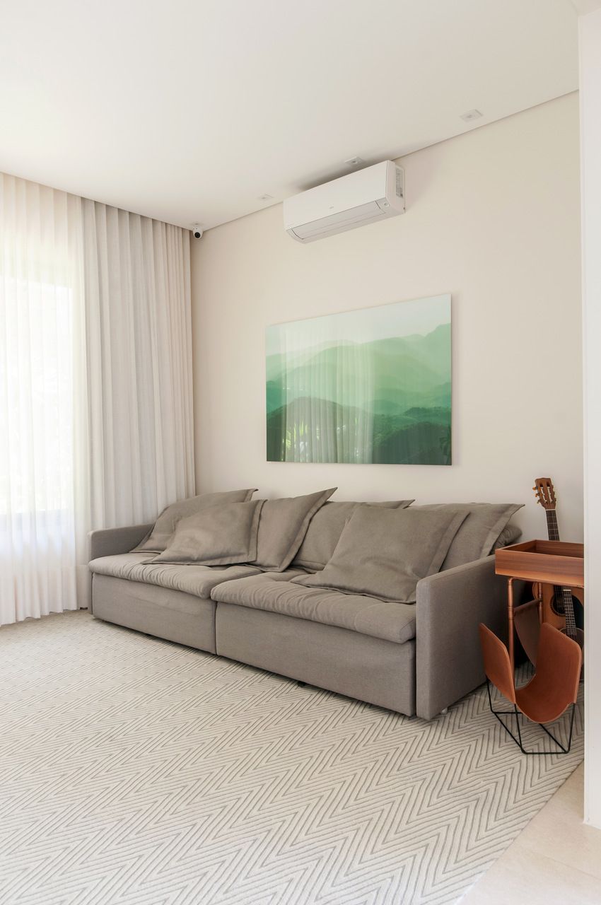 Além do living, uma sala de TV foi pensada para aconchegar muito bem as noites de filme. Apesar de também ser integrada com a área gourmet, uma porta com esquadria de alumínio pode ser acionada para deixar tudo mais privativo.