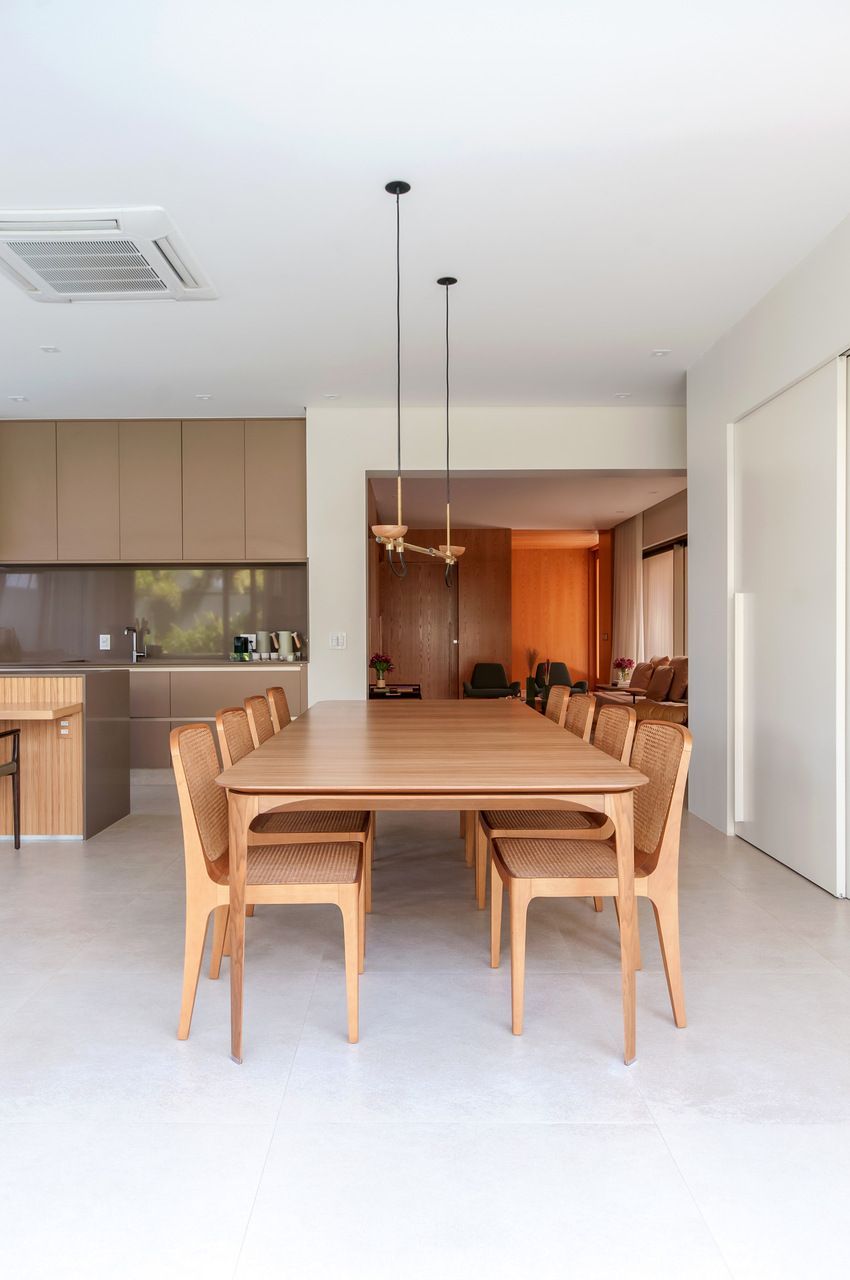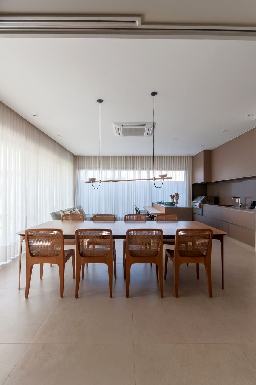 Com 389m², o intuito principal do projeto foi a máxima interação possível entre salas e varanda gourmet, que acabou se tornando o coração da casa. O living é integrado com a cozinha e dividido por um painel de madeira com porta mimetizada, bastante próximo à área gourmet, criando uma área contemporânea e elegante.