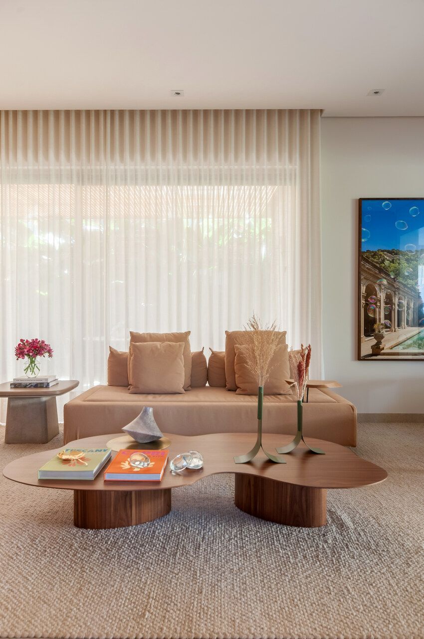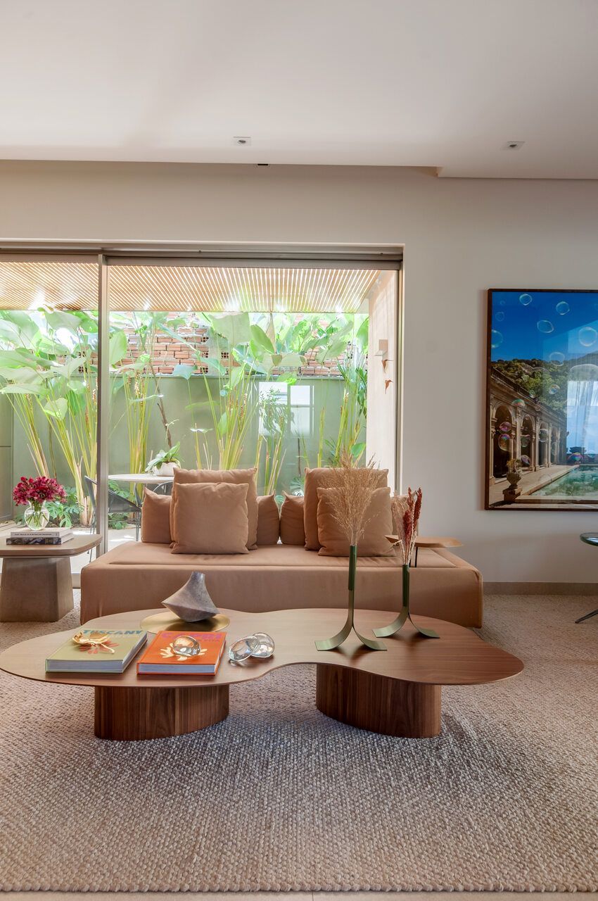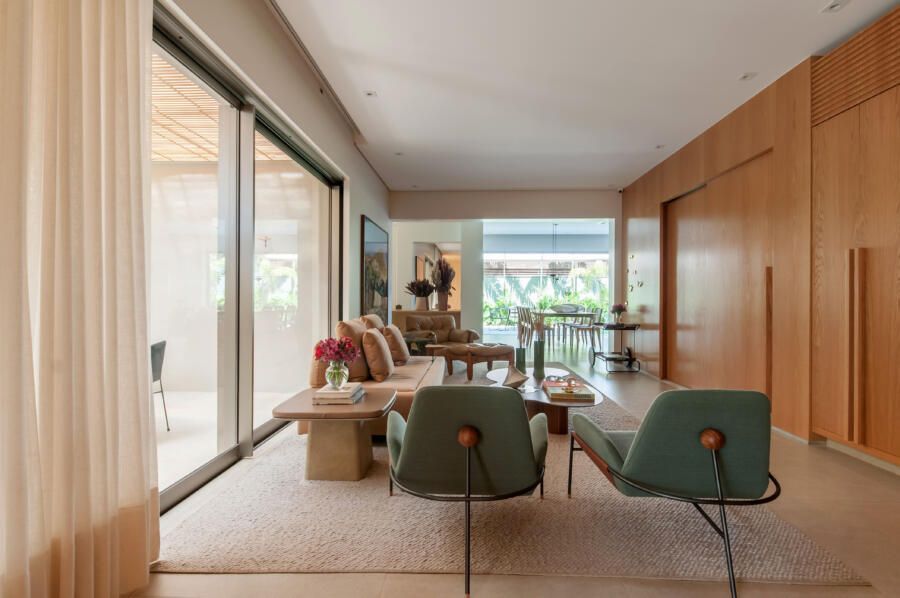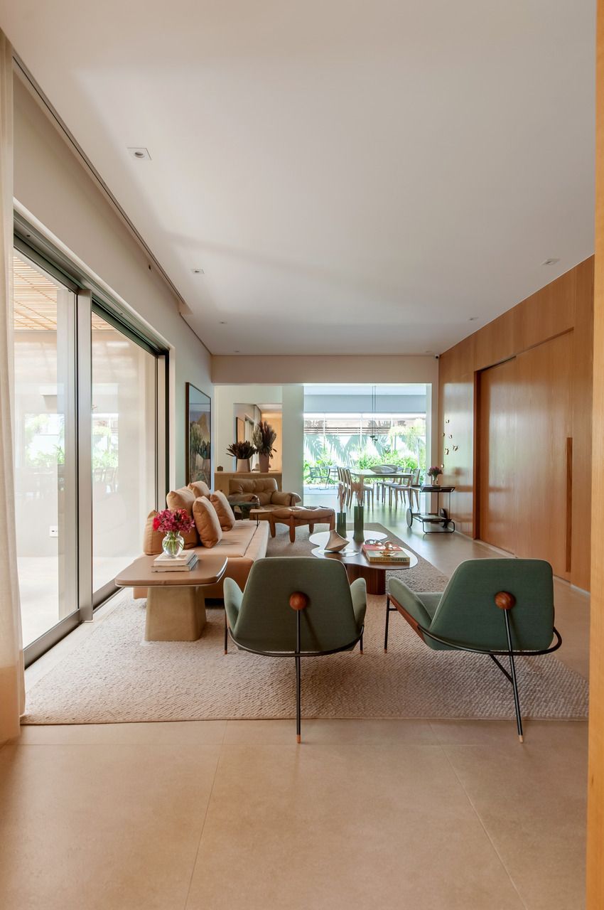 Como não há barreiras visuais nos ambientes contínuos, como as salas, cabe aos tapetes e móveis cumprirem o papel de delimitar as áreas. Encontramos peças brasileiras convivendo harmoniosamente: sofá sem braços, acompanhado da mesa de centro da Jacqueline Terpins. À esquerda, poltronas verdes, e à direita, Poltrona Mole de Sergio Rodrigues. Ao fundo, uma fotografia de Flávia Junqueira.