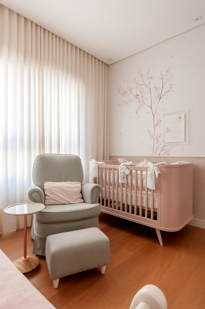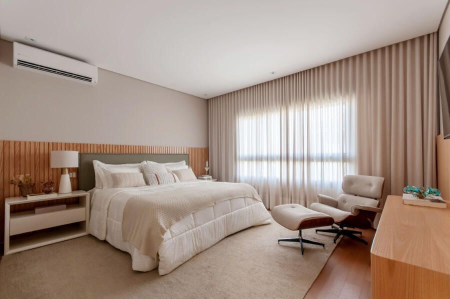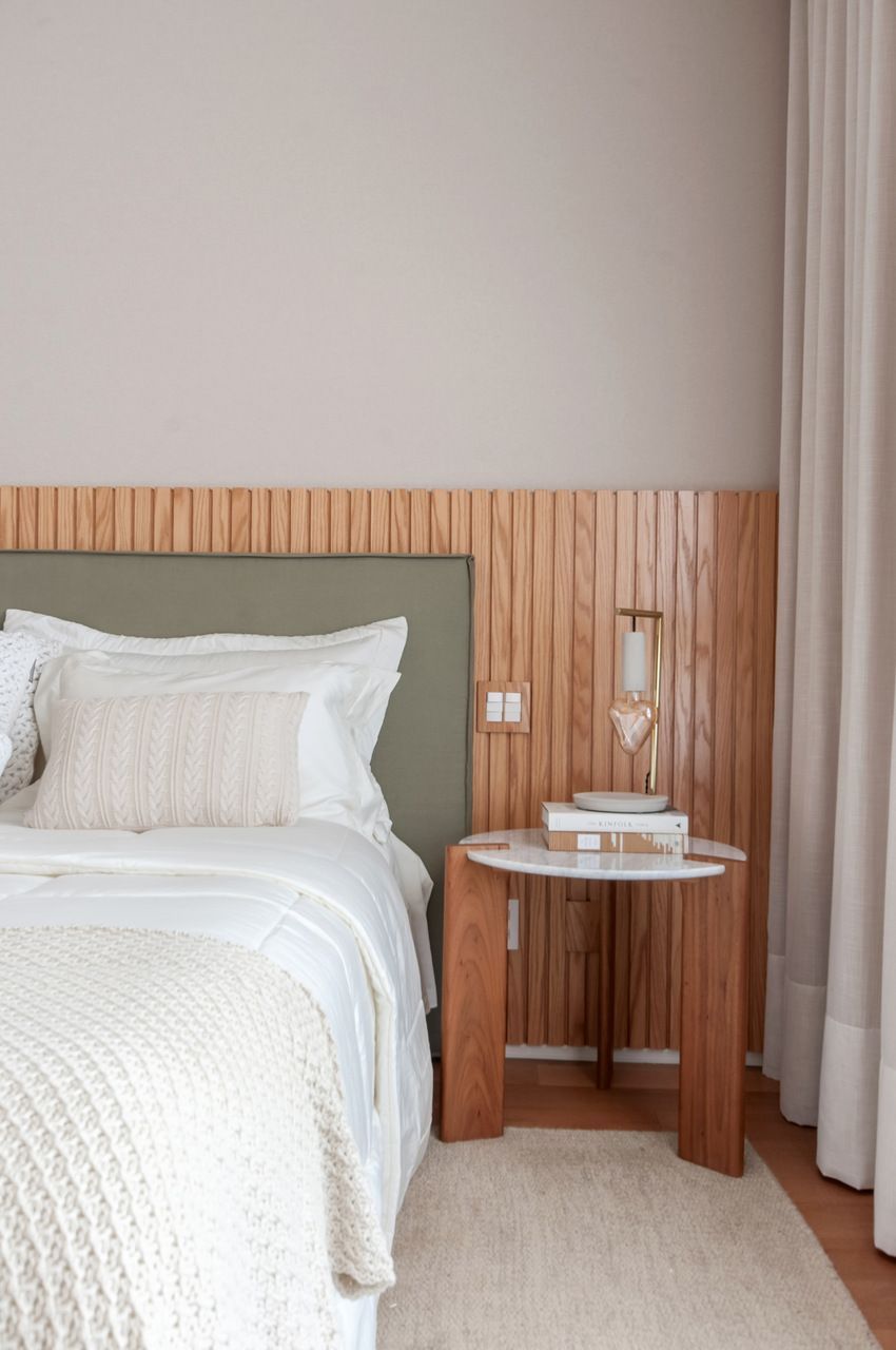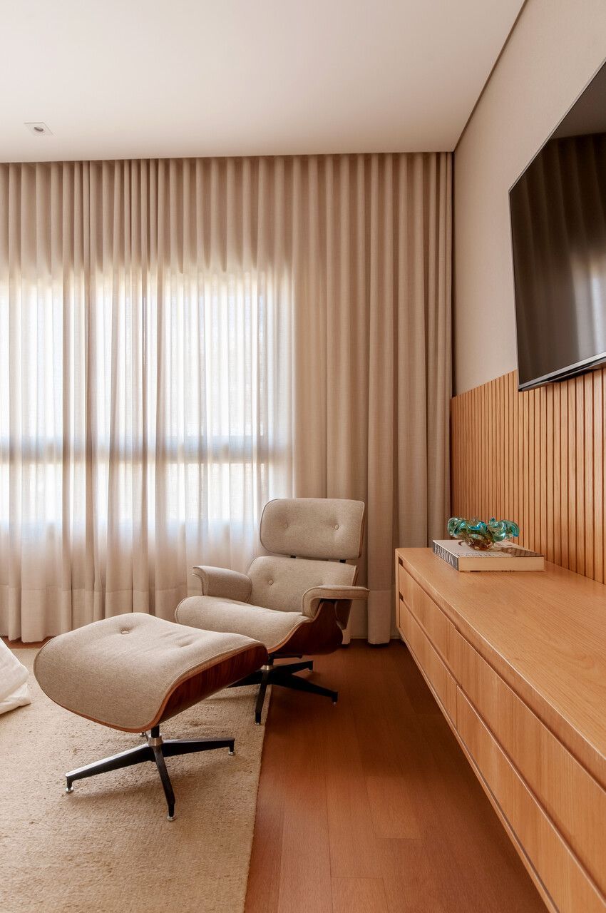 Já no quarto de casal, um painel de madeira ripada atua como base para a cabeceira estofada em linho verde, deixando tudo muito aconchegante. Nos detalhes, o tapete veste o ambiente por inteiro e a poltrona Charles Eames se coloca como um verdadeiro charme.