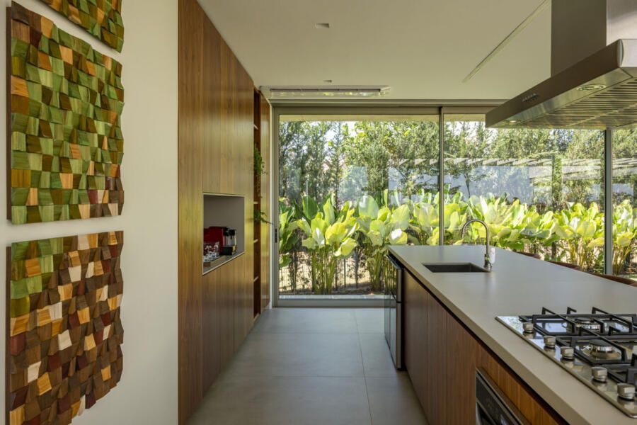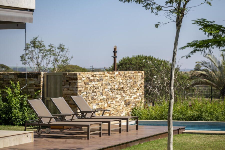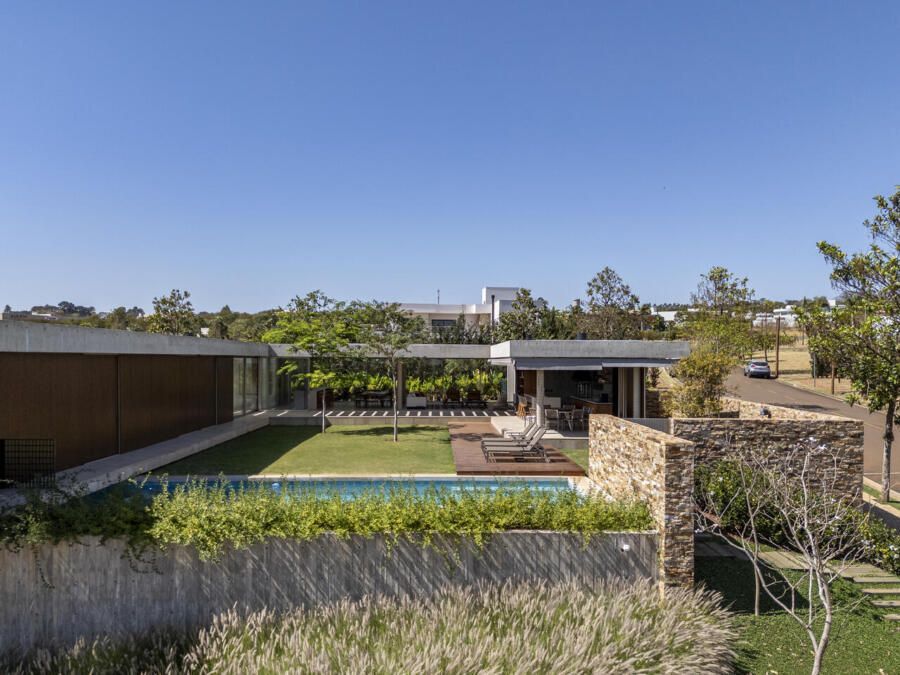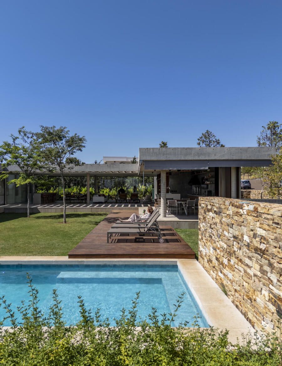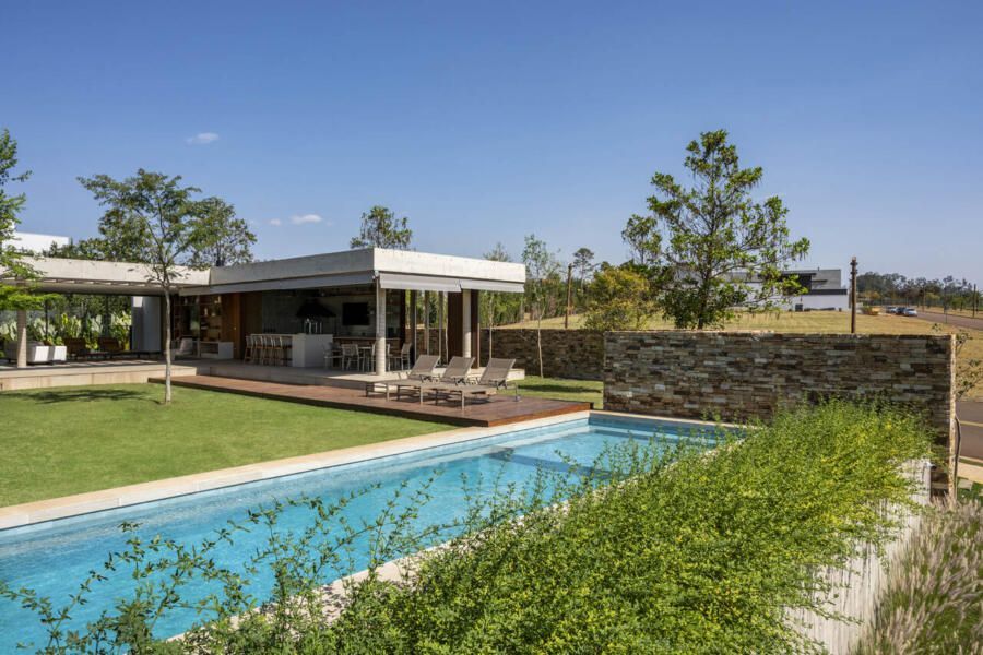 Essa integração se revela desde a chegada: portas de vidro generosas permitem que os ambientes sociais se conectem de forma contínua, costurando cozinha, jantar, living, área gourmet e piscina em um único gesto arquitetônico. A piscina, aliás, ganhou um lugar inusitado na fachada frontal, garantindo resguardo aos moradores e capturando o pôr do sol mais bonito do condomínio. À sua volta, o paisagismo, desenvolvido em diálogo direto com a arquitetura, envolve os espaços sociais com textura, sombra e frescor.