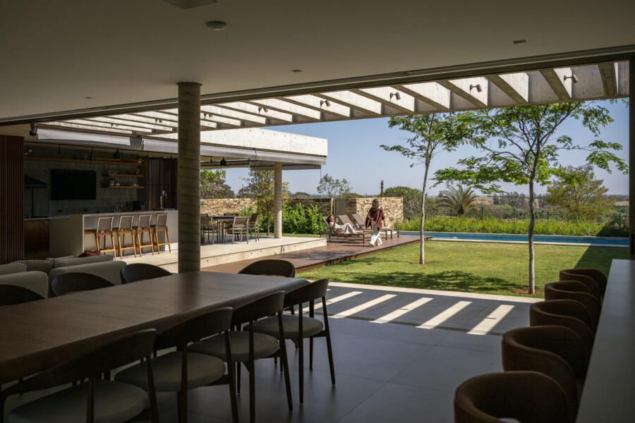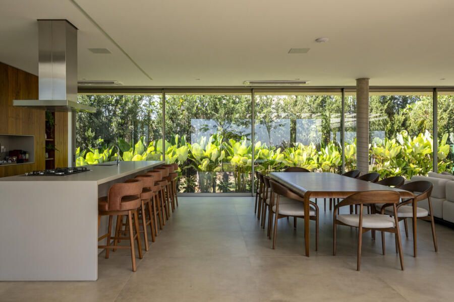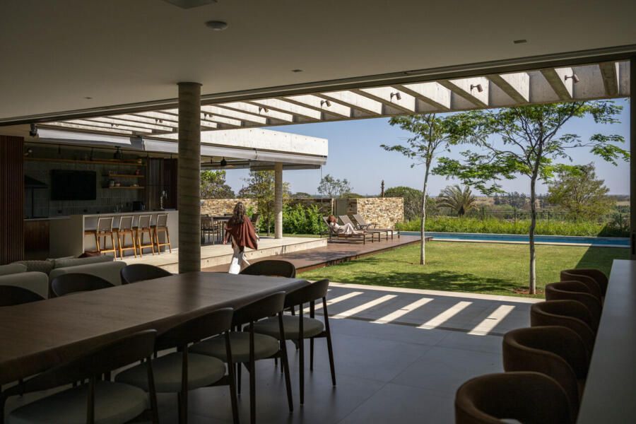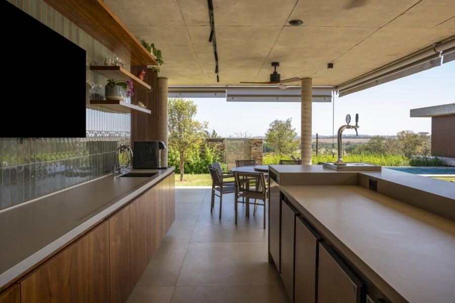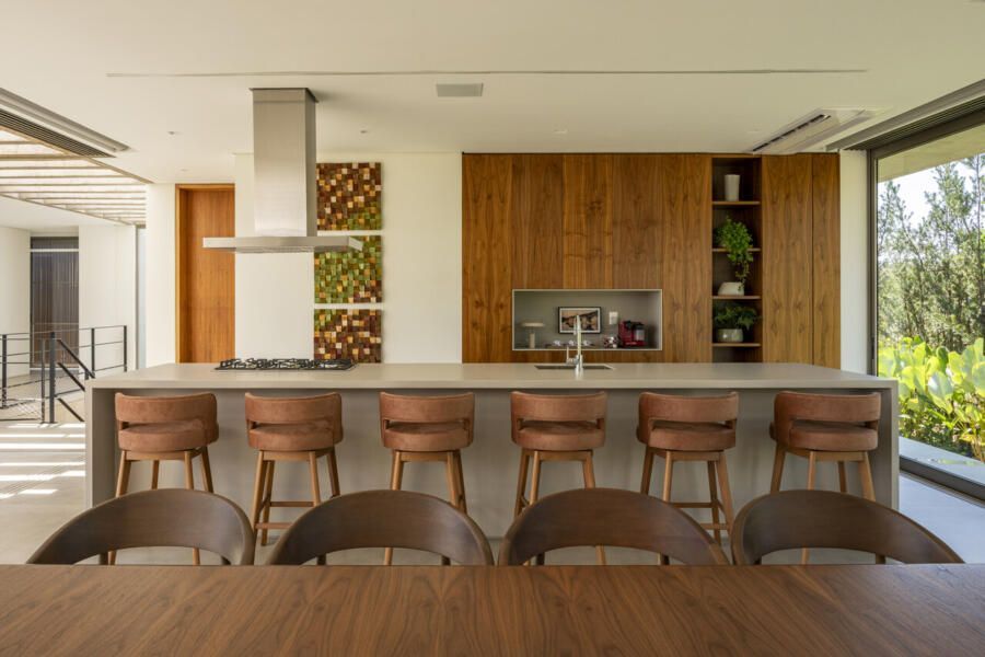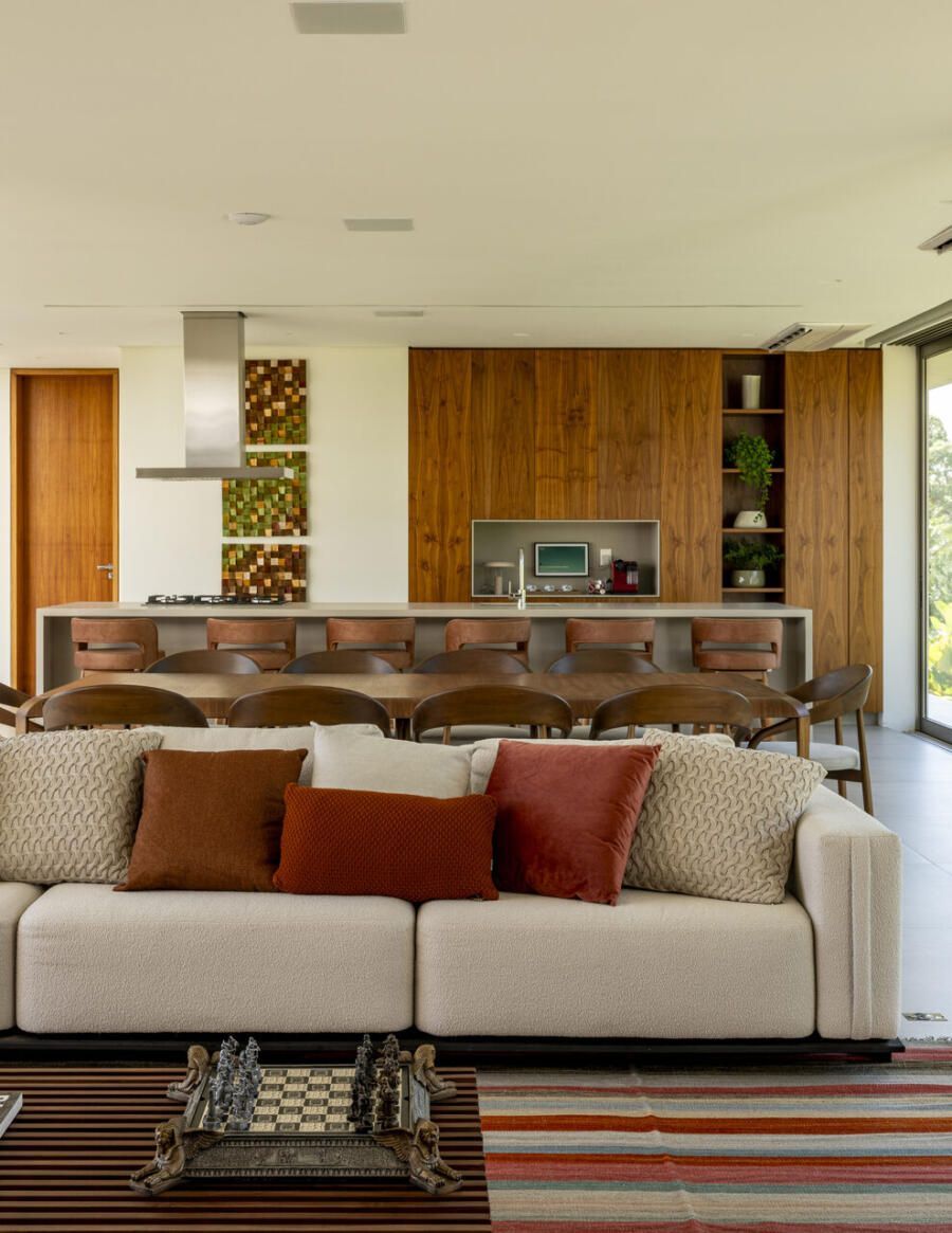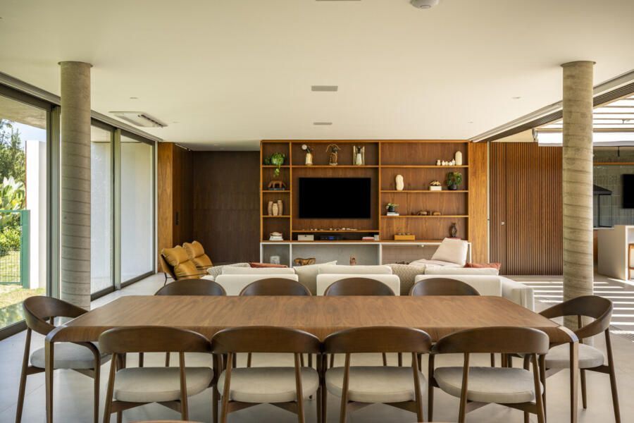 “Como o casal adora receber amigos nos finais de semana, o desejo principal era uma casa com ambientes amplos, acolhedores e totalmente conectados. A proposta previa a integração entre cozinha, sala de jantar e living, criando um espaço contínuo que se estendesse naturalmente até a área gourmet e piscina. Essa conexão foi alcançada por meio de uma planta em formato de “U” e pelo uso de amplas portas de vidro, que permitem unir ou separar os ambientes conforme a necessidade, trazendo versatilidade ao cotidiano.”