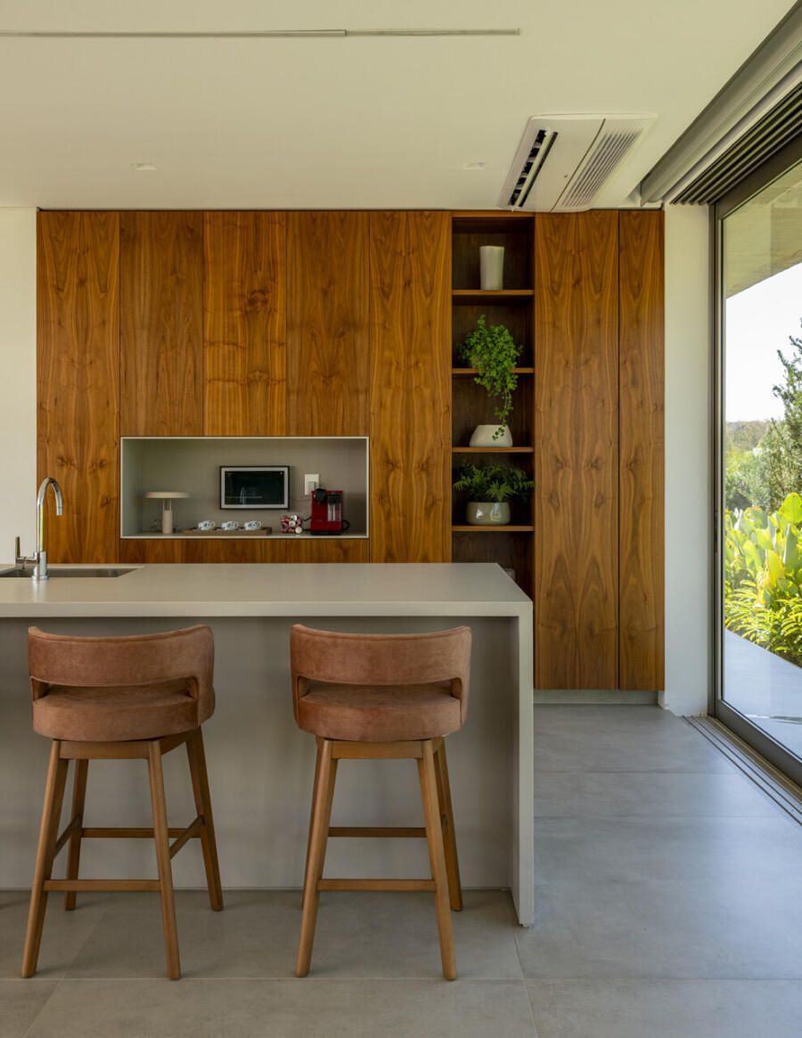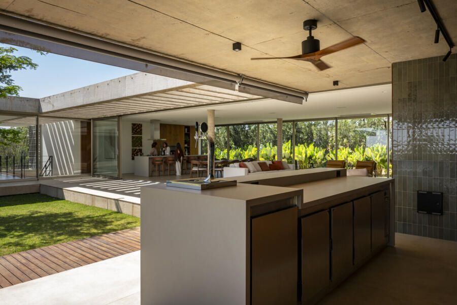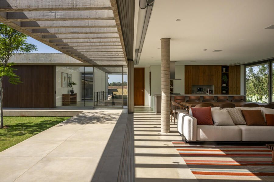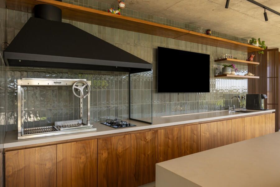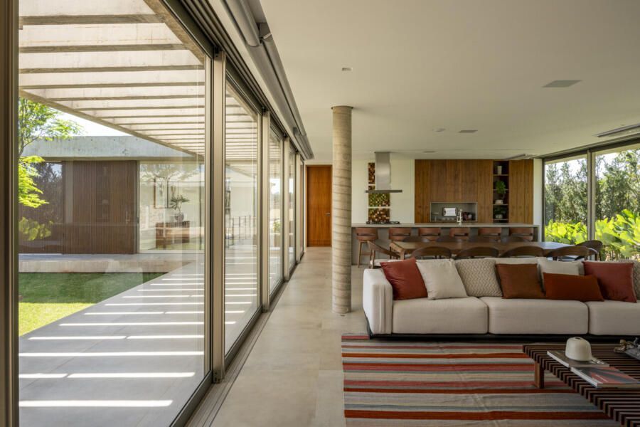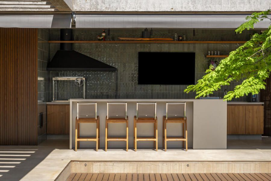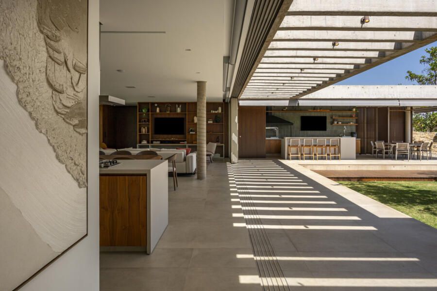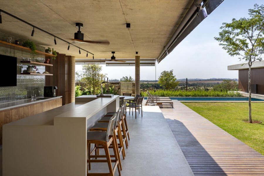 “Como o casal adora receber amigos nos finais de semana, o desejo principal era uma casa com ambientes amplos, acolhedores e totalmente conectados. A proposta previa a integração entre cozinha, sala de jantar e living, criando um espaço contínuo que se estendesse naturalmente até a área gourmet e piscina. Essa conexão foi alcançada por meio de uma planta em formato de “U” e pelo uso de amplas portas de vidro, que permitem unir ou separar os ambientes conforme a necessidade, trazendo versatilidade ao cotidiano.”